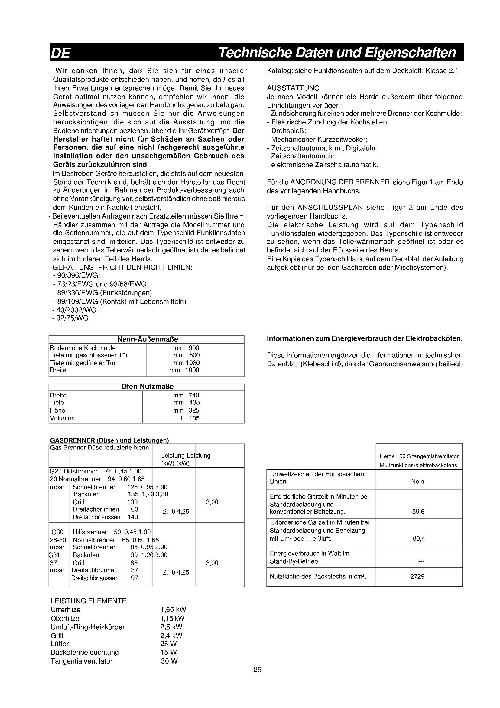Technische Daten und Eigenschaften - Wir danken Ihnen, daß Sie sich für eines unserer Qualitätsprodukte entschieden haben, und hoffen, daß es all Ihren Erwartungen entsprechen möge. Damit Sie Ihr neues Gerät optimal nutzen können, empfehlen wir Ihnen, die Anweisungen des vorliegenden Handbuchs genau zu befolgen. Selbstverständlich müssen Sie nur die Anweisungen berücksichtigen, die sich auf die Ausstattung und die Bedieneinrichtungen beziehen, über die Ihr Gerät verfügt. Der Hersteller haftet nicht für Schäden an Sachen oder Personen, die auf eine nicht fachgerecht ausgeführte Installation oder den unsachgemäßen Gebrauch des Geräts zurückzuführen sind. - Im Bestreben Geräte herzustellen, die stets auf dem neuesten Stand der Technik sind, behält sich der Hersteller das Recht zu Änderungen im Rahmen der Produkt-verbesserung auch ohne Vorankündigung vor, selbstverständlich ohne daß hieraus dem Kunden ein Nachteil entsteht. - Bei eventuellen Anfragen nach Ersatzteilen müssen Sie Ihrem Händler zusammen mit der Anfrage die Modellnummer und die Seriennummer, die auf dem Typenschild Funktionsdaten eingestanzt sind, mitteilen. Das Typenschild ist entweder zu sehen, wenn das Tellerwärmerfach geöffnet ist oder es befindet sich im hinteren Teil des Herds. - GERÄT ENSTPRICHT DEN RICHT-LINIEN: - 90/396/EWG; - 73/23/EWG und 93/68/EWG; - 89/336/EWG (Funkstörungen) - 89/109/EWG (Kontakt mit Lebensmitteln) - 40/2002/WG - 92/75/WG GASBRENNER (Düsen und Leistungen) Gas Brenner Düse reduzierte Nenn- Leistung Leistung (kW) (kW) G20 Hilfsbrenner 76 0,45 1,00 20 Normalbrenner 94 0,60 1,65 mbar Schnellbrenner 128 0,95 2,90 Backofen 135 1,20 3,30 Grill 130 3,00 Dreifachbr.innen 63 2,10 4,25 Dreifachbr.aussen 140 G30 Hilfsbrenner 50 0,45 1,00 28-30 Normalbrenner 65 0,60 1,65 mbar Schnellbrenner 85 0,95 2,90 G31 Backofen 90 1,20 3,30 37 Grill 86 3,00 mbar Dreifachbr.innen 37 2,10 4,25 Dreifachbr.aussen 97 LEISTUNG ELEMENTE Unterhitze 1,65 kW Oberhitze 1,15 kW Umluft-Ring-Heizkörper 2,5 kW Grill 2,4 kW Lüfter 25 W Backofenbeleuchtung 15 W Tangentialventilator 30 W Ofen-Nutzmaße Breite mm 740 Tiefe mm 435 Höhe mm 325 Volumen L 105 Nenn-Außenmaße Bodenhöhe Kochmulde mm 900 Tiefe mit geschlossener Tür mm 600 Tiefe mit geöffneter Tür mm 1060 Breite mm 1000 Katalog: siehe Funktionsdaten auf dem Deckblatt; Klasse 2.1 AUSSTATTUNG Je nach Modell können die Herde außerdem über folgende Einrichtungen verfügen: - Zündsicherung für einen oder mehrere Brenner der Kochmulde; - Elektrische Zündung der Kochstellen; - Drehspieß; - Mechanischer Kurzzeitwecker; - Zeitschaltautomatik mit Digitaluhr; - Zeitschaltautomatik; - elektronische Zeitschaltautomatik. Für die ANORDNUNG DER BRENNER siehe Figur 1 am Ende des vorliegenden Handbuchs. Für den ANSCHLUSSPLAN siehe Figur 2 am Ende des vorliegenden Handbuchs. Die elektrische Leistung wird auf dem Typenschild Funktionsdaten wiedergegeben. Das Typenschild ist entweder zu sehen, wenn das Tellerwärmerfach geöffnet ist oder es befindet sich auf der Rückseite des Herds. Eine Kopie des Typenschilds ist auf dem Deckblatt der Anleitung aufgeklebt (nur bei den Gasherden oder Mischsystemen). Informationen zum Energieverbrauch der Elektrobacköfen. Diese Informationen ergänzen die Informationen im technischen Datenblatt (Klebeschild), das der Gebrauchsanweisung beiliegt