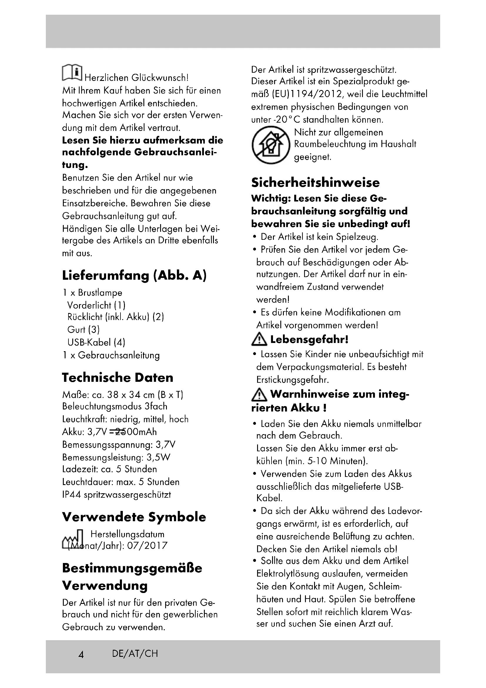 1a4 Herzlichen Glückwunsch! Mit Ihrem Kauf haben Sie sich für einen hochwertigen Artikel entschieden. Machen Sie sich vor der ersten Verwen- dung mit dem Artikel vertraut. Lesen Sie hierzu aufmerksam die nachfolgende Gebrauchsanlei- tung. Benutzen Sie den Artikel nur wie beschrieben und für die angegebenen Einsatzbereiche. Bewahren Sie diese Gebrauchsanleitung gut auf. Händigen Sie alle Unterlagen bei Wei- tergabe des Artikels an Dritte ebenfalls mit aus. Lieferumfang (Abb. A) 1 x Brustlampe Vorderlicht (1) Rücklicht (inkl. Akku) (2) Gurt (3) USB-Kabel (4) 1 x Gebrauchsanleitung Technische Daten Maße: ca. 38 x 34 cm (B x T) Beleuchtungsmodus 3fach Leuchtkraft: niedrig, mittel, hoch Akku: 3,7V 2500mAh Bemessungsspannung: 3,7V Bemessungsleistung: 3,5W Ladezeit: ca. 5 Stunden Leuchtdauer: max. 5 Stunden IP44 spritzwassergeschützt Verwendete Symbole Herstellungsdatum (Monat/Jahr): 07/2017 Bestimmungsgemäße Verwendung Der Artikel ist nur für den privaten Ge- brauch und nicht für den gewerblichen Gebrauch zu verwenden. Der Artikel ist spritzwassergeschützt. Dieser Artikel ist ein Spezialprodukt ge- mäß (EU)1194/2012, weil die Leuchtmittel extremen physischen Bedingungen von unter -20°C standhalten können. Nicht zur allgemeinen Raumbeleuchtung im Haushalt geeignet. Sicherheitshinweise Wichtig: Lesen Sie diese Ge- brauchsanleitung sorgfältig und bewahren Sie sie unbedingt auf!