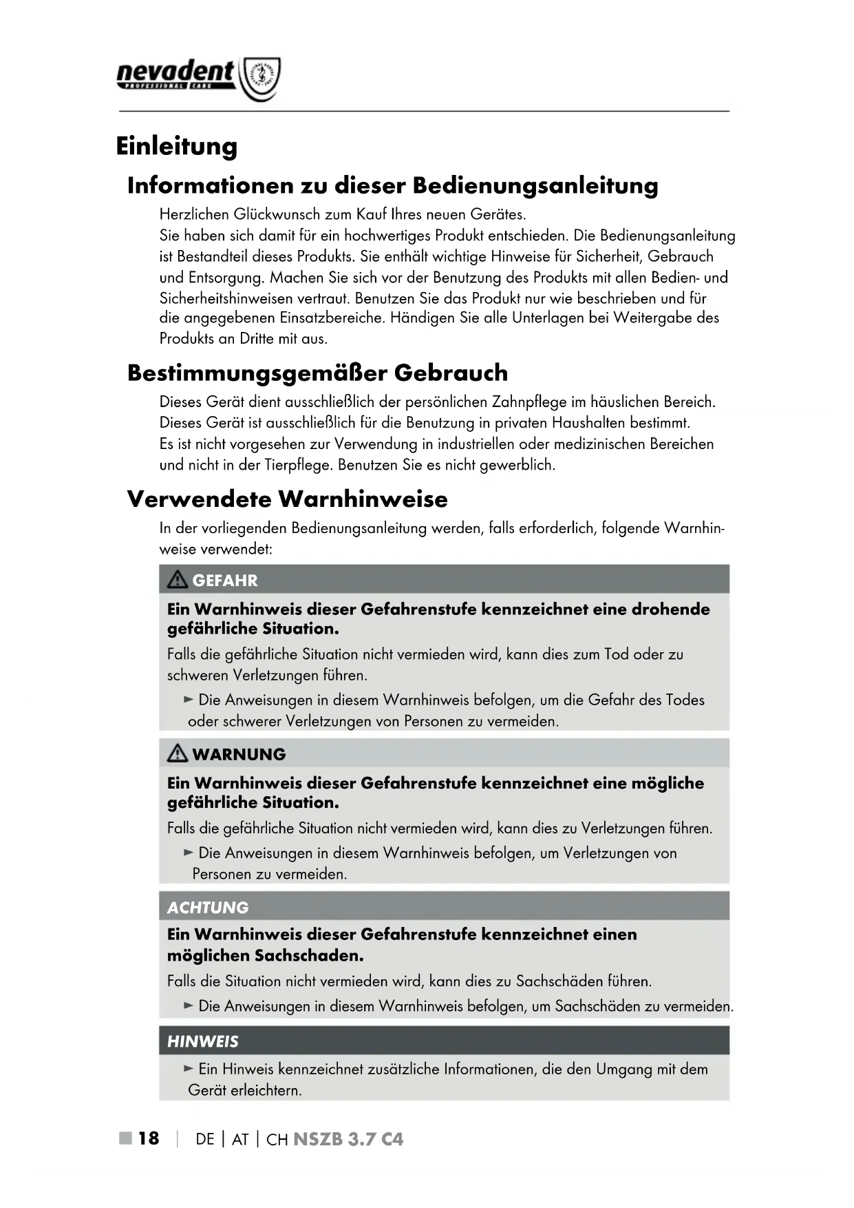 Einleitung Informationen zu dieser Bedienungsanleitung Herzlichen Glückwunsch zum Kauf Ihres neuen Gerätes. Sie haben sich damit für ein hochwertiges Produkt entschieden. Die Bedienungsanleitung ist Bestandteil dieses Produkts. Sie enthält wichtige Hinweise für Sicherheit, Gebrauch und Entsorgung. Machen Sie sich vor der Benutzung des Produkts mit allen Bedien- und Sicherheitshinweisen vertraut. Benutzen Sie das Produkt nur wie beschrieben und für die angegebenen Einsatzbereiche. Händigen Sie alle Unterlagen bei Weitergabe des Produkts an Dritte mit aus. Bestimmungsgemäßer Gebrauch Dieses Gerät dient ausschließlich der persönlichen Zahnpflege im häuslichen Bereich. Dieses Gerät ist ausschließlich für die Benutzung in privaten Haushalten bestimmt. Es ist nicht vorgesehen zur Verwendung in industriellen oder medizinischen Bereichen und nicht in der Tierpflege. Benutzen Sie es nicht gewerblich. Verwendete Warnhinweise In der vorliegenden Bedienungsanleitung werden, falls erforderlich, folgende Warnhin- weise verwendet: GEFAHR Ein Warnhinweis dieser Gefahrenstufe kennzeichnet eine drohende gefährliche Situation. Falls die gefährliche Situation nicht vermieden wird, kann dies zum Tod oder zu schweren Verletzungen führen. ► Die Anweisungen in diesem Warnhinweis befolgen, um die Gefahr des Todes oder schwerer Verletzungen von Personen zu vermeiden. WARNUNG Ein Warnhinweis dieser Gefahrenstufe kennzeichnet eine mögliche gefährliche Situation. Falls die gefährliche Situation nicht vermieden wird, kann dies zu Verletzungen führen. ► Die Anweisungen in diesem Warnhinweis befolgen, um Verletzungen von Personen zu vermeiden. ACHTUNG Ein Warnhinweis dieser Gefahrenstufe kennzeichnet einen möglichen Sachschaden. Falls die Situation nicht vermieden wird, kann dies zu Sachschäden führen. ► Die Anweisungen in diesem Warnhinweis befolgen, um Sachschäden zu vermeiden. HINWEIS ► Ein Hinweis kennzeichnet zusätzliche Informationen, die den Umgang mit dem Gerät erleichtern.DE