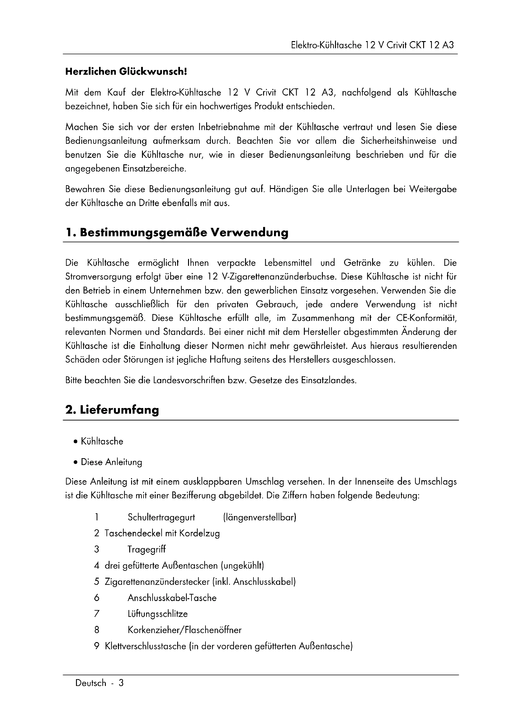 Kühltasche Diese Anleitung Diese Anleitung ist mit einem ausklappbaren Umschlag versehen. In der Innenseite des Umschlags ist die Kühltasche mit einer Bezifferung abgebildet. Die Ziffern haben folgende Bedeutung: 1 Schultertragegurt (längenverstellbar) 2 Taschendeckel mit Kordelzug 3 Tragegriff 4 drei gefütterte Außentaschen (ungekühlt) 5 Zigarettenanzünderstecker (inkl. Anschlusskabel) 6 Anschlusskabel-Tasche 7 Lüftungsschlitze 8 Korkenzieher/Flaschenöffner 9 Klettverschlusstasche (in der vorderen gefütterten Außentasche)Elektro-Kühltasche 12 V Crivit CKT 12 A3