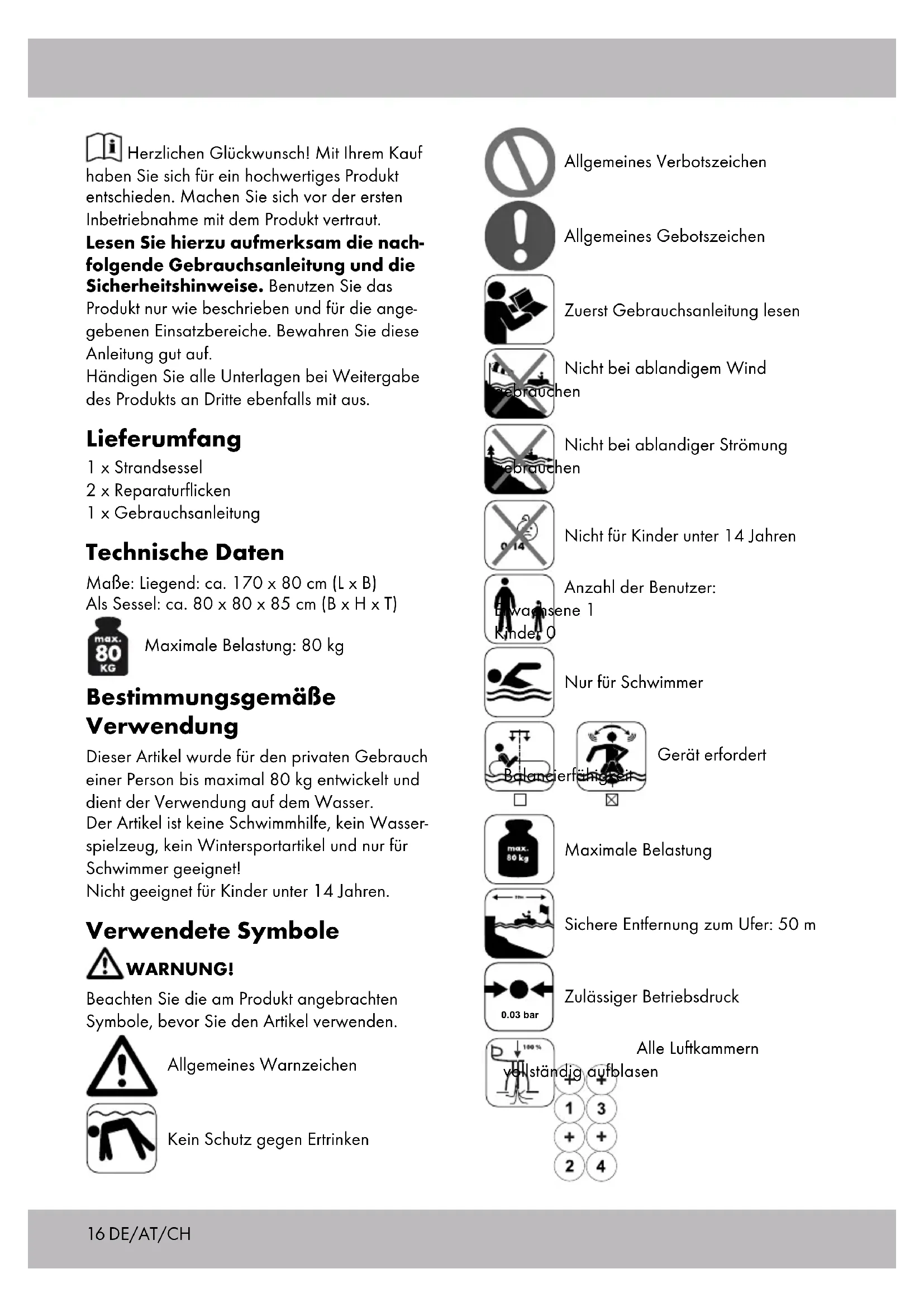 op de beschadigde plek en druk de doek stevig aan. Onderhoud, opbergen Het product steeds droog, schoon en niet opge- pompt op kamertemperatuur opbergen. De ventielen dienen bij het opbergen altijd gesloten te zijn. Alleen met water of zeepsop reinigen, nooit met bijtende reinigingsmiddelen. Tijdens het opbergen gedurende winter mag u geen scherpe voorwerpen op het product plaats- en en niet met talkpoeder bestrooien. Afvalverwerking Gelieve u op een milieuvriendelijke manier van de verpakking te ontdoen! Doe daarvoor een beroep op een erkend afvalverwerkingsbedrijf of op uw gemeenteadministratie. Houd rekening met de voorschriften die op dat moment gelden. IAN: 272429 Service België Tel.: 070 270 171 (0,15 EUR/Min.) E-Mail: deltasport@lidl.be Service Nederland Tel.: 0900 0400223 (0,10 EUR/Min.) E-Mail: deltasport@lidl.nl Reserve-onderdelen voor uw product vindt u ook via: www.delta-sport.com, rubriek Service - reserve-onderdelen- service Lidl NL/BE16 DE/AT/CH Herzlichen Glückwunsch! Mit Ihrem Kauf haben Sie sich für ein hochwertiges Produkt entschieden. Machen Sie sich vor der ersten Inbetriebnahme mit dem Produkt vertraut. Lesen Sie hierzu aufmerksam die nach- folgende Gebrauchsanleitung und die Sicherheitshinweise. Benutzen Sie das Produkt nur wie beschrieben und für die ange- gebenen Einsatzbereiche. Bewahren Sie diese Anleitung gut auf. Händigen Sie alle Unterlagen bei Weitergabe des Produkts an Dritte ebenfalls mit aus. Lieferumfang 1 x Strandsessel 2 x Reparaturflicken 1 x Gebrauchsanleitung Technische Daten Maße: Liegend: ca. 170 x 80 cm (L x B) Als Sessel: ca. 80 x 80 x 85 cm (B x H x T) Maximale Belastung: 80 kg Bestimmungsgemäße Verwendung Dieser Artikel wurde für den privaten Gebrauch einer Person bis maximal 80 kg entwickelt und dient der Verwendung auf dem Wasser. Der Artikel ist keine Schwimmhilfe, kein Wasser- spielzeug, kein Wintersportartikel und nur für Schwimmer geeignet! Nicht geeignet für Kinder unter 14 Jahren. Verwendete Symbole WARNUNG! Beachten Sie die am Produkt angebrachten Symbole, bevor Sie den Artikel verwenden. Allgemeines Warnzeichen Kein Schutz gegen Ertrinken Allgemeines Verbotszeichen Allgemeines Gebotszeichen Zuerst Gebrauchsanleitung lesen Nicht bei ablandigem Wind gebrauchen Nicht bei ablandiger Strömung gebrauchen Nicht für Kinder unter 14 Jahren Anzahl der Benutzer: Erwachsene 1 Kinder 0 Nur für Schwimmer Gerät erfordert Balancierfähigkeit Maximale Belastung Sichere Entfernung zum Ufer: 50 m