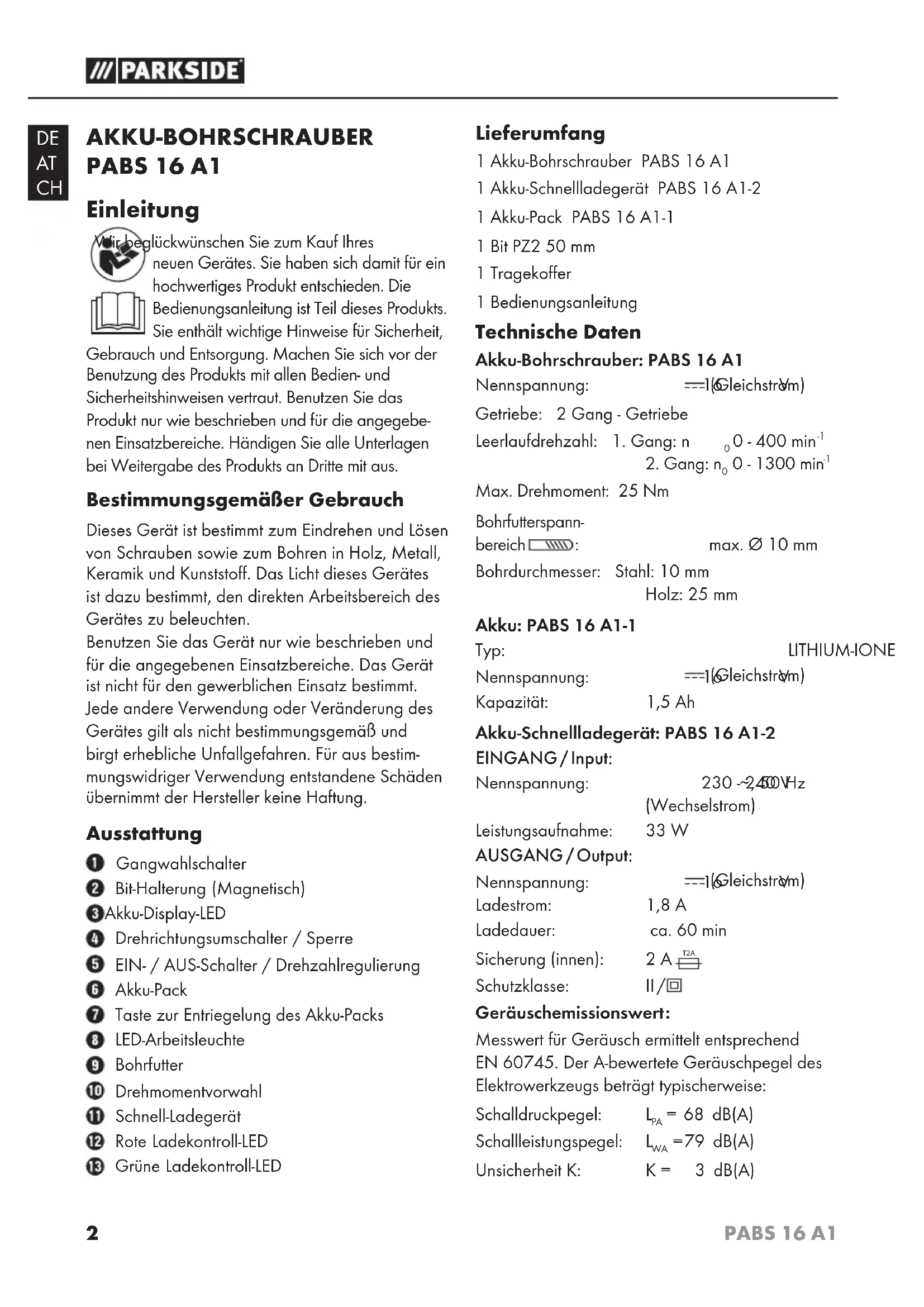 Max. Drehmoment: 25 Nm Bohrfutterspann- bereich : max. Ø 10 mm Bohrdurchmesser: Stahl: 10 mm Holz: 25 mm Akku: PABS 16 A1-1 Typ: LITHIUM-IONEN Nennspannung: 16 V (Gleichstrom) Kapazität: 1,5 Ah Akku-Schnellladegerät: PABS 16 A1-2 EINGANG / Input: Nennspannung: 230 - 240 V