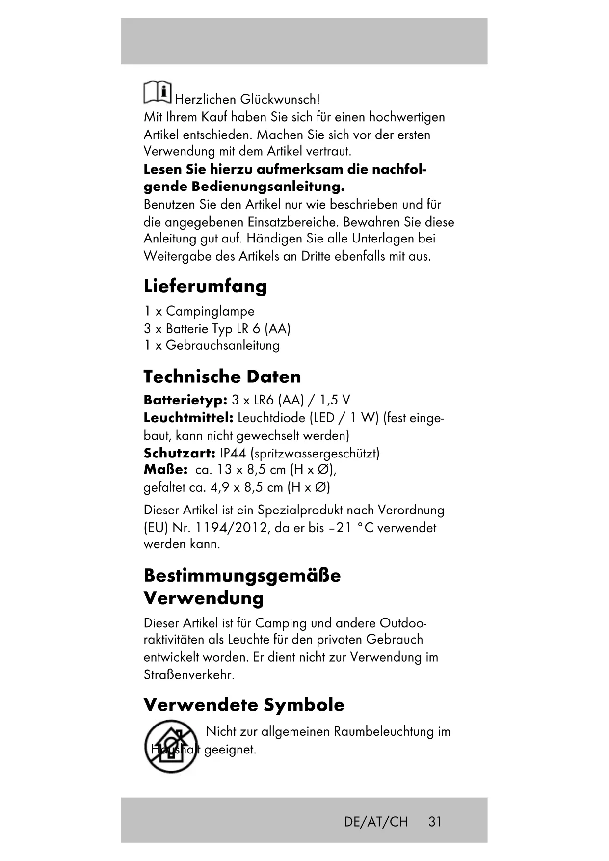 - Hängelampe (Abb. F) Um die Hängelampe zu verwenden, klappen Sie die Aufhängevorrichtung mit Karabinerfunktion (1d) aus dem Artikel nach oben (Abb. F). DE/AT/CH35 Lagerung, Reinigung Den Artikel immer trocken und sauber in einem tempe- rierten Raum lagern. Nur mit einem trockenen Reini- gungstuch sauber wischen. WICHTIG! Nie mit scharfen Reinigungsmitteln reinigen. Hinweise zur Entsorgung Entsorgen Sie den Artikel und die Verpackungsmateri- alien entsprechend aktueller örtlicher Vorschriften. Verpa- ckungsmaterialien wie z. B. Folienbeutel gehören nicht in Kinderhände. Bewahren Sie das Verpackungsmaterial für Kinder unerreichbar auf. Geräte, die mit dem nebenstehenden Symbol gekennzeichnet sind, dürfen nicht mit dem Hausmüll entsorgt werden. Sie sind verpflichtet, solche Elektro- und Elektronik-Altgeräte separat zu entsorgen. Informieren Sie sich bitte bei Ihrer Kommune über die Möglichkeiten der geregelten Entsorgung. Entfernen Sie vor dem Entsorgen die Batterie aus dem Artikel. Entsorgungsmaßnahmen Batterien Bitte beachten: Bei Batterien handelt es sich um Sondermüll, der gemäß Gesetz nicht über den Hausmüll entsorgt werden darf. Sie können ausgediente Batterien unentgeltlich bei den kommunalen Sammelstellen oder im Handel abgeben. Hier stehen spezielle Sammelbehälter bereit. Hinweise zur Garantie und Serviceabwicklung Der Artikel wurde mit großer Sorgfalt und unter stän- diger Kontrolle produziert. Sie erhalten auf diesen Arti- kel drei Jahre Garantie ab Kaufdatum. Bitte bewahren Sie den Kassenbon auf. DE/AT/CH36 Die Garantie gilt nur für Material- und Fabrikationsfeh- ler und entfällt bei missbräuchlicher oder unsachgemä- ßer Behandlung. Ihre gesetzlichen Rechte, insbeson- dere die Gewährleistungsrechte, werden durch diese Garantie nicht eingeschränkt. Bei etwaigen Beanstandungen wenden Sie sich bitte an die unten stehende Service-Hotline oder setzen Sie sich per E-Mail mit uns in Verbindung. Unsere Servicemitar- beiter werden das weitere Vorgehen schnellstmöglich mit Ihnen abstimmen. Wir werden Sie in jedem Fall persönlich beraten. Die Garantiezeit wird durch etwai- ge Reparaturen aufgrund der Garantie, gesetzlicher Gewährleistung oder Kulanz nicht verlängert. Dies gilt auch für ersetzte und reparierte Teile. Nach Ablauf der Garantie anfallende Reparaturen sind kostenpflichtig. IAN: 297011 Service Deutschland Tel.: 0800-5435111 E-Mail: deltasport@lidl.de Service Österreich Tel.: 0820 201 222 (0,15 EUR/Min.) E-Mail: deltasport@lidl.at Service Schweiz Tel.: 0842 665566 (0,08 CHF/Min., Mobilfunk max. 0,40 CHF/Min.) E-Mail: deltasport@lidl.ch