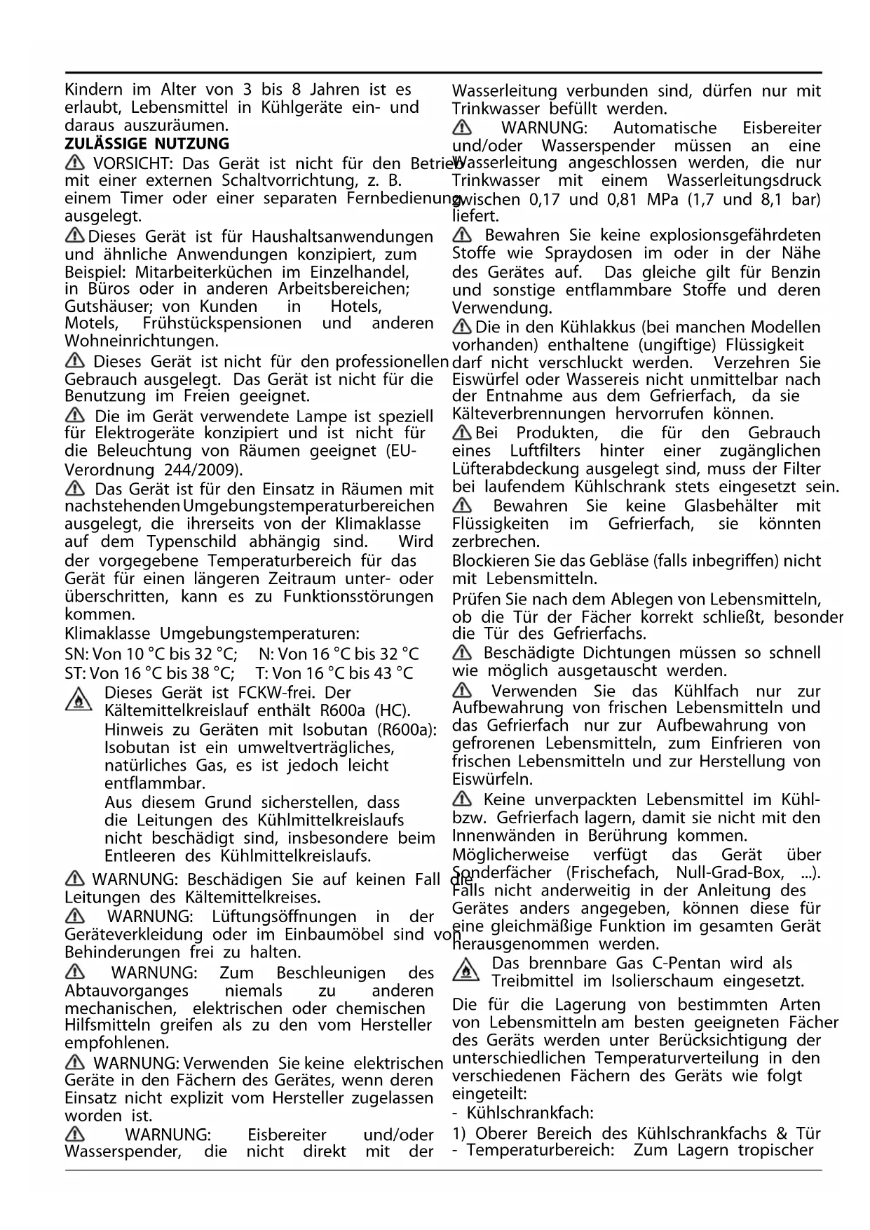 VORSICHT: Das Gerät ist nicht für den Betrieb mit einer externen Schaltvorrichtung, z. B. einem Timer oder einer separaten Fernbedienung, ausgelegt. Dieses Gerät ist für Haushaltsanwendungen und ähnliche Anwendungen konzipiert, zum Beispiel: Mitarbeiterküchen im Einzelhandel, in Büros oder in anderen Arbeitsbereichen; Gutshäuser; von Kunden in Hotels, Motels, Frühstückspensionen und anderen Wohneinrichtungen. Dieses Gerät ist nicht für den professionellen Gebrauch ausgelegt. Das Gerät ist nicht für die Benutzung im Freien geeignet. Die im Gerät verwendete Lampe ist speziell für Elektrogeräte konzipiert und ist nicht für die Beleuchtung von Räumen geeignet (EU- Verordnung 244/2009). Das Gerät ist für den Einsatz in Räumen mit nachstehendenUmgebungstemperaturbereichen ausgelegt, die ihrerseits von der Klimaklasse auf dem Typenschild abhängig sind. Wird der vorgegebene Temperaturbereich für das Gerät für einen längeren Zeitraum unter- oder überschritten, kann es zu Funktionsstörungen kommen. Klimaklasse Umgebungstemperaturen: SN: Von 10 °C bis 32 °C; N: Von 16 °C bis 32 °C ST: Von 16 °C bis 38 °C; T: Von 16 °C bis 43 °C Dieses Gerät ist FCKW-frei. Der Kältemittelkreislauf enthält R600a (HC). Hinweis zu Geräten mit Isobutan (R600a): Isobutan ist ein umweltverträgliches, natürliches Gas, es ist jedoch leicht entflammbar. Aus diesem Grund sicherstellen, dass die Leitungen des Kühlmittelkreislaufs nicht beschädigt sind, insbesondere beim Entleeren des Kühlmittelkreislaufs. WARNUNG: Beschädigen Sie auf keinen Fall die Leitungen des Kältemittelkreises. WARNUNG: Lüftungsöffnungen in der Geräteverkleidung oder im Einbaumöbel sind von Behinderungen frei zu halten. WARNUNG: Zum Beschleunigen des Abtauvorganges niemals zu anderen mechanischen, elektrischen oder chemischen Hilfsmitteln greifen als zu den vom Hersteller empfohlenen. WARNUNG: Verwenden Sie keine elektrischen Geräte in den Fächern des Gerätes, wenn deren Einsatz nicht explizit vom Hersteller zugelassen worden ist. WARNUNG: Eisbereiter und/oder Wasserspender, die nicht direkt mit der Wasserleitung verbunden sind, dürfen nur mit Trinkwasser befüllt werden. WARNUNG: Automatische Eisbereiter und/oder Wasserspender müssen an eine Wasserleitung angeschlossen werden, die nur Trinkwasser mit einem Wasserleitungsdruck zwischen 0,17 und 0,81 MPa (1,7 und 8,1 bar) liefert. Bewahren Sie keine explosionsgefährdeten Stoffe wie Spraydosen im oder in der Nähe des Gerätes auf. Das gleiche gilt für Benzin und sonstige entflammbare Stoffe und deren Verwendung. Die in den Kühlakkus (bei manchen Modellen vorhanden) enthaltene (ungiftige) Flüssigkeit darf nicht verschluckt werden. Verzehren Sie Eiswürfel oder Wassereis nicht unmittelbar nach der Entnahme aus dem Gefrierfach, da sie Kälteverbrennungen hervorrufen können. Bei Produkten, die für den Gebrauch eines Luftfilters hinter einer zugänglichen Lüfterabdeckung ausgelegt sind, muss der Filter bei laufendem Kühlschrank stets eingesetzt sein. Bewahren Sie keine Glasbehälter mit Flüssigkeiten im Gefrierfach, sie könnten zerbrechen. Blockieren Sie das Gebläse (falls inbegriffen) nicht mit Lebensmitteln. Prüfen Sie nach dem Ablegen von Lebensmitteln, ob die Tür der Fächer korrekt schließt, besonders die Tür des Gefrierfachs. Beschädigte Dichtungen müssen so schnell wie möglich ausgetauscht werden. Verwenden Sie das Kühlfach nur zur Aufbewahrung von frischen Lebensmitteln und das Gefrierfach nur zur Aufbewahrung von gefrorenen Lebensmitteln, zum Einfrieren von frischen Lebensmitteln und zur Herstellung von Eiswürfeln. Keine unverpackten Lebensmittel im Kühl- bzw. Gefrierfach lagern, damit sie nicht mit den Innenwänden in Berührung kommen. Möglicherweise verfügt das Gerät über Sonderfächer (Frischefach, Null-Grad-Box, ...). Falls nicht anderweitig in der Anleitung des Gerätes anders angegeben, können diese für eine gleichmäßige Funktion im gesamten Gerät herausgenommen werden. Das brennbare Gas C-Pentan wird als Treibmittel im Isolierschaum eingesetzt. Die für die Lagerung von bestimmten Arten von Lebensmitteln am besten geeigneten Fächer des Geräts werden unter Berücksichtigung der unterschiedlichen Temperaturverteilung in den verschiedenen Fächern des Geräts wie folgt eingeteilt: - Kühlschrankfach: