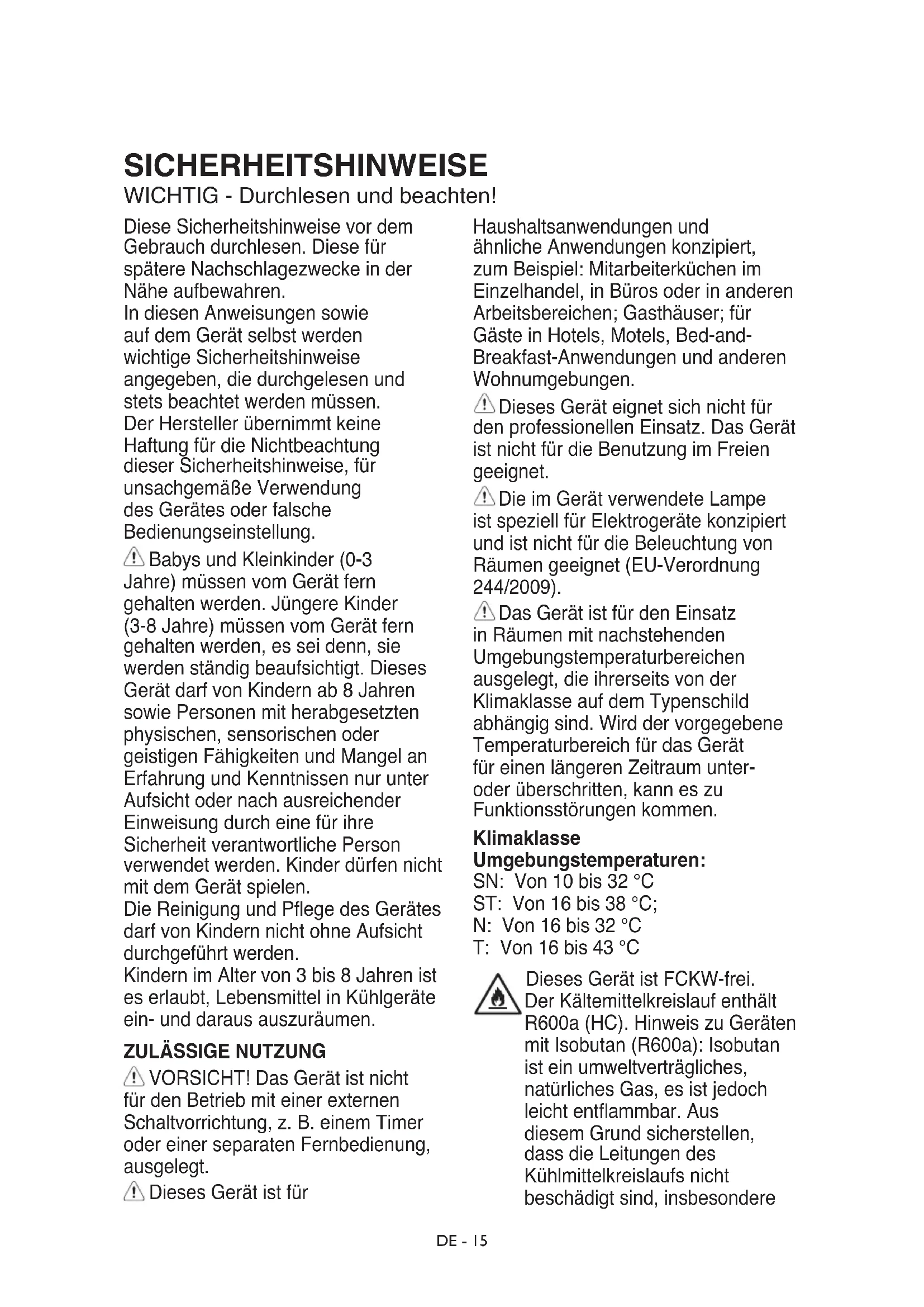 Това представяне служи само за информация относно частите на уреда. Частите могат да се различават в зависимост от модела на уреда.DE - 15 SICHERHEITSHINWEISE WICHTIG - Durchlesen und beachten! Diese Sicherheitshinweise vor dem Gebrauch durchlesen. Diese für spätere Nachschlagezwecke in der Nähe aufbewahren. In diesen Anweisungen sowie auf dem Gerät selbst werden wichtige Sicherheitshinweise angegeben, die durchgelesen und stets beachtet werden müssen. Der Hersteller übernimmt keine Haftung für die Nichtbeachtung dieser Sicherheitshinweise, für unsachgemäße Verwendung des Gerätes oder falsche Bedienungseinstellung. Babys und Kleinkinder (0-3 Jahre) müssen vom Gerät fern gehalten werden. Jüngere Kinder (3-8 Jahre) müssen vom Gerät fern gehalten werden, es sei denn, sie werden ständig beaufsichtigt. Dieses Gerät darf von Kindern ab 8 Jahren sowie Personen mit herabgesetzten physischen, sensorischen oder geistigen Fähigkeiten und Mangel an Erfahrung und Kenntnissen nur unter Aufsicht oder nach ausreichender Einweisung durch eine für ihre Sicherheit verantwortliche Person verwendet werden. Kinder dürfen nicht mit dem Gerät spielen. Die Reinigung und Pege des Gerätes darf von Kindern nicht ohne Aufsicht durchgeführt werden. Kindern im Alter von 3 bis 8 Jahren ist es erlaubt, Lebensmittel in Kühlgeräte ein- und daraus auszuräumen.