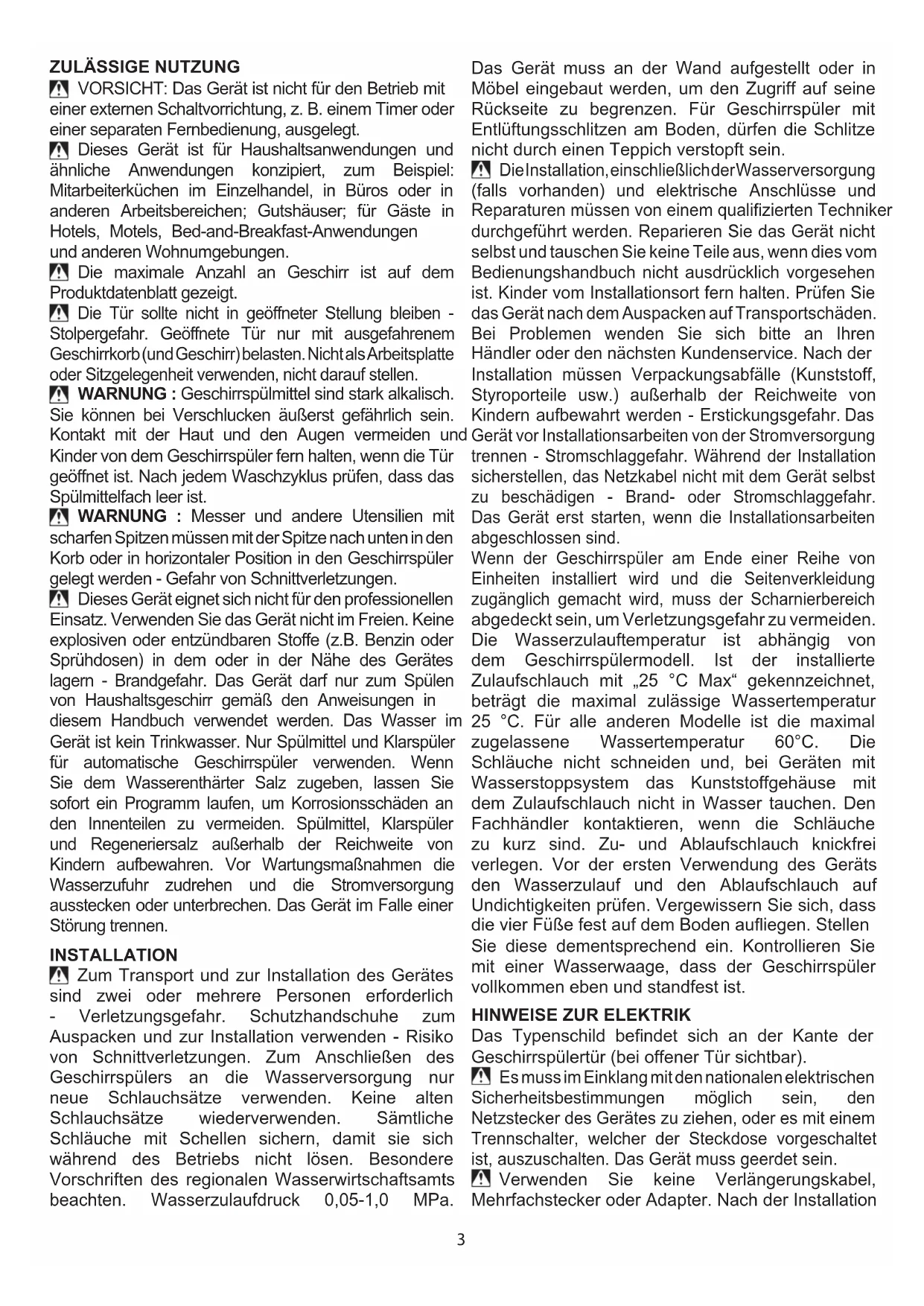 VORSICHT: Das Gerät ist nicht für den Betrieb mit einer externen Schaltvorrichtung, z. B. einem Timer oder einer separaten Fernbedienung, ausgelegt. Dieses Gerät ist für Haushaltsanwendungen und ähnliche Anwendungen konzipiert, zum Beispiel: Mitarbeiterküchen im Einzelhandel, in Büros oder in anderen Arbeitsbereichen; Gutshäuser; für Gäste in Hotels, Motels, Bed-and-Breakfast-Anwendungen und anderen Wohnumgebungen. Die maximale Anzahl an Geschirr ist auf dem Produktdatenblatt gezeigt. Die Tür sollte nicht in geöffneter Stellung bleiben - Stolpergefahr. Geöffnete Tür nur mit ausgefahrenem Geschirrkorb (und Geschirr) belasten. Nicht als Arbeitsplatte oder Sitzgelegenheit verwenden, nicht darauf stellen. WARNUNG : Geschirrspülmittel sind stark alkalisch. Sie können bei Verschlucken äußerst gefährlich sein. Kontakt mit der Haut und den Augen vermeiden und Kinder von dem Geschirrspüler fern halten, wenn die Tür geöffnet ist. Nach jedem Waschzyklus prüfen, dass das Spülmittelfach leer ist. WARNUNG : Messer und andere Utensilien mit scharfen Spitzen müssen mit der Spitze nach unten in den Korb oder in horizontaler Position in den Geschirrspüler gelegt werden - Gefahr von Schnittverletzungen. Dieses Gerät eignet sich nicht für den professionellen Einsatz. Verwenden Sie das Gerät nicht im Freien. Keine explosiven oder entzündbaren Stoffe (z.B. Benzin oder Sprühdosen) in dem oder in der Nähe des Gerätes lagern - Brandgefahr. Das Gerät darf nur zum Spülen von Haushaltsgeschirr gemäß den Anweisungen in diesem Handbuch verwendet werden. Das Wasser im Gerät ist kein Trinkwasser. Nur Spülmittel und Klarspüler für automatische Geschirrspüler verwenden. Wenn Sie dem Wasserenthärter Salz zugeben, lassen Sie sofort ein Programm laufen, um Korrosionsschäden an den Innenteilen zu vermeiden. Spülmittel, Klarspüler und Regeneriersalz außerhalb der Reichweite von Kindern aufbewahren. Vor Wartungsmaßnahmen die Wasserzufuhr zudrehen und die Stromversorgung ausstecken oder unterbrechen. Das Gerät im Falle einer Störung trennen. INSTALLATION Zum Transport und zur Installation des Gerätes sind zwei oder mehrere Personen erforderlich - Verletzungsgefahr. Schutzhandschuhe zum Auspacken und zur Installation verwenden - Risiko von Schnittverletzungen. Zum Anschließen des Geschirrspülers an die Wasserversorgung nur neue Schlauchsätze verwenden. Keine alten Schlauchsätze wiederverwenden. Sämtliche Schläuche mit Schellen sichern, damit sie sich während des Betriebs nicht lösen. Besondere Vorschriften des regionalen Wasserwirtschaftsamts beachten. Wasserzulaufdruck 0,05-1,0 MPa. Das Gerät muss an der Wand aufgestellt oder in Möbel eingebaut werden, um den Zugriff auf seine Rückseite zu begrenzen. Für Geschirrspüler mit Entlüftungsschlitzen am Boden, dürfen die Schlitze nicht durch einen Teppich verstopft sein. Die Installation, einschließlich der Wasserversorgung (falls vorhanden) und elektrische Anschlüsse und Reparaturen müssen von einem qualizierten Techniker durchgeführt werden. Reparieren Sie das Gerät nicht selbst und tauschen Sie keine Teile aus, wenn dies vom Bedienungshandbuch nicht ausdrücklich vorgesehen ist. Kinder vom Installationsort fern halten. Prüfen Sie das Gerät nach dem Auspacken auf Transportschäden. Bei Problemen wenden Sie sich bitte an Ihren Händler oder den nächsten Kundenservice. Nach der Installation müssen Verpackungsabfälle (Kunststoff, Styroporteile usw.) außerhalb der Reichweite von Kindern aufbewahrt werden - Erstickungsgefahr. Das Gerät vor Installationsarbeiten von der Stromversorgung trennen - Stromschlaggefahr. Während der Installation sicherstellen, das Netzkabel nicht mit dem Gerät selbst zu beschädigen - Brand- oder Stromschlaggefahr. Das Gerät erst starten, wenn die Installationsarbeiten abgeschlossen sind. Wenn der Geschirrspüler am Ende einer Reihe von Einheiten installiert wird und die Seitenverkleidung zugänglich gemacht wird, muss der Scharnierbereich abgedeckt sein, um Verletzungsgefahr zu vermeiden. Die Wasserzulauftemperatur ist abhängig von dem Geschirrspülermodell. Ist der installierte Zulaufschlauch mit „25 °C Max“ gekennzeichnet, beträgt die maximal zulässige Wassertemperatur 25 °C. Für alle anderen Modelle ist die maximal zugelassene Wassertemperatur 60°C. Die Schläuche nicht schneiden und, bei Geräten mit Wasserstoppsystem das Kunststoffgehäuse mit dem Zulaufschlauch nicht in Wasser tauchen. Den Fachhändler kontaktieren, wenn die Schläuche zu kurz sind. Zu- und Ablaufschlauch knickfrei verlegen. Vor der ersten Verwendung des Geräts den Wasserzulauf und den Ablaufschlauch auf Undichtigkeiten prüfen. Vergewissern Sie sich, dass die vier Füße fest auf dem Boden auiegen. Stellen Sie diese dementsprechend ein. Kontrollieren Sie mit einer Wasserwaage, dass der Geschirrspüler vollkommen eben und standfest ist.