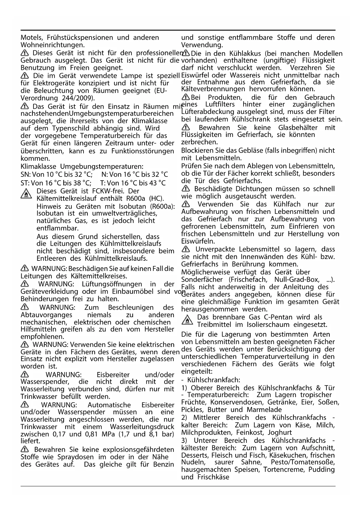 VORSICHT: Das Gerät ist nicht für den Betrieb mit einer externen Schaltvorrichtung, z. B. einem Timer oder einer separaten Fernbedienung, ausgelegt. Dieses Gerät ist für Haushaltsanwendungen und ähnliche Anwendungen konzipiert, zum Beispiel: Mitarbeiterküchen im Einzelhandel, in Büros oder in anderen Arbeitsbereichen; Gutshäuser; von Kunden in Hotels,Motels, Frühstückspensionen und anderen Wohneinrichtungen. Dieses Gerät ist nicht für den professionellen Gebrauch ausgelegt. Das Gerät ist nicht für die Benutzung im Freien geeignet. Die im Gerät verwendete Lampe ist speziell für Elektrogeräte konzipiert und ist nicht für die Beleuchtung von Räumen geeignet (EU- Verordnung 244/2009). Das Gerät ist für den Einsatz in Räumen mit nachstehendenUmgebungstemperaturbereichen ausgelegt, die ihrerseits von der Klimaklasse auf dem Typenschild abhängig sind. Wird der vorgegebene Temperaturbereich für das Gerät für einen längeren Zeitraum unter- oder überschritten, kann es zu Funktionsstörungen kommen. Klimaklasse Umgebungstemperaturen: SN: Von 10 °C bis 32 °C; N: Von 16 °C bis 32 °C ST: Von 16 °C bis 38 °C; T: Von 16 °C bis 43 °C Dieses Gerät ist FCKW-frei. Der Kältemittelkreislauf enthält R600a (HC). Hinweis zu Geräten mit Isobutan (R600a): Isobutan ist ein umweltverträgliches, natürliches Gas, es ist jedoch leicht entflammbar. Aus diesem Grund sicherstellen, dass die Leitungen des Kühlmittelkreislaufs nicht beschädigt sind, insbesondere beim Entleeren des Kühlmittelkreislaufs. WARNUNG: Beschädigen Sie auf keinen Fall die Leitungen des Kältemittelkreises. WARNUNG: Lüftungsöffnungen in der Geräteverkleidung oder im Einbaumöbel sind von Behinderungen frei zu halten. WARNUNG: Zum Beschleunigen des Abtauvorganges niemals zu anderen mechanischen, elektrischen oder chemischen Hilfsmitteln greifen als zu den vom Hersteller empfohlenen. WARNUNG: Verwenden Sie keine elektrischen Geräte in den Fächern des Gerätes, wenn deren Einsatz nicht explizit vom Hersteller zugelassen worden ist. WARNUNG: Eisbereiter und/oder Wasserspender, die nicht direkt mit der Wasserleitung verbunden sind, dürfen nur mit Trinkwasser befüllt werden. WARNUNG: Automatische Eisbereiter und/oder Wasserspender müssen an eine Wasserleitung angeschlossen werden, die nur Trinkwasser mit einem Wasserleitungsdruck zwischen 0,17 und 0,81 MPa (1,7 und 8,1 bar) liefert. Bewahren Sie keine explosionsgefährdeten Stoffe wie Spraydosen im oder in der Nähe des Gerätes auf. Das gleiche gilt für Benzin und sonstige entflammbare Stoffe und deren Verwendung. Die in den Kühlakkus (bei manchen Modellen vorhanden) enthaltene (ungiftige) Flüssigkeit darf nicht verschluckt werden. Verzehren Sie Eiswürfel oder Wassereis nicht unmittelbar nach der Entnahme aus dem Gefrierfach, da sie Kälteverbrennungen hervorrufen können. Bei Produkten, die für den Gebrauch eines Luftfilters hinter einer zugänglichen Lüfterabdeckung ausgelegt sind, muss der Filter bei laufendem Kühlschrank stets eingesetzt sein. Bewahren Sie keine Glasbehälter mit Flüssigkeiten im Gefrierfach, sie könnten zerbrechen. Blockieren Sie das Gebläse (falls inbegriffen) nicht mit Lebensmitteln. Prüfen Sie nach dem Ablegen von Lebensmitteln, ob die Tür der Fächer korrekt schließt, besonders die Tür des Gefrierfachs. Beschädigte Dichtungen müssen so schnell wie möglich ausgetauscht werden. Verwenden Sie das Kühlfach nur zur Aufbewahrung von frischen Lebensmitteln und das Gefrierfach nur zur Aufbewahrung von gefrorenen Lebensmitteln, zum Einfrieren von frischen Lebensmitteln und zur Herstellung von Eiswürfeln. Unverpackte Lebensmittel so lagern, dass sie nicht mit den Innenwänden des Kühl- bzw. Gefrierfachs in Berührung kommen. Möglicherweise verfügt das Gerät über Sonderfächer (Frischefach, Null-Grad-Box, ...). Falls nicht anderweitig in der Anleitung des Gerätes anders angegeben, können diese für eine gleichmäßige Funktion im gesamten Gerät herausgenommen werden. Das brennbare Gas C-Pentan wird als Treibmittel im Isolierschaum eingesetzt. Die für die Lagerung von bestimmten Arten von Lebensmitteln am besten geeigneten Fächer des Geräts werden unter Berücksichtigung der unterschiedlichen Temperaturverteilung in den verschiedenen Fächern des Geräts wie folgt eingeteilt: - Kühlschrankfach: