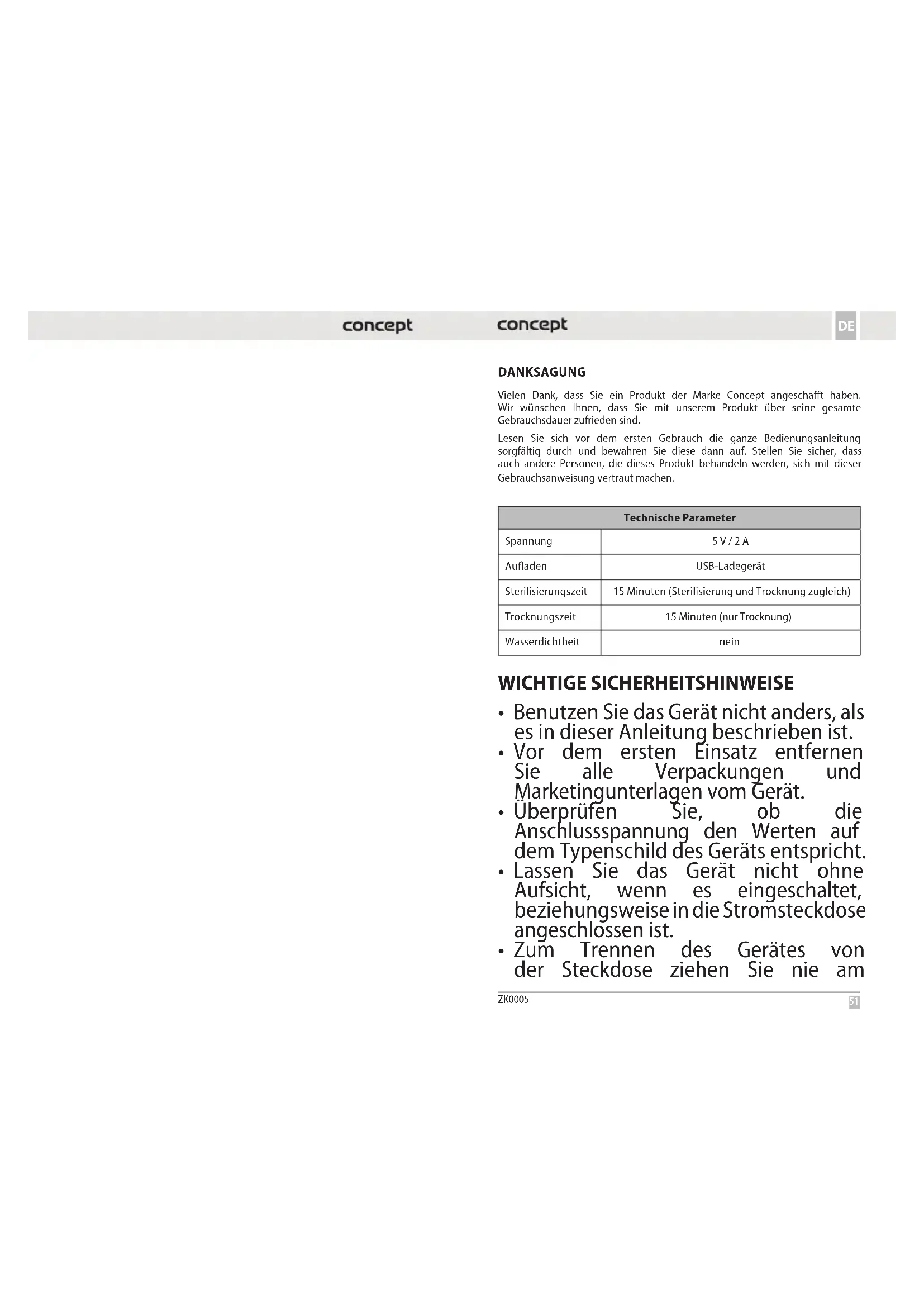 DANKSAGUNG Vielen Dank, dass Sie ein Produkt der Marke Concept angeschafft haben. Wir wünschen Ihnen, dass Sie mit unserem Produkt über seine gesamte Gebrauchsdauer zufrieden sind. Lesen Sie sich vor dem ersten Gebrauch die ganze Bedienungsanleitung sorgfältig durch und bewahren Sie diese dann auf. Stellen Sie sicher, dass auch andere Personen, die dieses Produkt behandeln werden, sich mit dieser Gebrauchsanweisung vertraut machen. Technische Parameter Spannung 5 V / 2 A Aufladen USB-Ladegerät Sterilisierungszeit 15 Minuten (Sterilisierung und Trocknung zugleich) Trocknungszeit 15 Minuten (nur Trocknung) Wasserdichtheit nein WICHTIGE SICHERHEITSHINWEISE