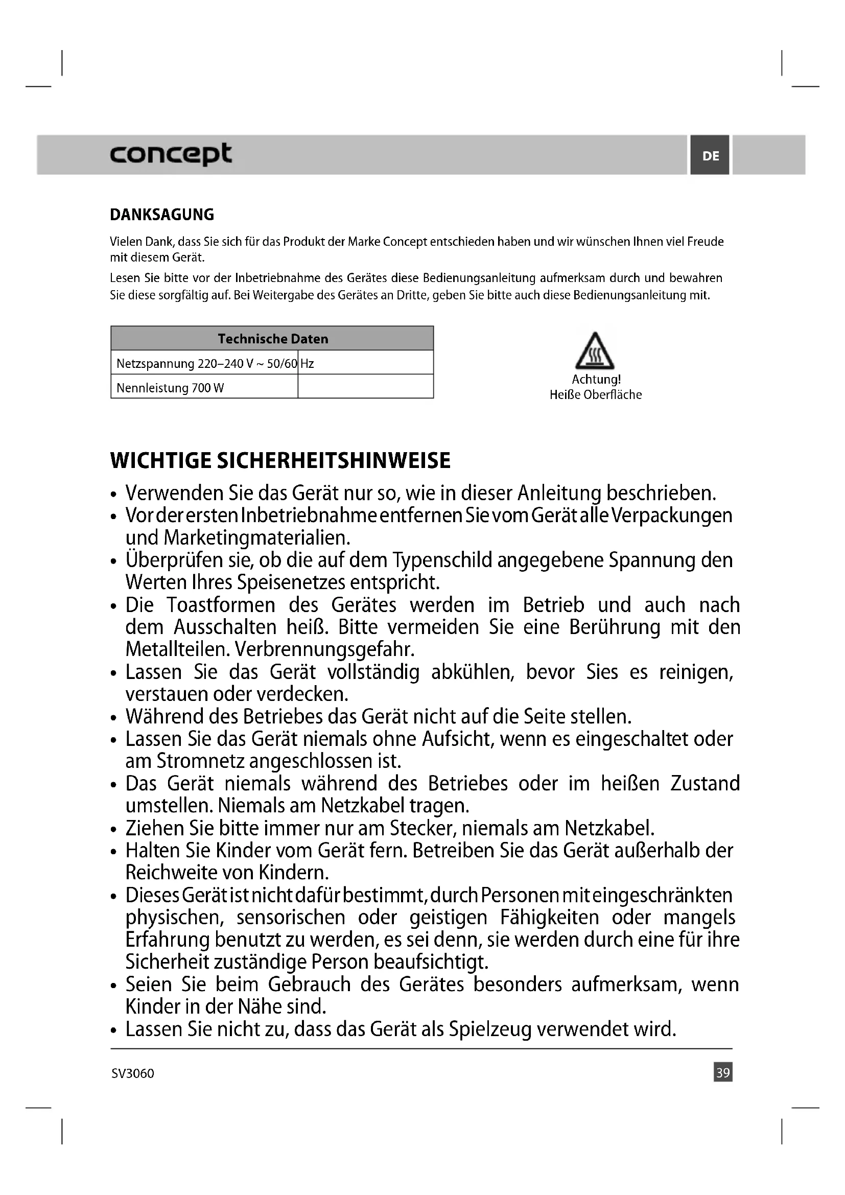 SV3060 DANKSAGUNG Vielen Dank, dass Sie sich für das Produkt der Marke Concept entschieden haben und wir wünschen Ihnen viel Freude mit diesem Gerät. Lesen Sie bitte vor der Inbetriebnahme des Gerätes diese Bedienungsanleitung aufmerksam durch und bewahren Sie diese sorgfältig auf. Bei Weitergabe des Gerätes an Dritte, geben Sie bitte auch diese Bedienungsanleitung mit. Technische Daten Netzspannung 220–240 V ~ 50/60 Hz Nennleistung 700 W WICHTIGE SICHERHEITSHINWEISE