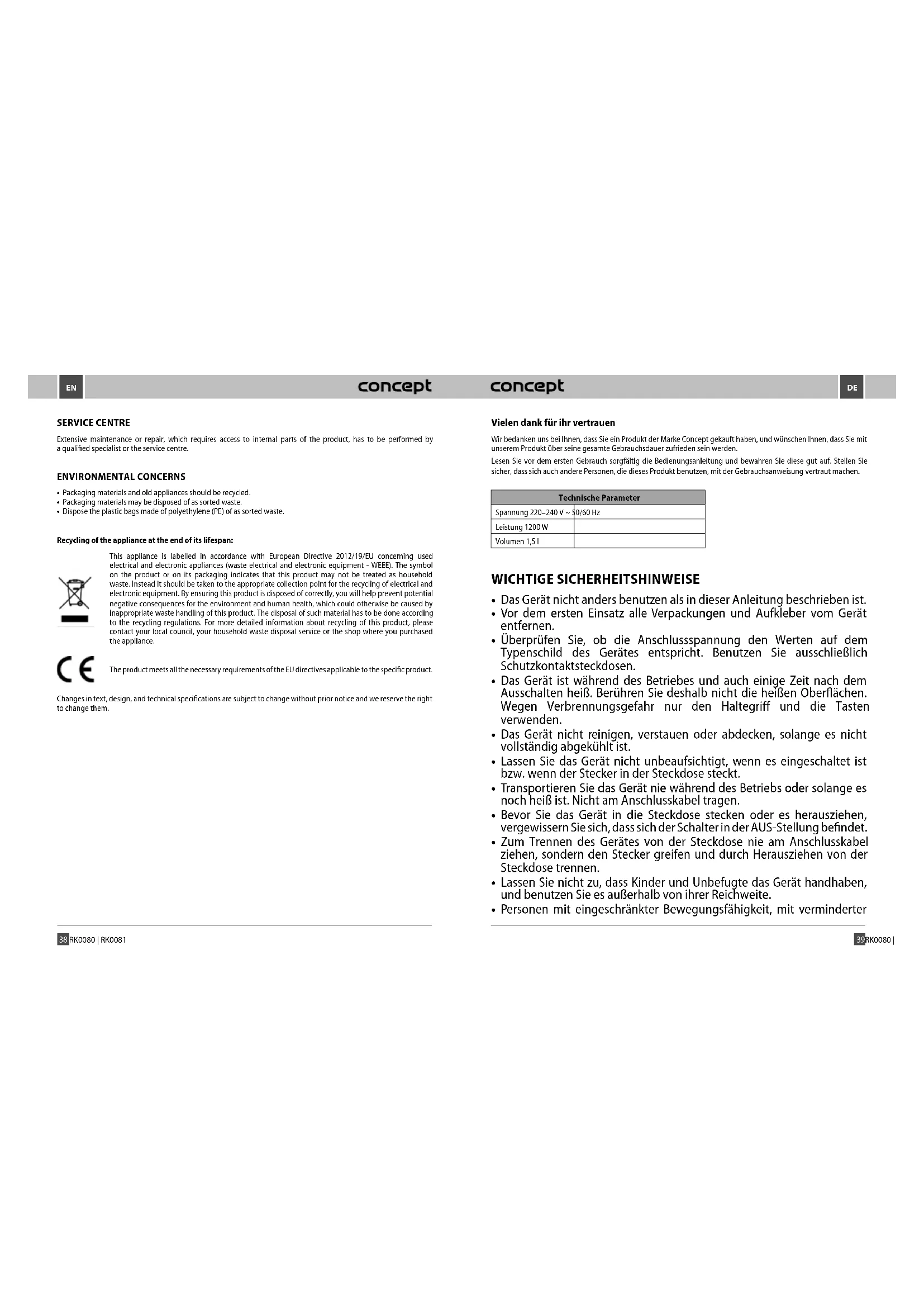 BEDIENUNGSANLEITUNG RK0080 Concept