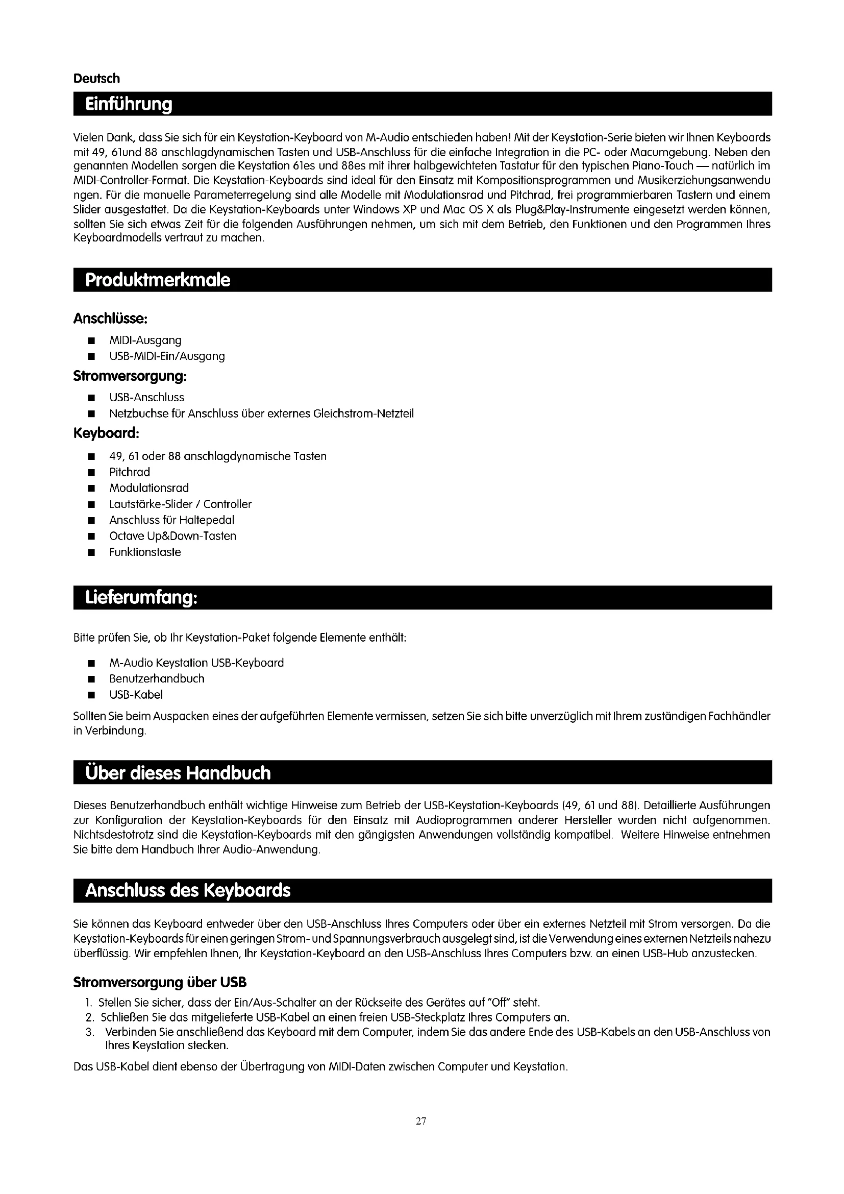 - Messages Sys Ex ** Messages MMC Sys Ex *** Cette valeur ne peut être tapée à l’aide des touches du clavier numérique. Tapez 144 puis appuyer sur le bouton préréglé + afin de régler cette valeur.2627 Einführung Vielen Dank, dass Sie sich für ein Keystation-Keyboard von M-Audio entschieden haben! Mit der Keystation-Serie bieten wir Ihnen Keyboards mit 49, 61und 88 anschlagdynamischen Tasten und USB-Anschluss für die einfache Integration in die PC- oder Macumgebung. Neben den genannten Modellen sorgen die Keystation 61es und 88es mit ihrer halbgewichteten Tastatur für den typischen Piano-Touch — natürlich im MIDI-Controller-Format. Die Keystation-Keyboards sind ideal für den Einsatz mit Kompositionsprogrammen und Musikerziehungsanwendu ngen. Für die manuelle Parameterregelung sind alle Modelle mit Modulationsrad und Pitchrad, frei programmierbaren Tastern und einem Slider ausgestattet. Da die Keystation-Keyboards unter Windows XP und Mac OS X als Plug&Play-Instrumente eingesetzt werden können, sollten Sie sich etwas Zeit für die folgenden Ausführungen nehmen, um sich mit dem Betrieb, den Funktionen und den Programmen Ihres Keyboardmodells vertraut zu machen. Produktmerkmale Anschlüsse: < MIDI-Ausgang < USB-MIDI-Ein/Ausgang Stromversorgung: < USB-Anschluss < Netzbuchse für Anschluss über externes Gleichstrom-Netzteil Keyboard: < 49, 61 oder 88 anschlagdynamische Tasten < Pitchrad < Modulationsrad < Lautstärke-Slider / Controller < Anschluss für Haltepedal < Octave Up&Down-Tasten < Funktionstaste Lieferumfang: Bitte prüfen Sie, ob Ihr Keystation-Paket folgende Elemente enthält: < M-Audio Keystation USB-Keyboard < Benutzerhandbuch < USB-Kabel Sollten Sie beim Auspacken eines der aufgeführten Elemente vermissen, setzen Sie sich bitte unverzüglich mit Ihrem zuständigen Fachhändler in Verbindung. Über dieses Handbuch Dieses Benutzerhandbuch enthält wichtige Hinweise zum Betrieb der USB-Keystation-Keyboards (49, 61 und 88). Detaillierte Ausführungen zur Konfiguration der Keystation-Keyboards für den Einsatz mit Audioprogrammen anderer Hersteller wurden nicht aufgenommen. Nichtsdestotrotz sind die Keystation-Keyboards mit den gängigsten Anwendungen vollständig kompatibel. Weitere Hinweise entnehmen Sie bitte dem Handbuch Ihrer Audio-Anwendung. Anschluss des Keyboards Sie können das Keyboard entweder über den USB-Anschluss Ihres Computers oder über ein externes Netzteil mit Strom versorgen. Da die Keystation-Keyboards für einen geringen Strom- und Spannungsverbrauch ausgelegt sind, ist die Verwendung eines externen Netzteils nahezu überflüssig. Wir empfehlen Ihnen, Ihr Keystation-Keyboard an den USB-Anschluss Ihres Computers bzw. an einen USB-Hub anzustecken. Stromversorgung über USB