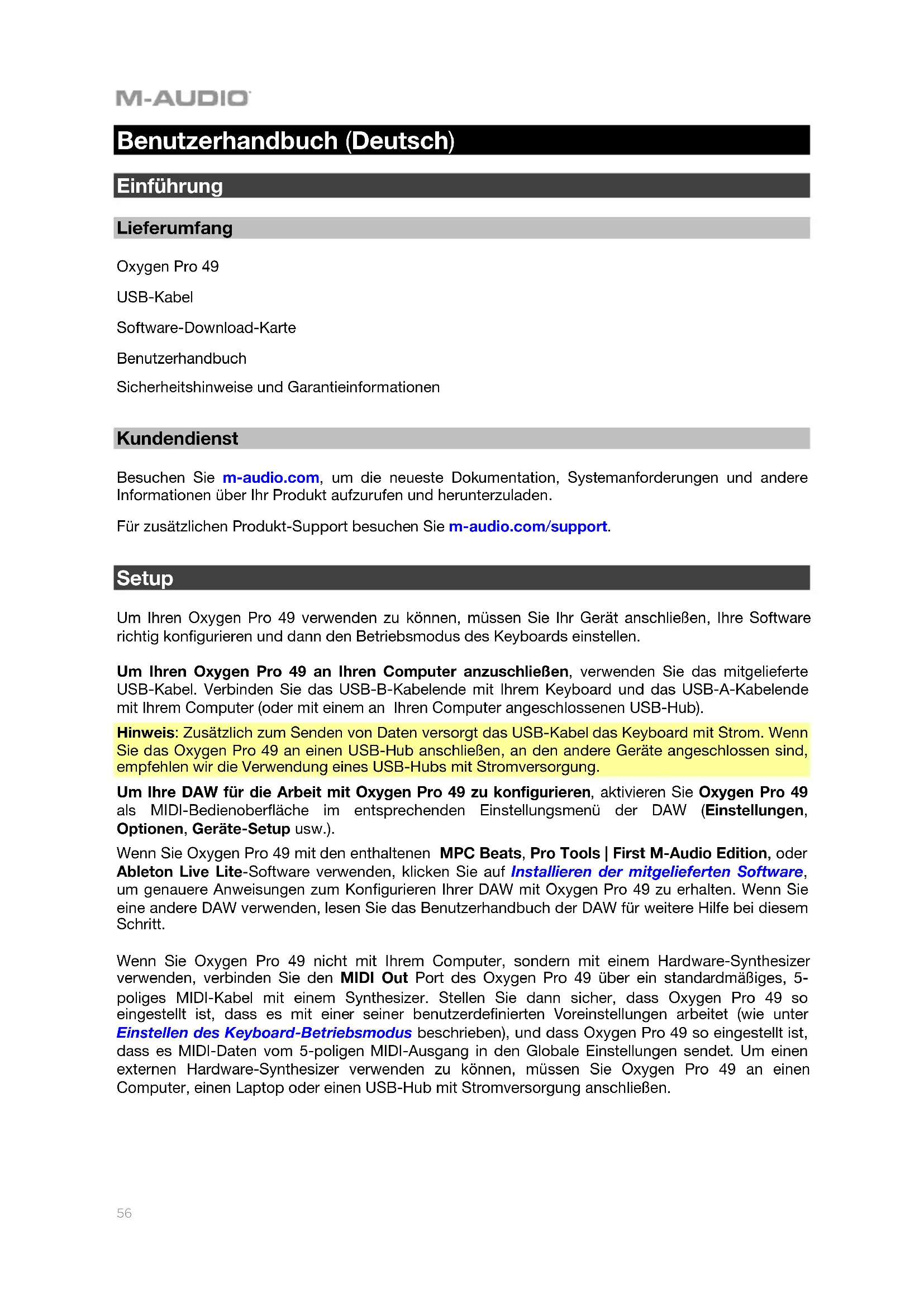 Menu impostazioni globali Servirsi del Menu impostazioni globali a Display per personalizzare alcuni dei comandi predefiniti della tastiera. Queste impostazioni si applicano alla tastiera in modalità DAW e Preset e qualsiasi modifica apportata dal Menu impostazioni globali sarà salvata al momento dello spegnimento della tastiera. Per entrare nel Menu impostazioni globali, tenere premuto Shift e premere il tasto Mode. Servirsi di Select/Scroll Encoder per regolare le impostazioni (come descritto in Panoramica del display). Per uscire dal Menu impostazioni globali, premere il tasto Back (indietro).56 Benutzerhandbuch (Deutsch) Einführung Lieferumfang Oxygen Pro 49 USB-Kabel Software-Download-Karte Benutzerhandbuch Sicherheitshinweise und Garantieinformationen Kundendienst Besuchen Sie m-audio.com, um die neueste Dokumentation, Systemanforderungen und andere Informationen über Ihr Produkt aufzurufen und herunterzuladen. Für zusätzlichen Produkt-Support besuchen Sie m-audio.com/support. Setup Um Ihren Oxygen Pro 49 verwenden zu können, müssen Sie Ihr Gerät anschließen, Ihre Software richtig konfigurieren und dann den Betriebsmodus des Keyboards einstellen. Um Ihren Oxygen Pro 49 an Ihren Computer anzuschließen, verwenden Sie das mitgelieferte USB-Kabel. Verbinden Sie das USB-B-Kabelende mit Ihrem Keyboard und das USB-A-Kabelende mit Ihrem Computer (oder mit einem an Ihren Computer angeschlossenen USB-Hub). Hinweis: Zusätzlich zum Senden von Daten versorgt das USB-Kabel das Keyboard mit Strom. Wenn Sie das Oxygen Pro 49 an einen USB-Hub anschließen, an den andere Geräte angeschlossen sind, empfehlen wir die Verwendung eines USB-Hubs mit Stromversorgung. Um Ihre DAW für die Arbeit mit Oxygen Pro 49 zu konfigurieren, aktivieren Sie Oxygen Pro 49 als MIDI-Bedienoberfläche im entsprechenden Einstellungsmenü der DAW (Einstellungen, Optionen, Geräte-Setup usw.). Wenn Sie Oxygen Pro 49 mit den enthaltenen MPC Beats, Pro Tools | First M-Audio Edition, oder Ableton Live Lite-Software verwenden, klicken Sie auf Installieren der mitgelieferten Software, um genauere Anweisungen zum Konfigurieren Ihrer DAW mit Oxygen Pro 49 zu erhalten. Wenn Sie eine andere DAW verwenden, lesen Sie das Benutzerhandbuch der DAW für weitere Hilfe bei diesem Schritt. Wenn Sie Oxygen Pro 49 nicht mit Ihrem Computer, sondern mit einem Hardware-Synthesizer verwenden, verbinden Sie den MIDI Out Port des Oxygen Pro 49 über ein standardmäßiges, 5- poliges MIDI-Kabel mit einem Synthesizer. Stellen Sie dann sicher, dass Oxygen Pro 49 so eingestellt ist, dass es mit einer seiner benutzerdefinierten Voreinstellungen arbeitet (wie unter Einstellen des Keyboard-Betriebsmodus beschrieben), und dass Oxygen Pro 49 so eingestellt ist, dass es MIDI-Daten vom 5-poligen MIDI-Ausgang in den Globale Einstellungen sendet. Um einen externen Hardware-Synthesizer verwenden zu können, müssen Sie Oxygen Pro 49 an einen Computer, einen Laptop oder einen USB-Hub mit Stromversorgung anschließen.57 Installieren der mitgelieferten Software Im Lieferumfang enthalten sind MPC Beats, Pro Tools | First M-Audio Edition und Ableton Live Lite mit Oxygen Pro 49, damit Sie Ihre Musikproduktion sofort mit professioneller Software beginnen können. Darüber hinaus haben wir eine Reihe von Erweiterungspaketen und AIR-Plugins für virtuelle Instrumente zur Verwendung mit Ihrer DAW hinzugefügt. Um die mitgelieferten MPC Beats, Pro Tools | First M-Audio Edition, oder Ableton Live Lite Software herunterzuladen, registrieren Sie Ihren Oxygen Pro 49 auf m-audio.com und befolgen Sie die Installationsanweisungen in Ihrem Benutzerkonto. Wenn Sie Ableton Live Lite verwenden, empfehlen wir, ableton.com zu besuchen, um nach verfügbaren Software-Updates zu suchen. Hilfe zum Konfigurieren einer DAW mit Oxygen Pro 49 finden Sie unter Pro Tools | First M-Audio Edition Setup oder Ableton Live Lite Setup unten. Befolgen Sie zum Herunterladen der enthaltenen Plugins für virtuelle AIR-Instrumente die Anweisungen auf der Software-Download-Karte in der Verpackung. Nach der Installation laden die meisten DAWs Plugins für virtuelle Instrumente nicht automatisch. Möglicherweise müssen Sie manuell einen Plug- In-Ordner auswählen, den Ihre Software scannen soll. Die Plugin-Ordner für Pro Tools | First M-Audio Edition und Ableton Live Lite hängen von Ihrem Betriebssystem ab, wie unten angegeben. Pro Tools | First M-Audio Edition/AAX-Plugin-Ordner: