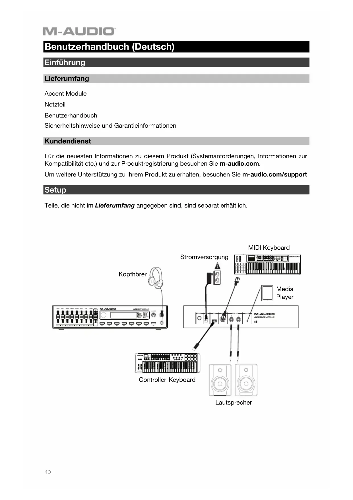 Benutzerhandbuch (Deutsch) Einführung Lieferumfang Accent Module Netzteil Benutzerhandbuch Sicherheitshinweise und Garantieinformationen Kundendienst Für die neuesten Informationen zu diesem Produkt (Systemanforderungen, Informationen zur Kompatibilität etc.) und zur Produktregistrierung besuchen Sie m-audio.com. Um weitere Unterstützung zu Ihrem Produkt zu erhalten, besuchen Sie m-audio.com/support Setup Teile, die nicht im Lieferumfang angegeben sind, sind separat erhältlich.