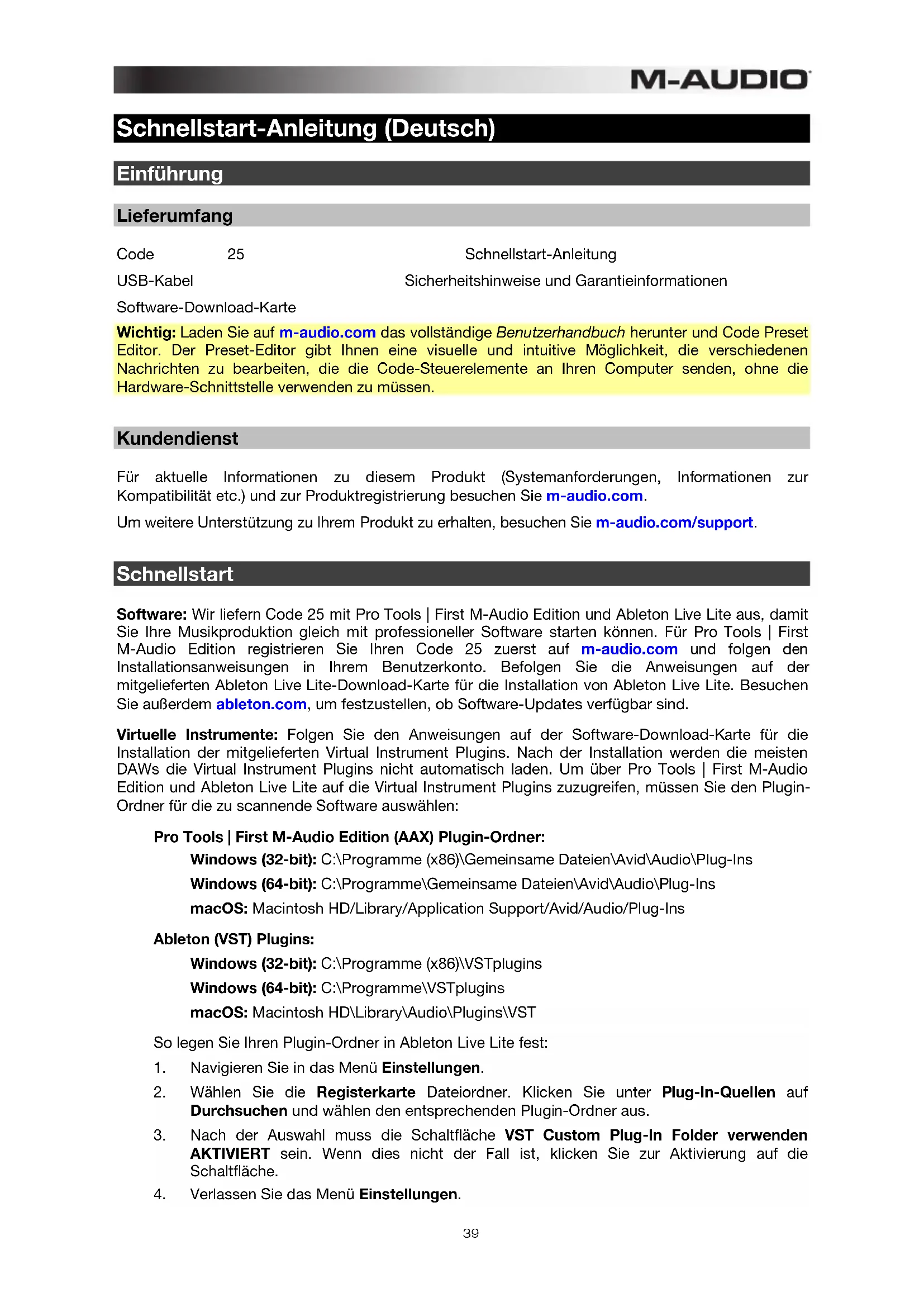 Schnellstart-Anleitung (Deutsch) Einführung Lieferumfang Code 25 Schnellstart-Anleitung USB-Kabel Sicherheitshinweise und Garantieinformationen Software-Download-Karte Wichtig: Laden Sie auf m-audio.com das vollständige Benutzerhandbuch herunter und Code Preset Editor. Der Preset-Editor gibt Ihnen eine visuelle und intuitive Möglichkeit, die verschiedenen Nachrichten zu bearbeiten, die die Code-Steuerelemente an Ihren Computer senden, ohne die Hardware-Schnittstelle verwenden zu müssen. Kundendienst Für aktuelle Informationen zu diesem Produkt (Systemanforderungen, Informationen zur Kompatibilität etc.) und zur Produktregistrierung besuchen Sie m-audio.com. Um weitere Unterstützung zu Ihrem Produkt zu erhalten, besuchen Sie m-audio.com/support. Schnellstart Software: Wir liefern Code 25 mit Pro Tools | First M-Audio Edition und Ableton Live Lite aus, damit Sie Ihre Musikproduktion gleich mit professioneller Software starten können. Für Pro Tools | First M-Audio Edition registrieren Sie Ihren Code 25 zuerst auf m-audio.com und folgen den Installationsanweisungen in Ihrem Benutzerkonto. Befolgen Sie die Anweisungen auf der mitgelieferten Ableton Live Lite-Download-Karte für die Installation von Ableton Live Lite. Besuchen Sie außerdem ableton.com, um festzustellen, ob Software-Updates verfügbar sind. Virtuelle Instrumente: Folgen Sie den Anweisungen auf der Software-Download-Karte für die Installation der mitgelieferten Virtual Instrument Plugins. Nach der Installation werden die meisten DAWs die Virtual Instrument Plugins nicht automatisch laden. Um über Pro Tools | First M-Audio Edition und Ableton Live Lite auf die Virtual Instrument Plugins zuzugreifen, müssen Sie den Plugin- Ordner für die zu scannende Software auswählen: Pro Tools | First M-Audio Edition (AAX) Plugin-Ordner: Windows (32-bit): C:\Programme (x86)\Gemeinsame Dateien\Avid\Audio\Plug-Ins Windows (64-bit): C:\Programme\Gemeinsame Dateien\Avid\Audio\Plug-Ins macOS: Macintosh HD/Library/Application Support/Avid/Audio/Plug-Ins Ableton (VST) Plugins: Windows (32-bit): C:\Programme (x86)\VSTplugins Windows (64-bit): C:\Programme\VSTplugins macOS: Macintosh HD\Library\Audio\Plugins\VST So legen Sie Ihren Plugin-Ordner in Ableton Live Lite fest: