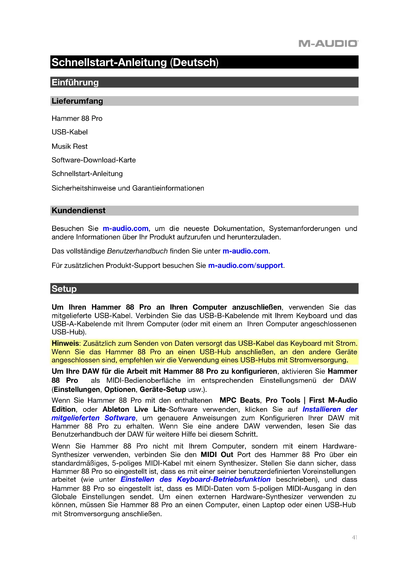 Laden Sie die Anleitung für Ihr Tastatur kostenlos im PDF-Format! Finden Sie Ihr Handbuch Hammer 88 Pro - M-AUDIO und nehmen Sie Ihr elektronisches Gerät wieder in die Hand. Auf dieser Seite sind alle Dokumente veröffentlicht, die für die Verwendung Ihres Geräts notwendig sind. Hammer 88 Pro von der Marke M-AUDIO.