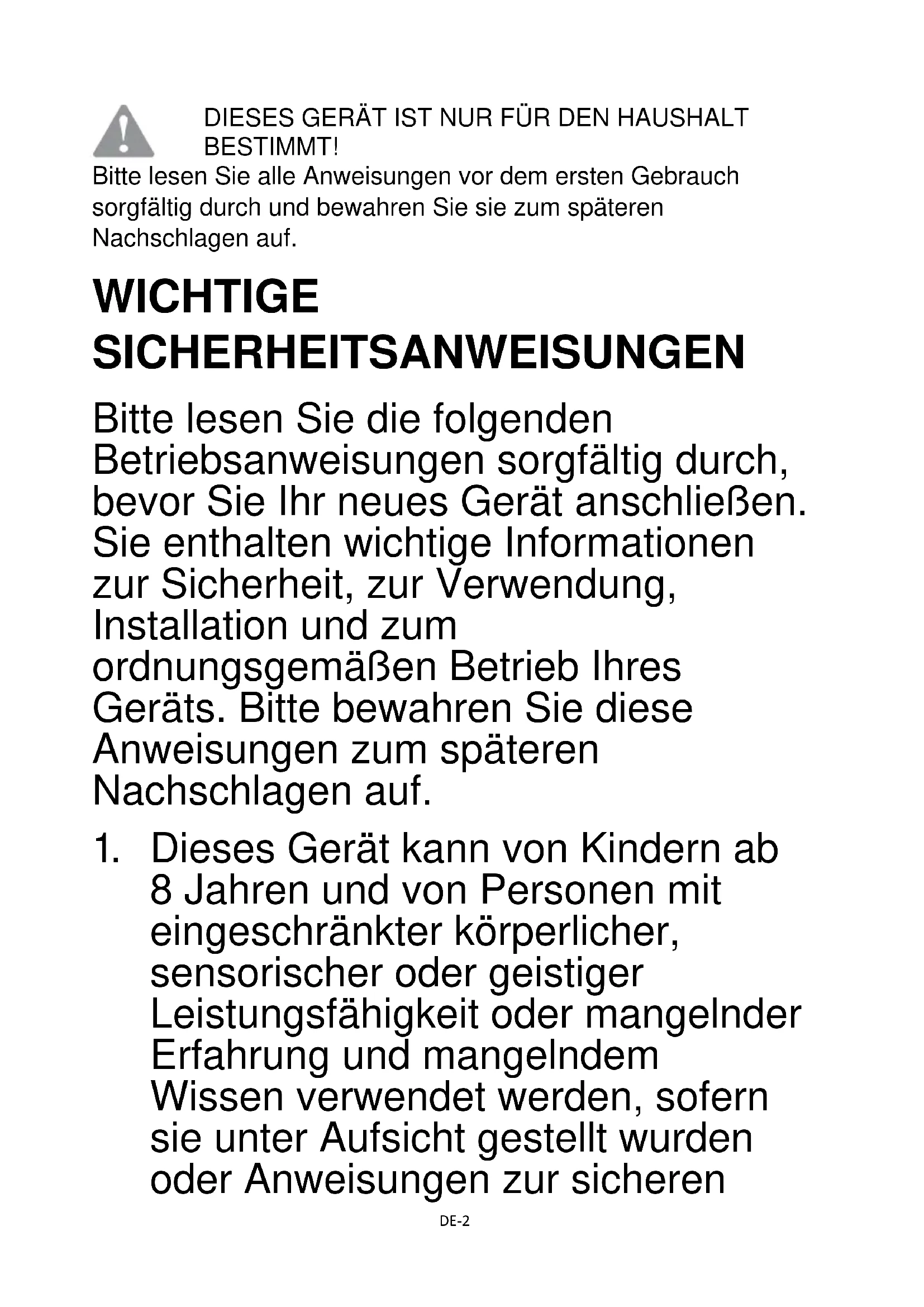 Dieses Gerät kann von Kindern ab 8 Jahren und von Personen mit eingeschränkter körperlicher, sensorischer oder geistiger Leistungsfähigkeit oder mangelnder Erfahrung und mangelndem Wissen verwendet werden, sofern sie unter Aufsicht gestellt wurden oder Anweisungen zur sicherenDE-3 Verwendung des Geräts erhalten haben Sie verstehen die Gefahren. Kinder dürfen nicht mit dem Gerät spielen. Reinigung und Wartung durch den Benutzer dürfen nicht von Kindern ohne Aufsicht durchgeführt werden.