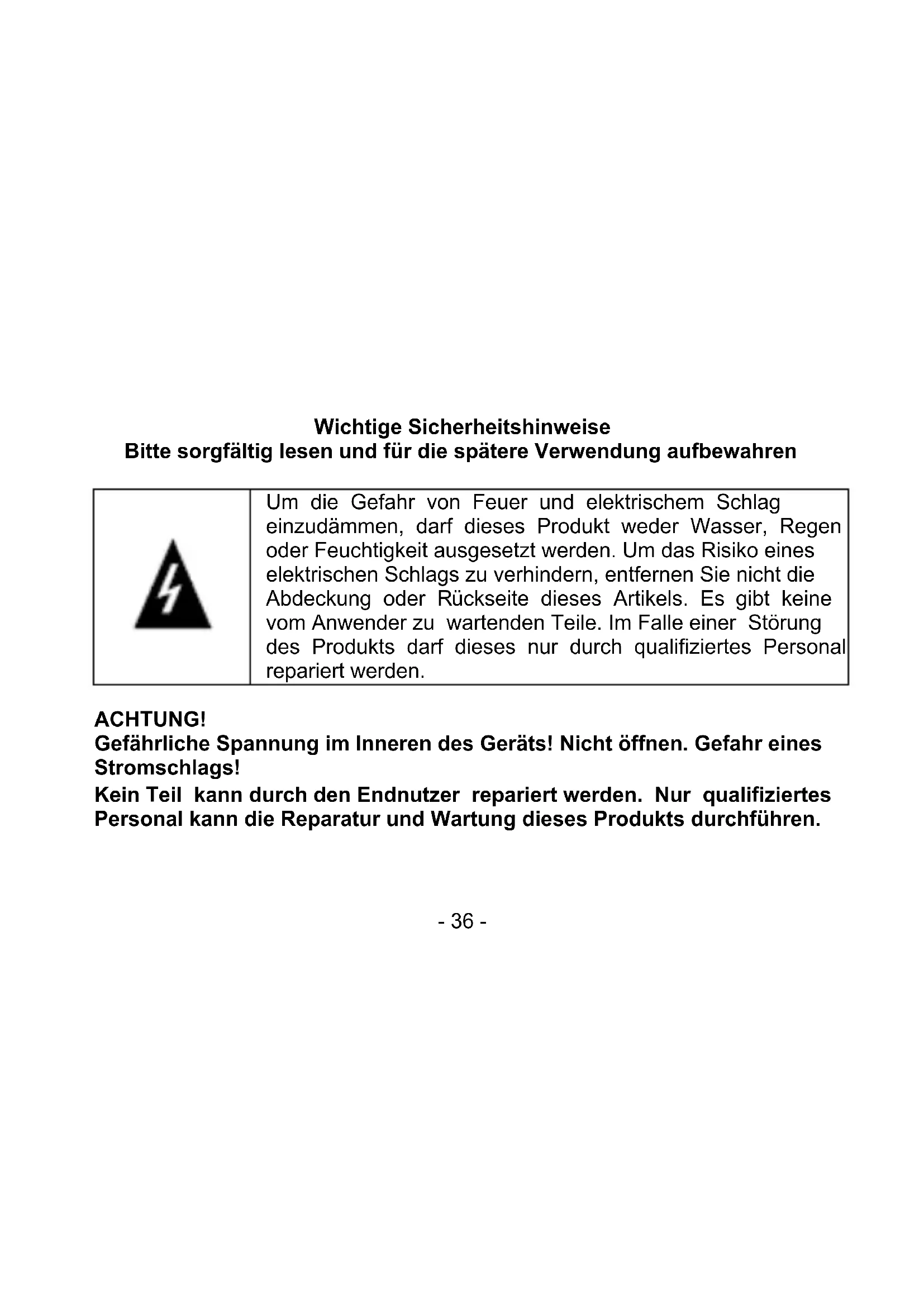 Um die Gefahr von Feuer und elektrischem Schlag einzudämmen, darf dieses Produkt weder Wasser, Regen oder Feuchtigkeit ausgesetzt werden. Um das Risiko eines elektrischen Schlags zu verhindern, entfernen Sie nicht die Abdeckung oder Rückseite dieses Artikels. Es gibt keine vom Anwender zu wartenden Teile. Im Falle einer Störung des Produkts darf dieses nur durch qualifiziertes Personal repariert werden.