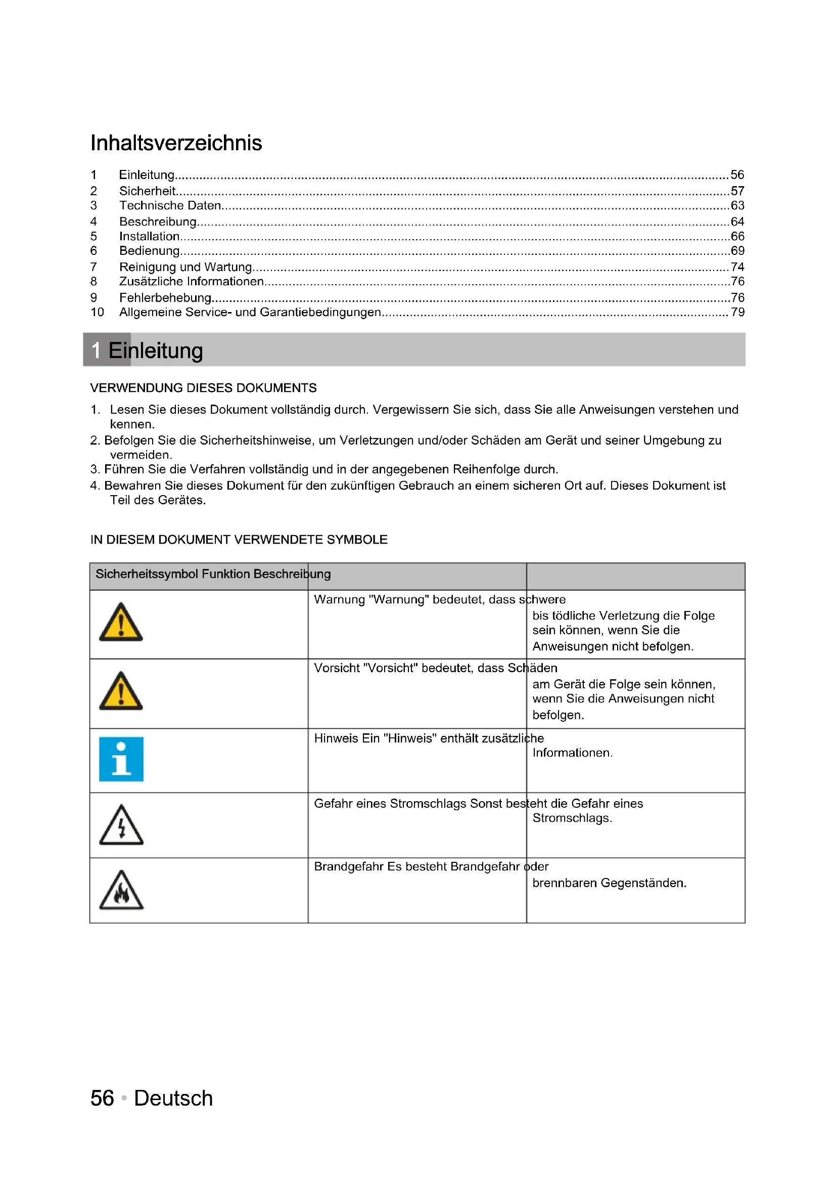 Sicherheitssymbol Funktion Beschreibung Warnung "Warnung" bedeutet, dass schwere bis tödliche Verletzung die Folge sein können, wenn Sie die Anweisungen nicht befolgen. Vorsicht "Vorsicht" bedeutet, dass Schäden am Gerät die Folge sein können, wenn Sie die Anweisungen nicht befolgen. Hinweis Ein "Hinweis" enthält zusätzliche Informationen. Gefahr eines Stromschlags Sonst besteht die Gefahr eines Stromschlags. Brandgefahr Es besteht Brandgefahr oder brennbaren Gegenständen. 56 • Deutsch2 Sicherheit ALLGEMEINE SICHERHEITSHINWEISE