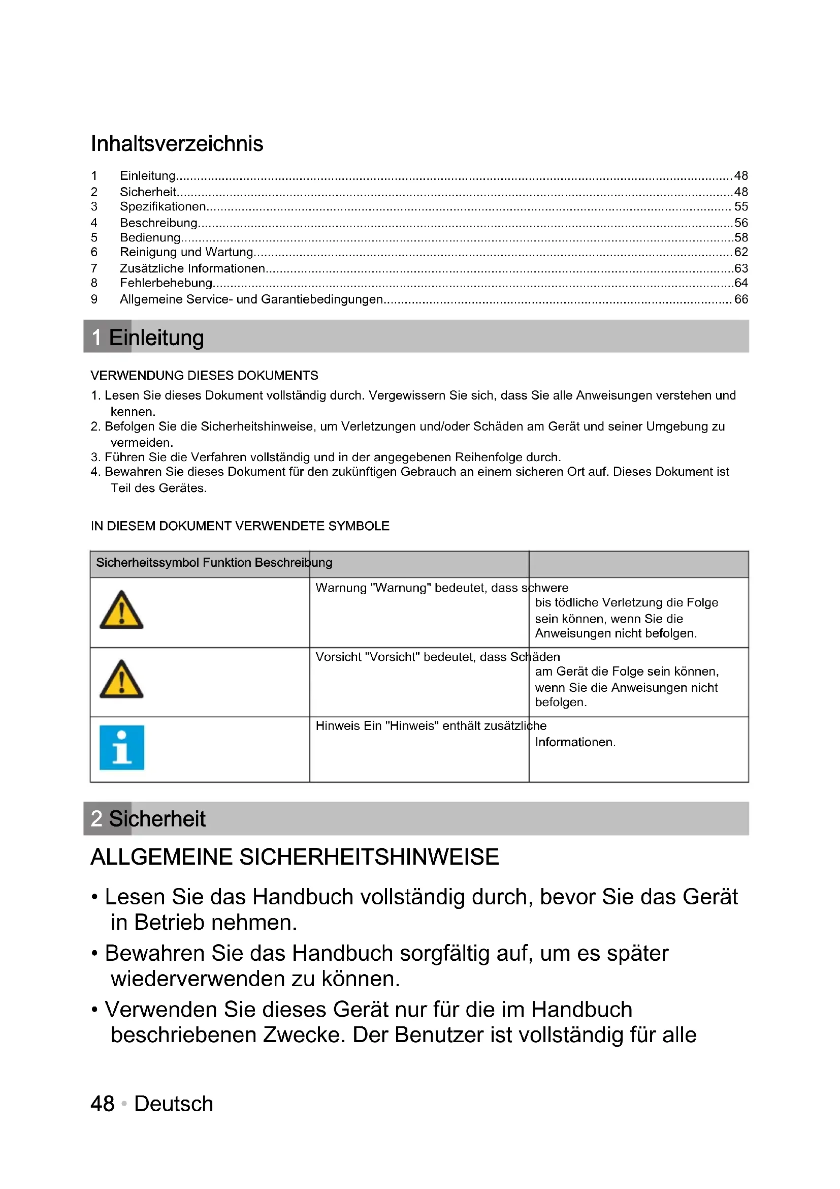 - Lesen Sie das Handbuch vollständig durch, bevor Sie das Gerät in Betrieb nehmen.