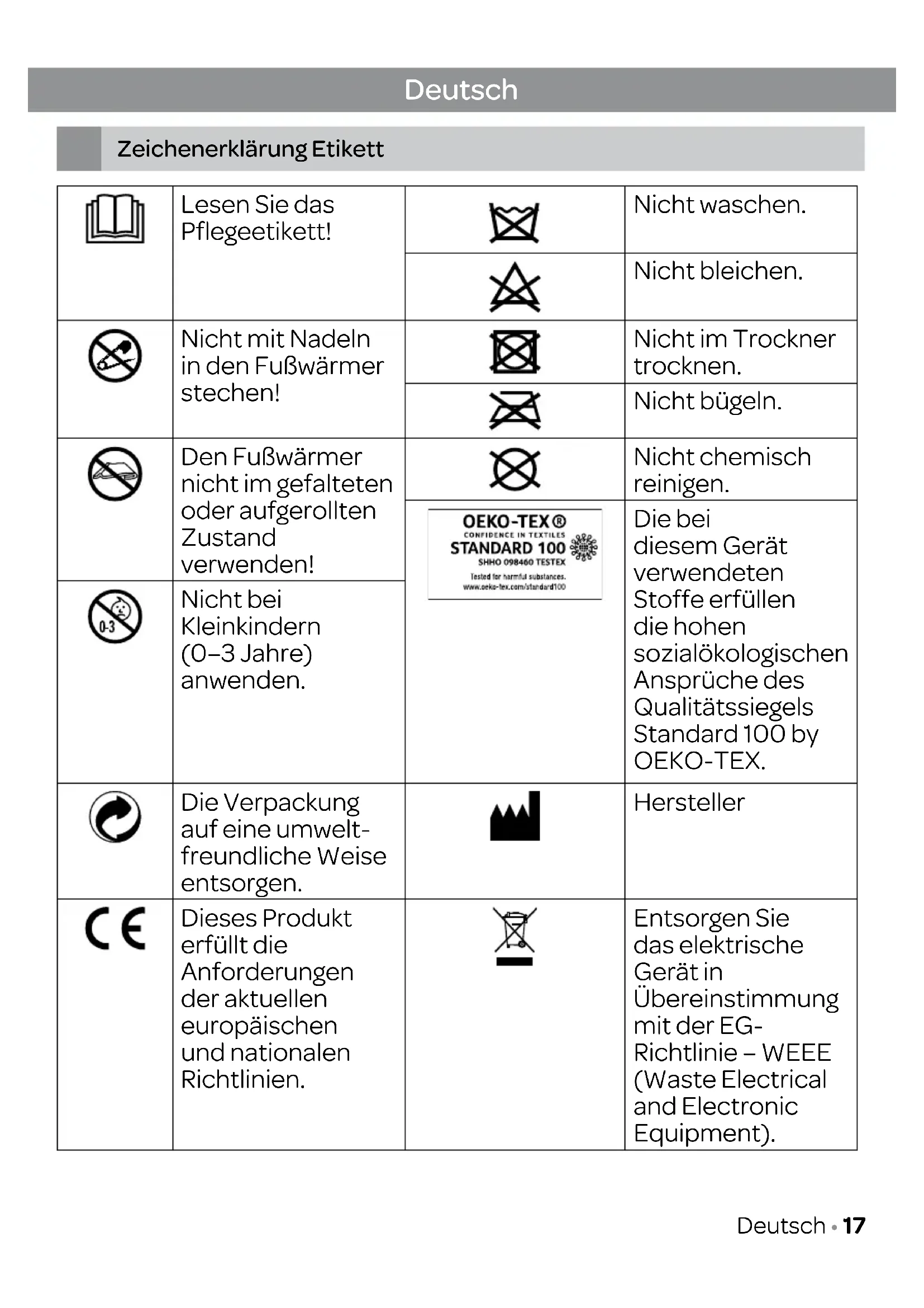 Legislation requires that all electrical and electronic equipment must be collected for reuse and recycling. Electrical and electronic equipment marked with the symbol indicating separate collection of such equipment must be returned to a municipal waste collection point. 16 • EnglishLesen Sie das Pflegeetikett! Nicht waschen. Nicht bleichen. Nicht mit Nadeln in den Fußwärmer stechen! Nicht im Trockner trocknen. Nicht bügeln. Den Fußwärmer nicht im gefalteten oder aufgerollten Zustand verwenden! Nicht chemisch reinigen. Die bei diesem Gerät verwendeten Stoffe erfüllen die hohen sozialökologischen Ansprüche des Qualitätssiegels Standard 100 by OEKO-TEX. Nicht bei Kleinkindern (0–3Jahre) anwenden. Die Verpackung auf eine umwelt- freundliche Weise entsorgen. Hersteller Dieses Produkt erfüllt die Anforderungen der aktuellen europäischen und nationalen Richtlinien. Entsorgen Sie das elektrische Gerät in Übereinstimmung mit der EG- Richtlinie – WEEE (Waste Electrical and Electronic Equipment). Deutsch Zeichenerklärung Etikett Deutsch • 17Das Gerät ist doppelt isoliert und entspricht Schutzklasse 2. WARNUNG; Warnung vor Verletzungsgefahr oder Gefahr für Ihre Gesundheit. VORSICHT; Sicherheitswarnung vor möglichen Schäden am Produkt oder an Zubehörteilen. ACHTUNG; Wichtige Informationen. 18 • DeutschSicherheitshinweise