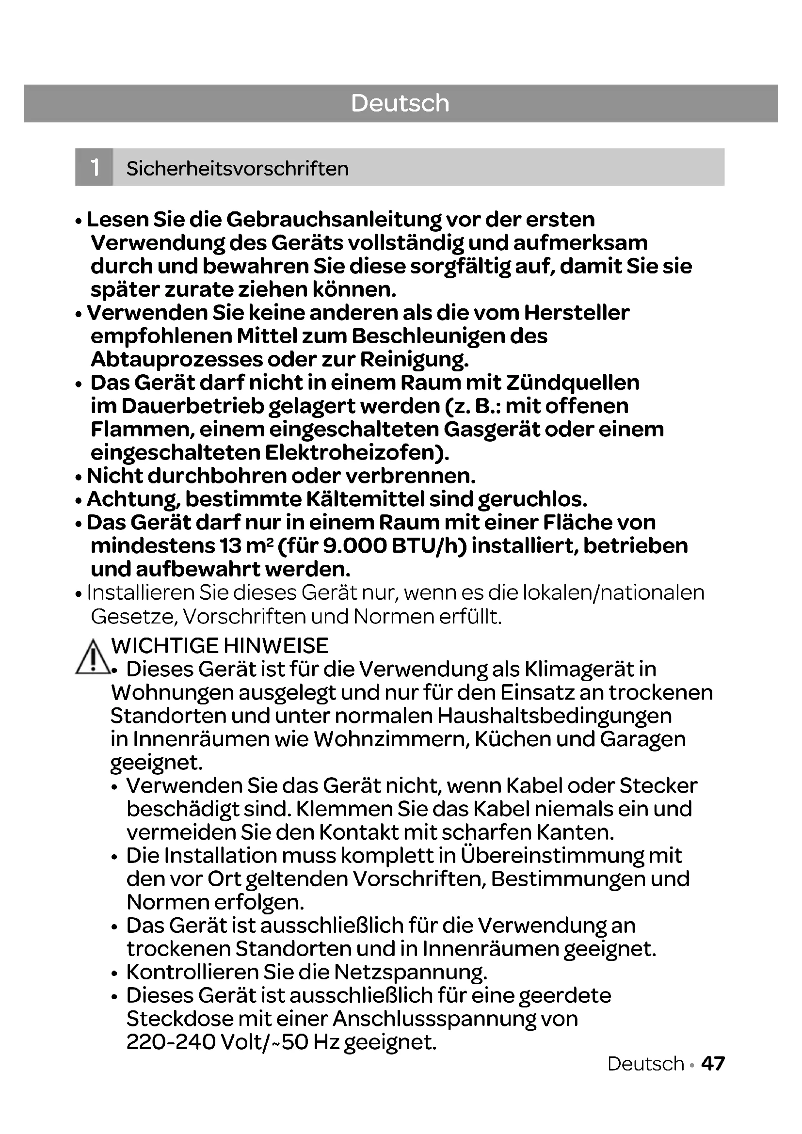 - Das Gerät muss in einem Raum installiert, verwendet und gelagert werden, der größer als 13 m