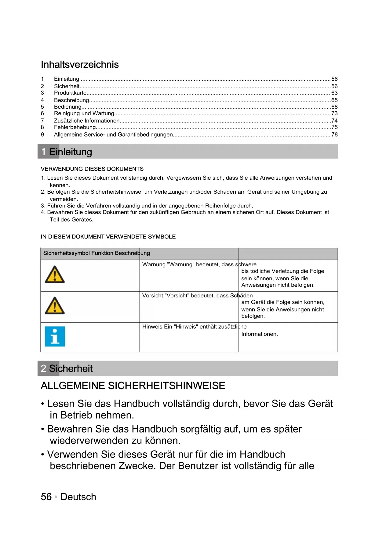 - Lesen Sie das Handbuch vollständig durch, bevor Sie das Gerät in Betrieb nehmen.
