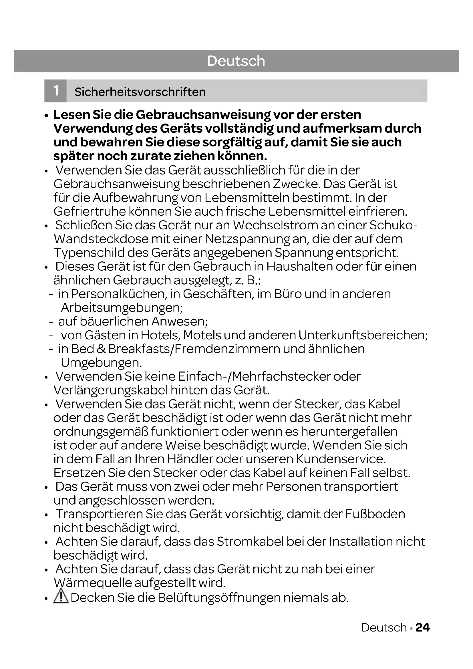 - Verwenden Sie das Gerät ausschließlich für die in der Gebrauchsanweisung beschriebenen Zwecke. Das Gerät ist für die Aufbewahrung von Lebensmitteln bestimmt. In der Gefriertruhe können Sie auch frische Lebensmittel einfrieren.