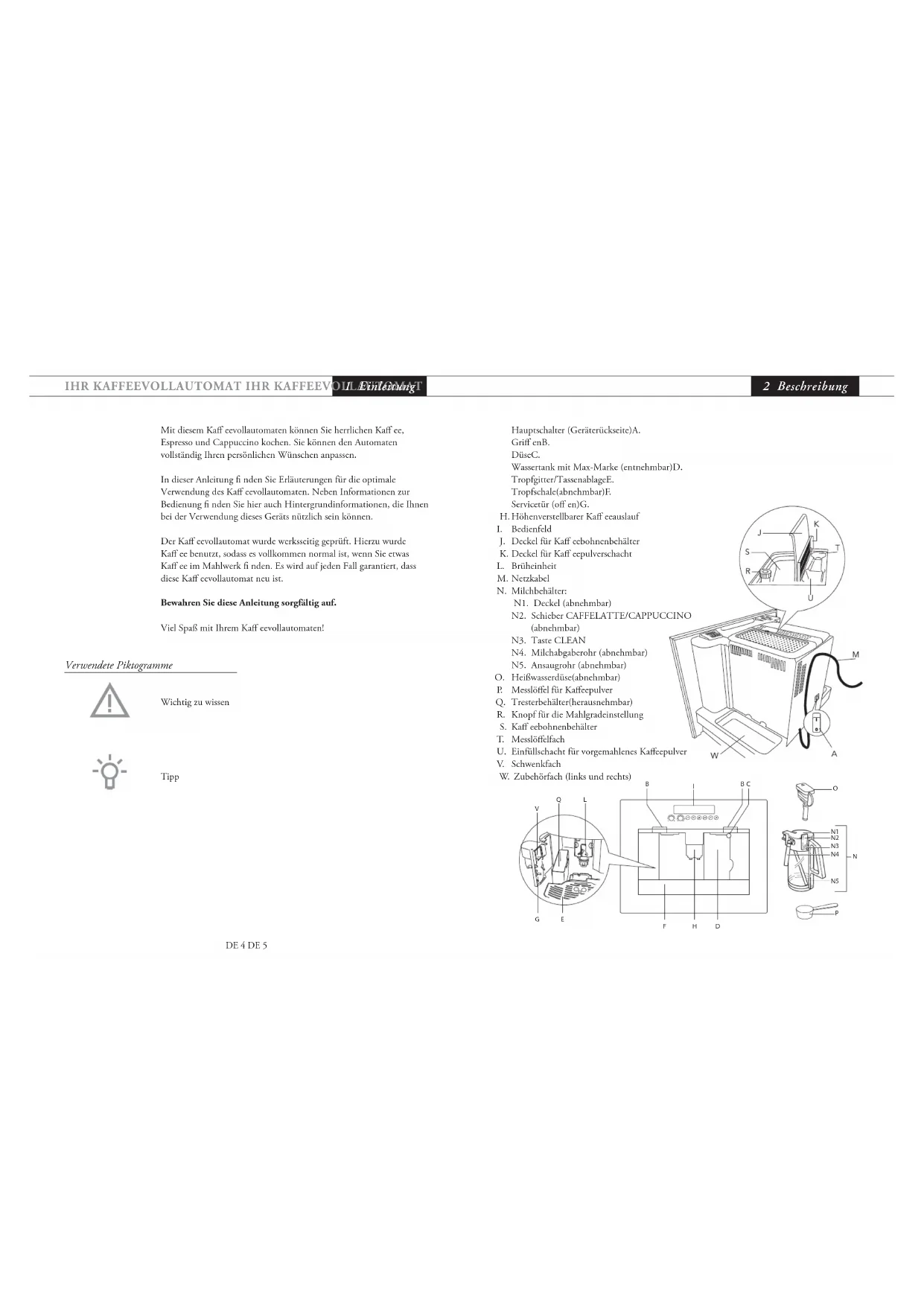 Hauptschalter (Geräterückseite)A. Griff enB. DüseC. Wassertank mit Max-Marke (entnehmbar)D. Tropfgitter/TassenablageE. Tropfschale (abnehmbar)F. Servicetür (off en)G. Höhenverstellbarer Kaff eeauslaufH. BedienfeldI. Deckel für Kaff eebohnenbehälterJ. Deckel für Kaff eepulverschachtK. BrüheinheitL. NetzkabelM. Milchbehälter:N. N1. Deckel (abnehmbar) N2. Schieber CAFFELATTE/CAPPUCCINO (abnehmbar) N3. Taste CLEAN N4. Milchabgaberohr (abnehmbar) N5. Ansaugrohr (abnehmbar) Heißwasserdüse (abnehmbar)O. Messlöff el für Kaff eepulverP. Tresterbehälter (herausnehmbar)Q. Knopf für die MahlgradeinstellungR. Kaff eebohnenbehälterS. Messlöff elfachT. Einfüllschacht für vorgemahlenes Kaff eepulverU. SchwenkfachV. Zubehörfach (links und rechts)W.