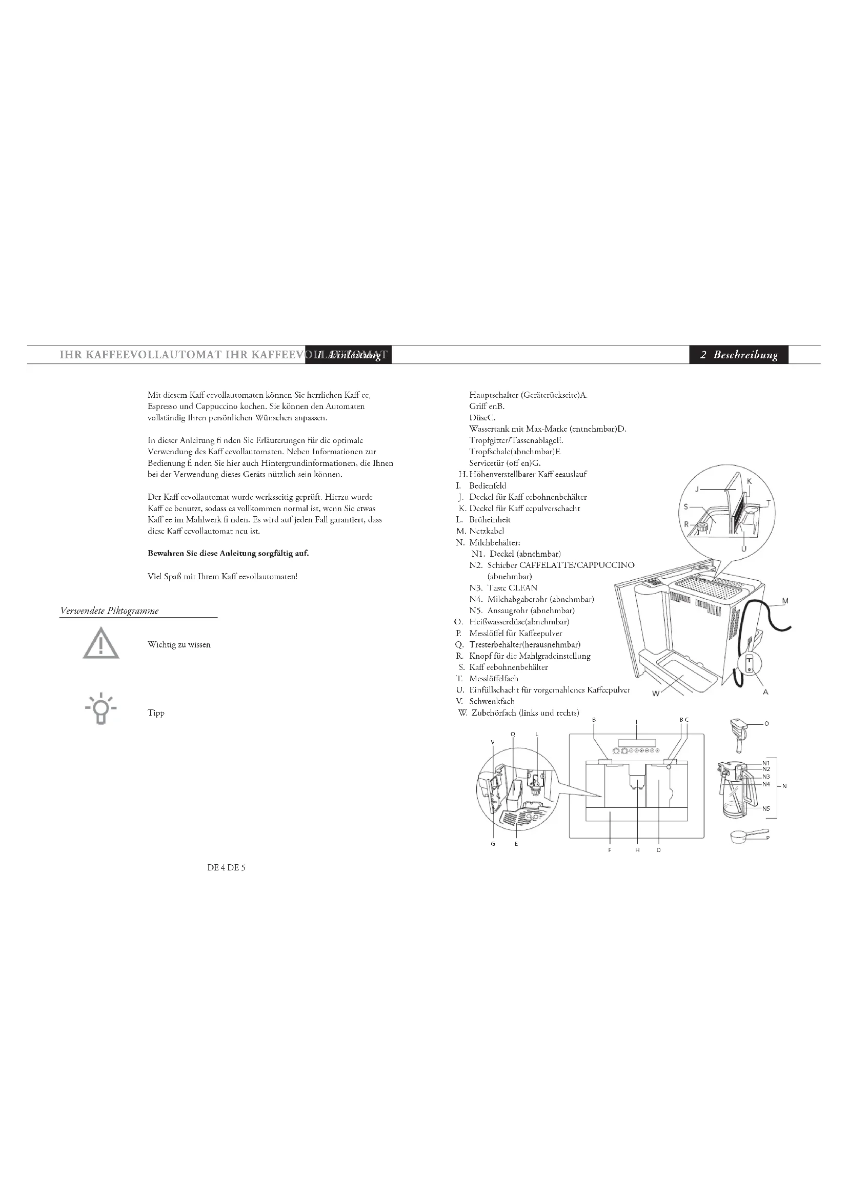 2 Beschreibung Mit diesem Kaff eevollautomaten können Sie herrlichen Kaff ee, Espresso und Cappuccino kochen. Sie können den Automaten vollständig Ihren persönlichen Wünschen anpassen. In dieser Anleitung fi nden Sie Erläuterungen für die optimale Verwendung des Kaff eevollautomaten. Neben Informationen zur Bedienung fi nden Sie hier auch Hintergrundinformationen, die Ihnen bei der Verwendung dieses Geräts nützlich sein können. Der Kaff eevollautomat wurde werksseitig geprüft. Hierzu wurde Kaff ee benutzt, sodass es vollkommen normal ist, wenn Sie etwas Kaff ee im Mahlwerk fi nden. Es wird auf jeden Fall garantiert, dass diese Kaff eevollautomat neu ist. Bewahren Sie diese Anleitung sorgfältig auf. Viel Spaß mit Ihrem Kaff eevollautomaten! Verwendete Piktogramme Wichtig zu wissen Tipp 1 EinleitungDE 6 DE 7