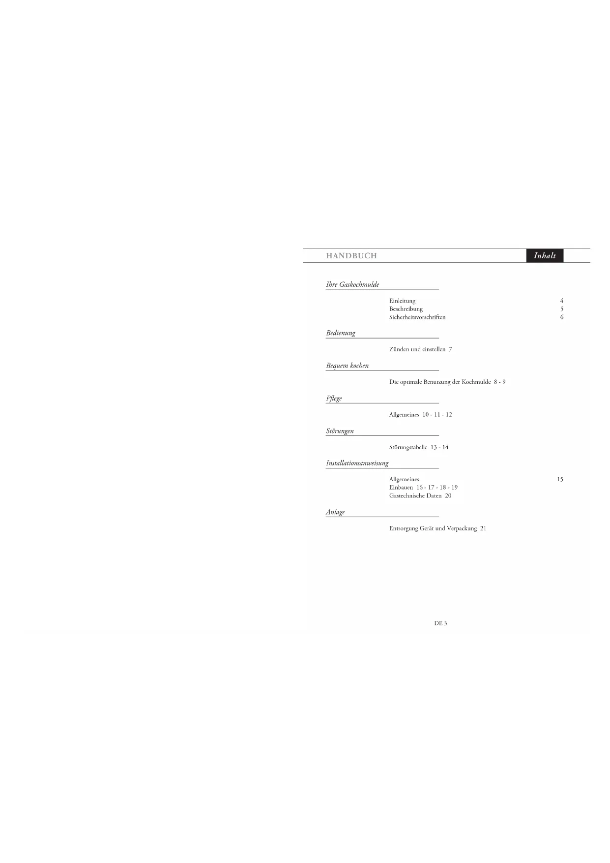 ur Erinnerung an die Verpflichtung, die Elektrohaushaltsgeräte getrennt zu beseitigen, ist das Produkt mit einer Mülltonne, die durchgestrichen ist, gekennzeichnet. Dies bedeutet das am Ende seiner Nutzzeit das Produkt NICHT zusammen mit dem Siedlungsabfall beseitigt werden darf. Es kann zu den eigens von den städtischen Behörden eingerichteten Sammelstellen oder zu den Fachhändlern, die einen Rücknahmeservice anbieten, gebracht werden. Die getrennte Entsorgung eines Haushaltsgerätes vermeidet mögliche negative Auswirkungen auf die Umwelt und die menschliche Gesundheit, die durch eine nicht vorschriftsmäßige Entsorgung bedingt sind. Zudem ermöglicht wird die Wiederverwertung der Materialien, aus denen sich das Gerät zusammensetzt, was wiederum eine bedeutende Einsparung an Energie und Ressourcen mit sich bringt. Technische Daten Auf der Datenplakette an der Unterseite des Geräts finden Sie den Anschlusswert, die erforderliche Spannung und die Frequenz.GB 3 MANUAL Contents Your gas hob Introduction 4 Description 5 Safety instructions 6 Controls Igniting and adjusting 7 Comfortable cooking Optimal use of the hob 8 - 9 Maintenance General 10 - 11 - 12 Faults Faults table 13 - 14 Installation instructions General 15 Building in 16 - 17 - 18 - 19 Gas information 20 Appendix Disposal of packaging and appliance 21GB 4 GB 5 Description