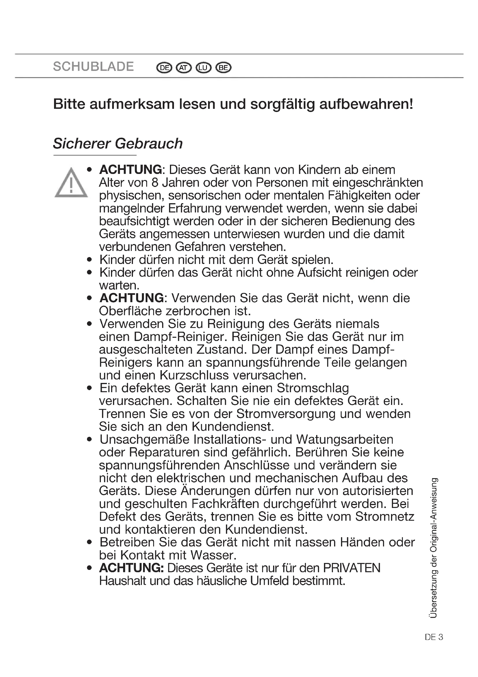 - Missbrauchen Sie das Gerät nicht als Arbeits-, Stell-oder Sitzfläche. Positionieren Sie nichts auf dem Glasdeckel des Geräts, insbesondere keine extrem halten oder kalten Objekte. Achten Sie daraufuf, dass keine Gegenstände auf den Glasdeckel fallen. Er könnte beschädigt werden. Bei Nichtgebrauch des Geräts, schreiben Sie die Schublade. Bei Gebrauch, öffnen und schreiben Sie diese langsam und ziehen bzw. schiben Sie diese bis zum Anschlag aus bzw. ein.