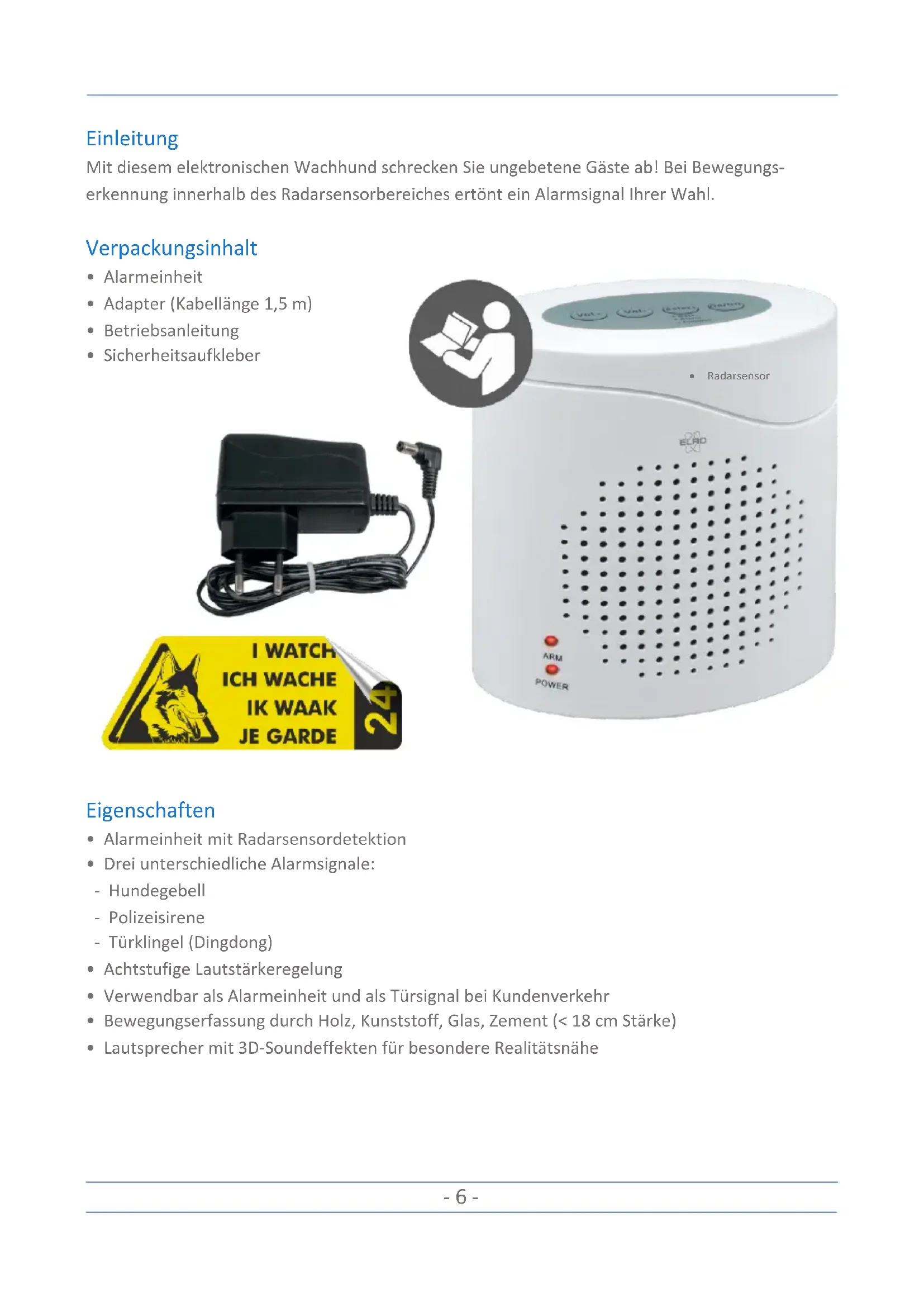 - Senden Sie eine E-Mail an info@elro.eu. Wir werden uns schnellstmöglich bei Ihnen melden. Die auf dieses Produkt anwendbaren Garantiebedingungen finden Sie auf www.elro.eu. Dieses Produkt wurde hergestellt von: ELRO Europe Postbus 9607 - Box E800 1006 GC Amsterdam Nederland www.elro.eu- 10 - Introductie Schrik ongewenste gasten af met deze elektronische waakhond! Als er beweging wordt waargenomen binnen het bereik van de radarsensor, treedt het alarmsignaal naar keuze in werking. Inhoud van de verpakking
