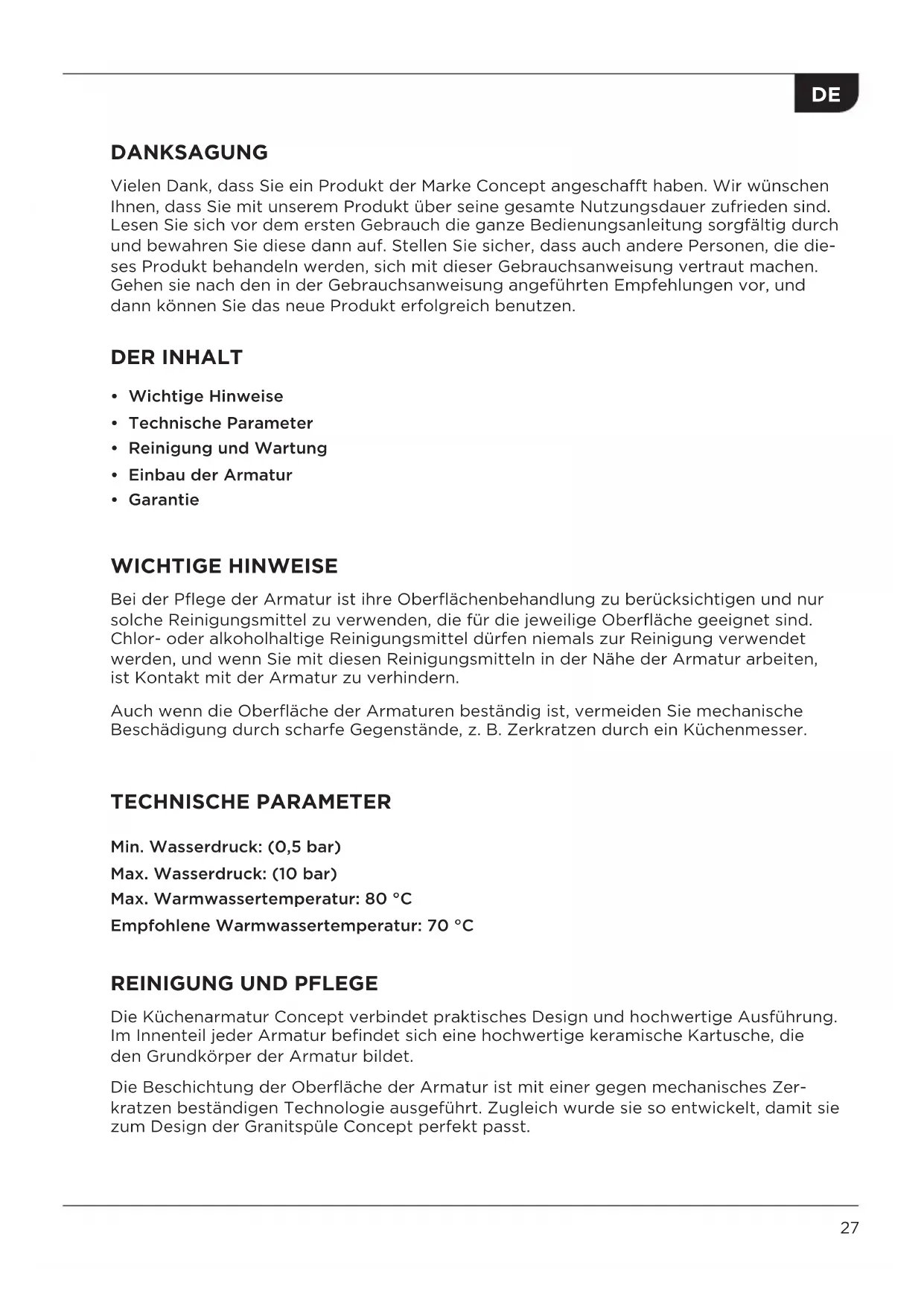 - Garantie WICHTIGE HINWEISE Bei der Pflege der Armatur ist ihre Oberflächenbehandlung zu berücksichtigen und nur solche Reinigungsmittel zu verwenden, die für die jeweilige Oberfläche geeignet sind. Chlor- oder alkoholhaltige Reinigungsmittel dürfen niemals zur Reinigung verwendet werden, und wenn Sie mit diesen Reinigungsmitteln in der Nähe der Armatur arbeiten, ist Kontakt mit der Armatur zu verhindern. Auch wenn die Oberfläche der Armaturen beständig ist, vermeiden Sie mechanische Beschädigung durch scharfe Gegenstände, z. B. Zerkratzen durch ein Küchenmesser. TECHNISCHE PARAMETER Min. Wasserdruck: (0,5 bar) Max. Wasserdruck: (10 bar) Max. Warmwassertemperatur: 80 °C Empfohlene Warmwassertemperatur: 70 °C
