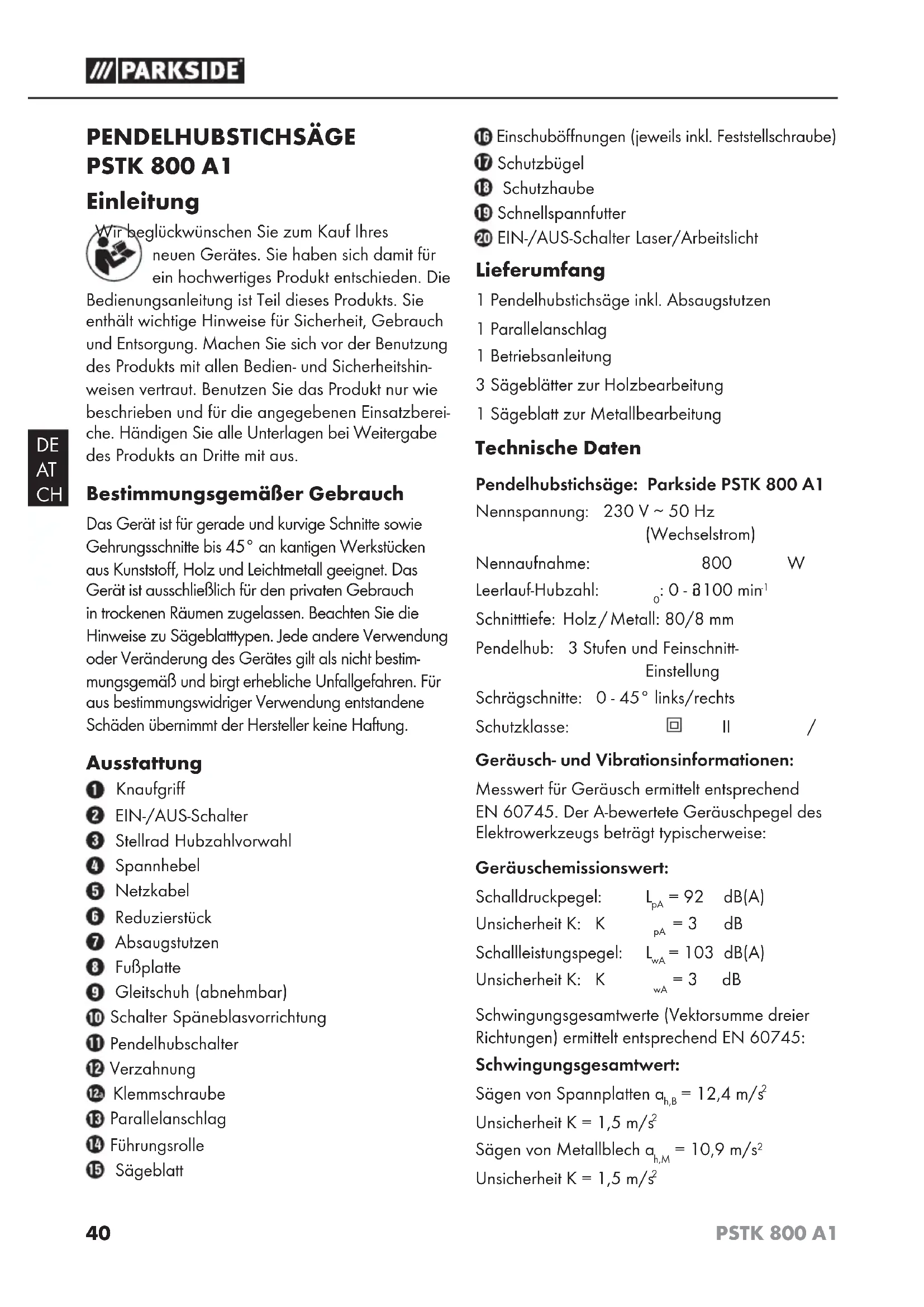 PENDELHUBSTICHSÄGE PSTK 800 A1 Einleitung Wir beglückwünschen Sie zum Kauf Ihres neuen Gerätes. Sie haben sich damit für ein hochwertiges Produkt entschieden. Die Bedienungsanleitung ist Teil dieses Produkts. Sie enthält wichtige Hinweise für Sicherheit, Gebrauch und Entsorgung. Machen Sie sich vor der Benutzung des Produkts mit allen Bedien- und Sicherheitshin- weisen vertraut. Benutzen Sie das Produkt nur wie beschrieben und für die angegebenen Einsatzberei- che. Händigen Sie alle Unterlagen bei Weitergabe des Produkts an Dritte mit aus. Bestimmungsgemäßer Gebrauch Das Gerät ist für gerade und kurvige Schnitte sowie Gehrungsschnitte bis 45° an kantigen Werkstücken aus Kunststoff, Holz und Leichtmetall geeignet. Das Gerät ist ausschließlich für den privaten Gebrauch in trockenen Räumen zugelassen. Beachten Sie die Hinweise zu Sägeblatttypen. Jede andere Verwendung oder Veränderung des Gerätes gilt als nicht bestim- mungsgemäß und birgt erhebliche Unfallgefahren. Für aus bestimmungswidriger Verwendung entstandene Schäden übernimmt der Hersteller keine Haftung. Ausstattung Knaufgriff EIN-/AUS-Schalter Stellrad Hubzahlvorwahl Spannhebel Netzkabel Reduzierstück Absaugstutzen Fußplatte Gleitschuh (abnehmbar) Schalter Späneblasvorrichtung Pendelhubschalter Verzahnung Klemmschraube Parallelanschlag Führungsrolle Sägeblatt Einschuböffnungen (jeweils inkl. Feststellschraube) Schutzbügel Schutzhaube Schnellspannfutter EIN-/AUS-Schalter Laser/Arbeitslicht Lieferumfang 1 Pendelhubstichsäge inkl. Absaugstutzen 1 Parallelanschlag 1 Betriebsanleitung 3 Sägeblätter zur Holzbearbeitung 1 Sägeblatt zur Metallbearbeitung Technische Daten Pendelhubstichsäge: Parkside PSTK 800 A1 Nennspannung: 230 V ∼ 50 Hz (Wechselstrom) Nennaufnahme: 800 W Leerlauf-Hubzahl: n