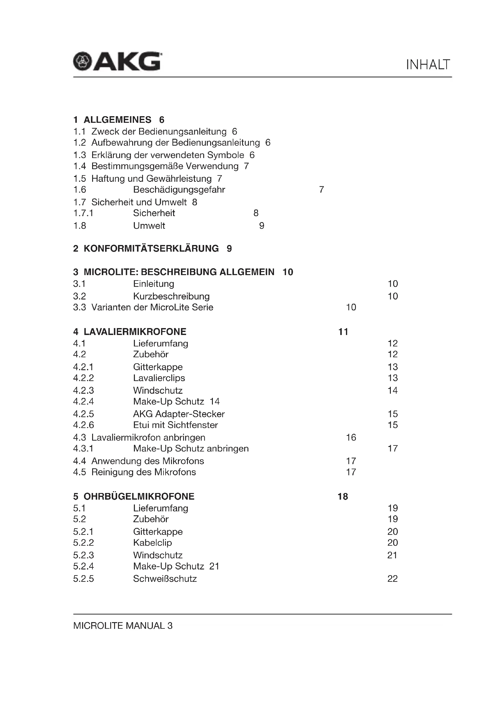 - Verwenden Sie das Gerät nur für die in der Bedienungsanleitung beschriebenen Anwendungen. Für Schäden infolge unsachgemäßer Handhabung oder missbräuchlicher Verwendung kann AKG keine Haftung übernehmen. SicherheitMICROLITE MANUAL 9 KONfORMITäTSERKLäRuNg