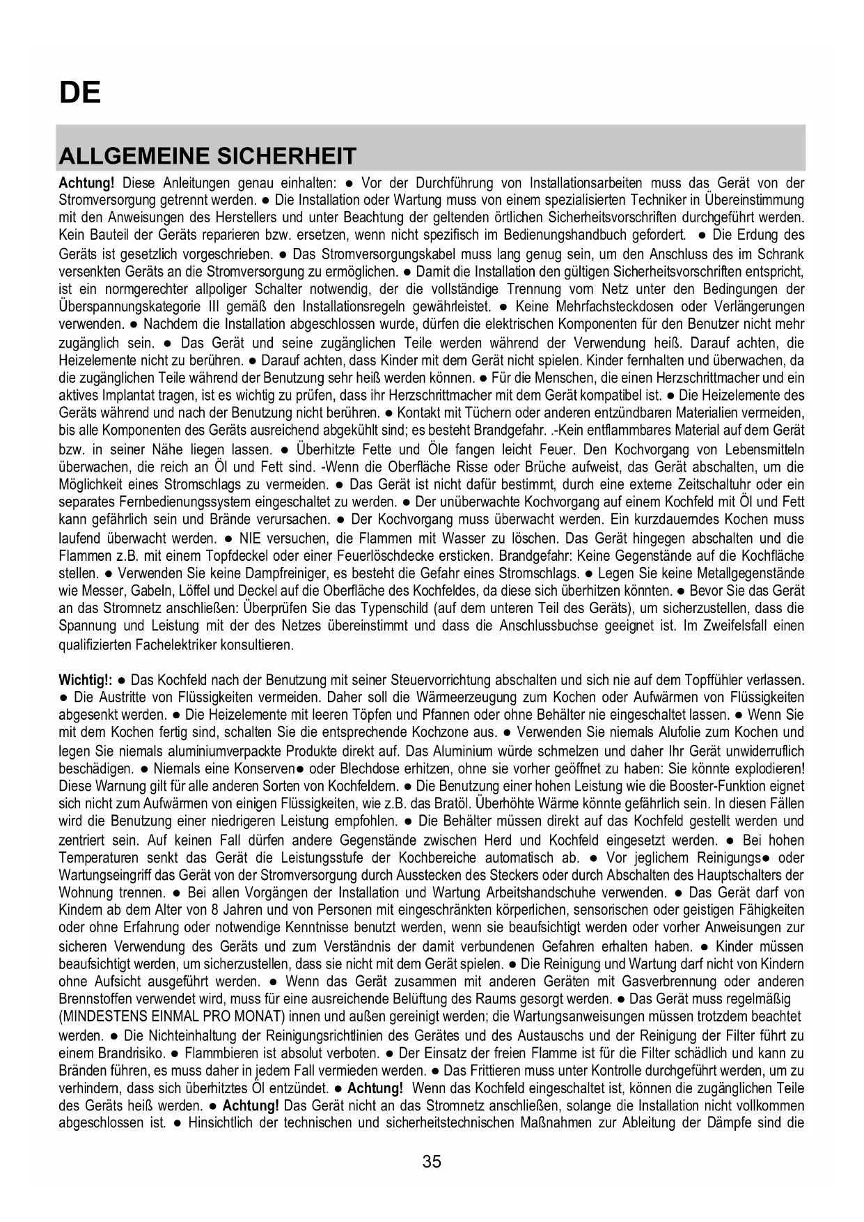 ALLGEMEINE SICHERHEIT Achtung! Diese Anleitungen genau einhalten: ● Vor der Durchführung von Installationsarbeiten muss das Gerät von der Stromversorgung getrennt werden. ● Die Installation oder Wartung muss von einem spezialisierten Techniker in Übereinstimmung mit den Anweisungen des Herstellers und unter Beachtung der geltenden örtlichen Sicherheitsvorschriften durchgeführt werden. Kein Bauteil der Geräts reparieren bzw. ersetzen, wenn nicht spezifisch im Bedienungshandbuch gefordert. ● Die Erdung des Geräts ist gesetzlich vorgeschrieben. ● Das Stromversorgungskabel muss lang genug sein, um den Anschluss des im Schrank versenkten Geräts an die Stromversorgung zu ermöglichen. ● Damit die Installation den gültigen Sicherheitsvorschriften entspricht, ist ein normgerechter allpoliger Schalter notwendig, der die vollständige Trennung vom Netz unter den Bedingungen der Überspannungskategorie III gemäß den Installationsregeln gewährleistet. ● Keine Mehrfachsteckdosen oder Verlängerungen verwenden. ● Nachdem die Installation abgeschlossen wurde, dürfen die elektrischen Komponenten für den Benutzer nicht mehr zugänglich sein. ● Das Gerät und seine zugänglichen Teile werden während der Verwendung heiß. Darauf achten, die Heizelemente nicht zu berühren. ● Darauf achten, dass Kinder mit dem Gerät nicht spielen. Kinder fernhalten und überwachen, da die zugänglichen Teile während der Benutzung sehr heiß werden können. ● Für die Menschen, die einen Herzschrittmacher und ein aktives Implantat tragen, ist es wichtig zu prüfen, dass ihr Herzschrittmacher mit dem Gerät kompatibel ist. ● Die Heizelemente des Geräts während und nach der Benutzung nicht berühren. ● Kontakt mit Tüchern oder anderen entzündbaren Materialien vermeiden, bis alle Komponenten des Geräts ausreichend abgekühlt sind; es besteht Brandgefahr. .-Kein entflammbares Material auf dem Gerät bzw. in seiner Nähe liegen lassen. ● Überhitzte Fette und Öle fangen leicht Feuer. Den Kochvorgang von Lebensmitteln überwachen, die reich an Öl und Fett sind. -Wenn die Oberfläche Risse oder Brüche aufweist, das Gerät abschalten, um die Möglichkeit eines Stromschlags zu vermeiden. ● Das Gerät ist nicht dafür bestimmt, durch eine externe Zeitschaltuhr oder ein separates Fernbedienungssystem eingeschaltet zu werden. ● Der unüberwachte Kochvorgang auf einem Kochfeld mit Öl und Fett kann gefährlich sein und Brände verursachen. ● Der Kochvorgang muss überwacht werden. Ein kurzdauerndes Kochen muss laufend überwacht werden. ● NIE versuchen, die Flammen mit Wasser zu löschen. Das Gerät hingegen abschalten und die Flammen z.B. mit einem Topfdeckel oder einer Feuerlöschdecke ersticken. Brandgefahr: Keine Gegenstände auf die Kochfläche stellen. ● Verwenden Sie keine Dampfreiniger, es besteht die Gefahr eines Stromschlags. ● Legen Sie keine Metallgegenstände wie Messer, Gabeln, Löffel und Deckel auf die Oberfläche des Kochfeldes, da diese sich überhitzen könnten. ● Bevor Sie das Gerät an das Stromnetz anschließen: Überprüfen Sie das Typenschild (auf dem unteren Teil des Geräts), um sicherzustellen, dass die Spannung und Leistung mit der des Netzes übereinstimmt und dass die Anschlussbuchse geeignet ist. Im Zweifelsfall einen qualifizierten Fachelektriker konsultieren. Wichtig!: ● Das Kochfeld nach der Benutzung mit seiner Steuervorrichtung abschalten und sich nie auf dem Topffühler verlassen. ● Die Austritte von Flüssigkeiten vermeiden. Daher soll die Wärmeerzeugung zum Kochen oder Aufwärmen von Flüssigkeiten abgesenkt werden. ● Die Heizelemente mit leeren Töpfen und Pfannen oder ohne Behälter nie eingeschaltet lassen. ● Wenn Sie mit dem Kochen fertig sind, schalten Sie die entsprechende Kochzone aus. ● Verwenden Sie niemals Alufolie zum Kochen und legen Sie niemals aluminiumverpackte Produkte direkt auf. Das Aluminium würde schmelzen und daher Ihr Gerät unwiderruflich beschädigen. ● Niemals eine Konserven● oder Blechdose erhitzen, ohne sie vorher geöffnet zu haben: Sie könnte explodieren! Diese Warnung gilt für alle anderen Sorten von Kochfeldern. ● Die Benutzung einer hohen Leistung wie die Booster-Funktion eignet sich nicht zum Aufwärmen von einigen Flüssigkeiten, wie z.B. das Bratöl. Überhöhte Wärme könnte gefährlich sein. In diesen Fällen wird die Benutzung einer niedrigeren Leistung empfohlen. ● Die Behälter müssen direkt auf das Kochfeld gestellt werden und zentriert sein. Auf keinen Fall dürfen andere Gegenstände zwischen Herd und Kochfeld eingesetzt werden. ● Bei hohen Temperaturen senkt das Gerät die Leistungsstufe der Kochbereiche automatisch ab. ● Vor jeglichem Reinigungs● oder Wartungseingriff das Gerät von der Stromversorgung durch Ausstecken des Steckers oder durch Abschalten des Hauptschalters der Wohnung trennen. ● Bei allen Vorgängen der Installation und Wartung Arbeitshandschuhe verwenden. ● Das Gerät darf von Kindern ab dem Alter von 8 Jahren und von Personen mit eingeschränkten körperlichen, sensorischen oder geistigen Fähigkeiten oder ohne Erfahrung oder notwendige Kenntnisse benutzt werden, wenn sie beaufsichtigt werden oder vorher Anweisungen zur sicheren Verwendung des Geräts und zum Verständnis der damit verbundenen Gefahren erhalten haben. ● Kinder müssen beaufsichtigt werden, um sicherzustellen, dass sie nicht mit dem Gerät spielen. ● Die Reinigung und Wartung darf nicht von Kindern ohne Aufsicht ausgeführt werden. ● Wenn das Gerät zusammen mit anderen Geräten mit Gasverbrennung oder anderen Brennstoffen verwendet wird, muss für eine ausreichende Belüftung des Raums gesorgt werden. ● Das Gerät muss regelmäßig (MINDESTENS EINMAL PRO MONAT) innen und außen gereinigt werden; die Wartungsanweisungen müssen trotzdem beachtet werden. ● Die Nichteinhaltung der Reinigungsrichtlinien des Gerätes und des Austauschs und der Reinigung der Filter füh