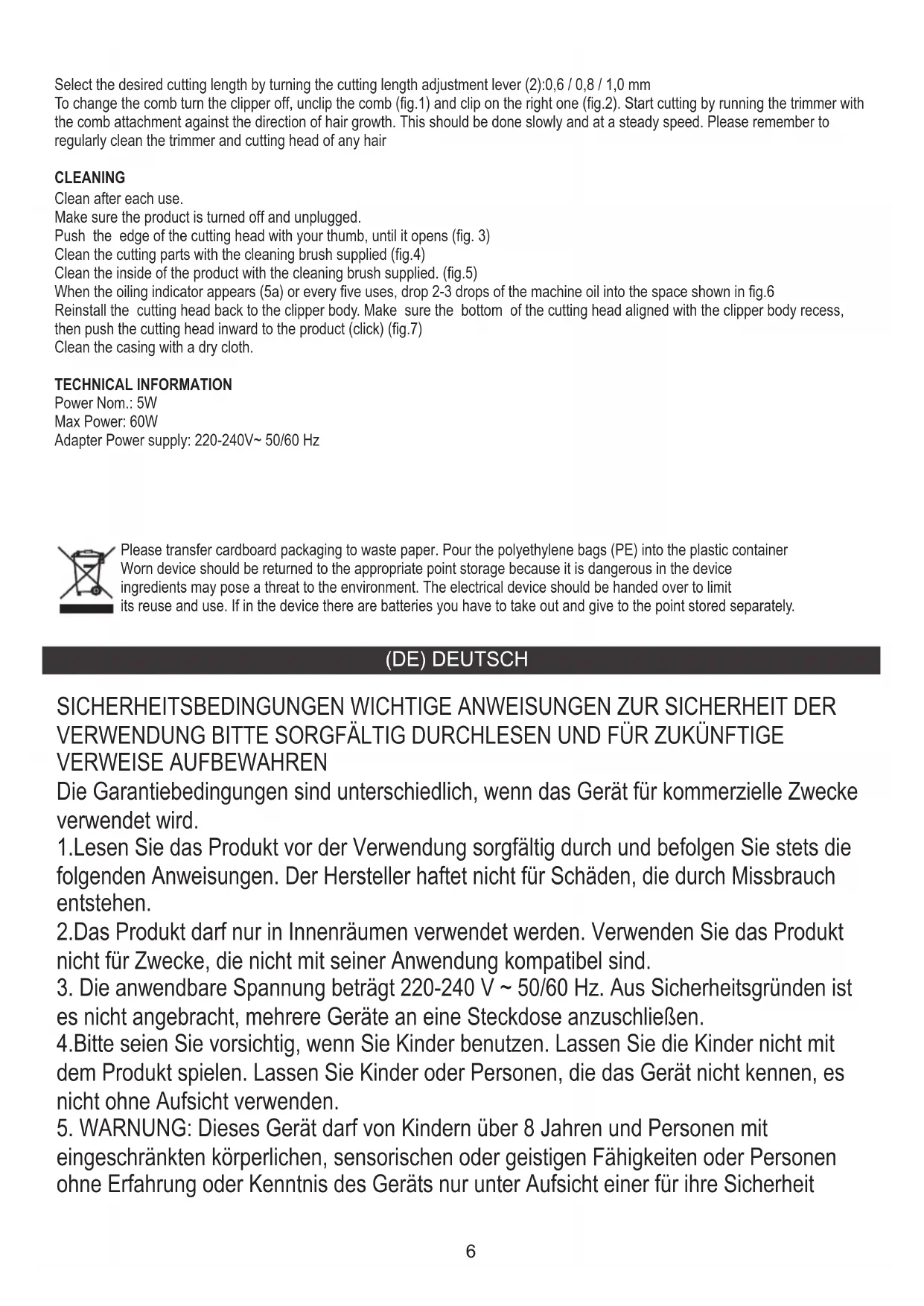 Setzen Sie das Produkt niemals atmosphärischen Bedingungen wie direktem Sonnenlicht oder Regen usw. aus. Verwenden Sie das Produkt niemals unter feuchten Bedingungen. 6.Nachdem Sie das Produkt nicht mehr verwenden, denken Sie immer daran, den Stecker vorsichtig aus der Steckdose zu ziehen und die Steckdose mit der Hand zu halten. Niemals am Netzkabel ziehen !!! verantwortlichen Person verwendet werden wenn sie in die sichere Verwendung des Geräts eingewiesen wurden und sich der mit dem Betrieb verbundenen Gefahren bewusst sind. Kinder sollten nicht mit dem Gerät spielen. Die Reinigung und Wartung des Geräts sollte nicht von Kindern durchgeführt werden, es sei denn, sie sind älter als 8 Jahre und diese Aktivitäten werden unter Aufsicht durchgeführt.8 Wenn die Ölanzeige zu blinken beginnt (5a) oder alle fünf Anwendungen, lassen Sie 2-3 Tropfen Maschinenöl in den in Abb. 6 Reinigen Sie das Innere des Produkts mit der mitgelieferten Reinigungsbürste. (Abb.5) Reinigen Sie die Schneidteile mit der mitgelieferten Reinigungsbürste (Abb.4). Drücken Sie mit dem Daumen auf die Kante des Schneidkopfes, bis er sich öffnet (Abb. 3). Stellen Sie sicher, dass das Produkt ausgeschaltet und vom Stromnetz getrennt ist. Nach jedem Gebrauch reinigen. REINIGUNG Um den Kamm zu wechseln, schalten Sie den Haarschneider aus, lösen Sie den Kamm (Abb. 1) und befestigen Sie den rechten (Abb. 2). Beginnen Sie mit dem Schneiden, indem Sie den Trimmer mit dem Kammaufsatz gegen die Haarwuchsrichtung laufen lassen. Dies sollte langsam und mit gleichmäßiger Geschwindigkeit erfolgen. Bitte denken Sie daran, den Trimmer und den Schneidkopf regelmäßig von allen Haaren zu reinigen Wählen Sie die gewünschte Schnittlänge durch Drehen des Einstellhebels für die Schnittlänge (2): 0,6 / 0,8 / 1,0 mm