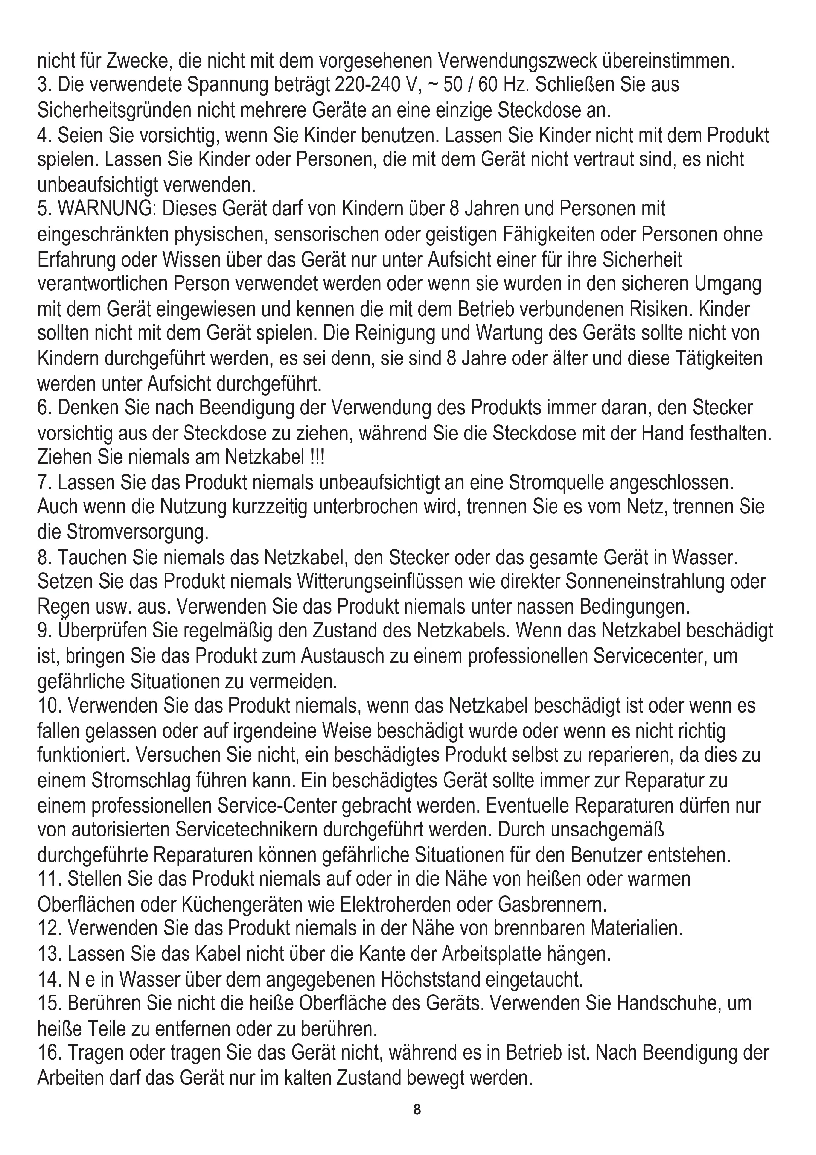 8. Tauchen Sie niemals das Netzkabel, den Stecker oder das gesamte Gerät in Wasser.
