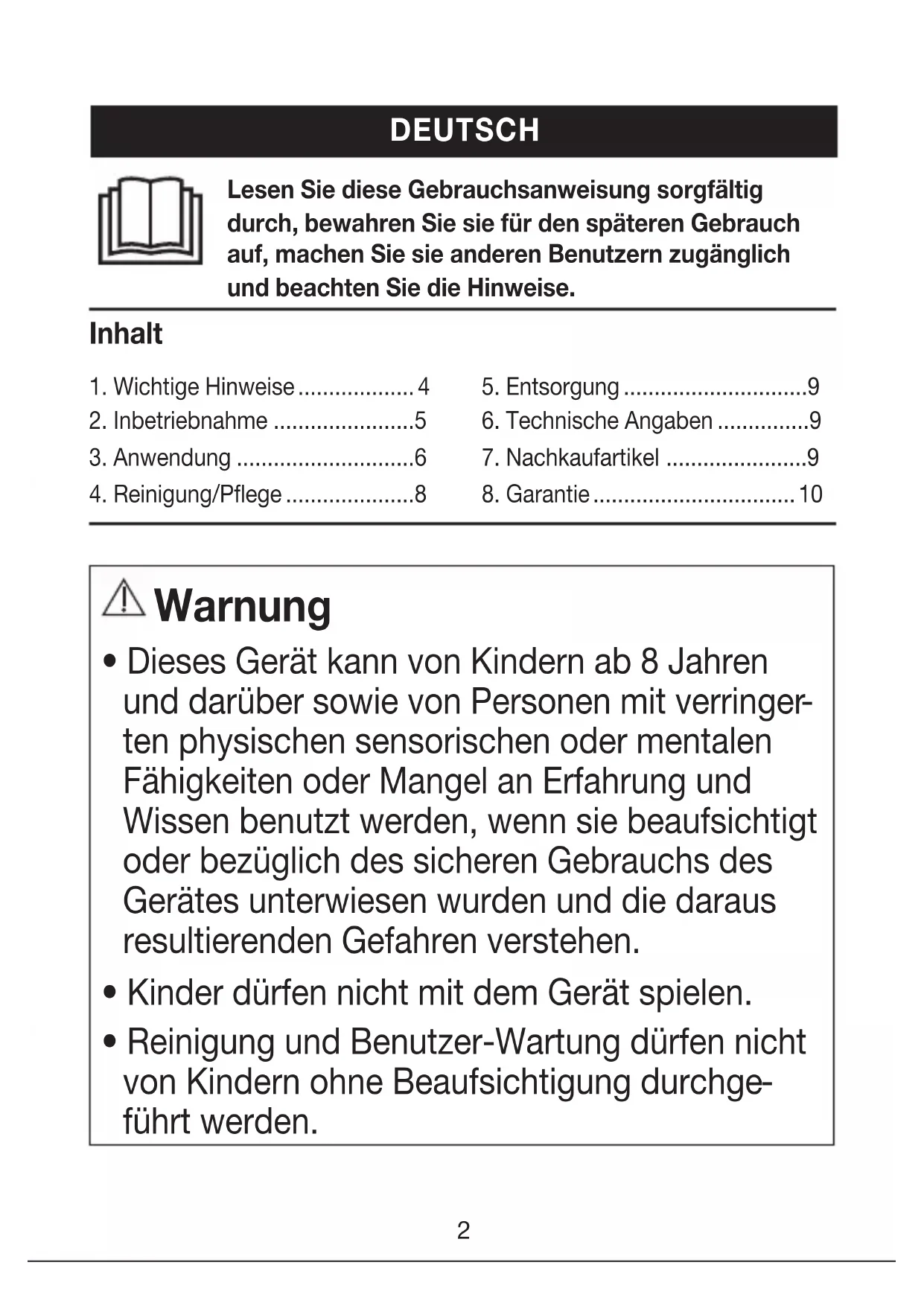 Ziehen Sie immer vor der Reinigung das Netzteil aus der Steckdose! – Das Gerät mit einem leicht angefeuchteten Tuch reinigen. Bei stärkerer Verschmutzung können Sie das Tuch auch mit einer leichten Seifenlauge befeuchten. – Die Aufsätze können bei Bedarf aus hygienischen Gründen mit einem mit Alkohol angefeuchteten Tuch bzw. Bürste gereinigt werden. Danach bitte sorgfältig trocknen. – Das Gerät nicht fallen lassen. – Achten Sie bitte darauf, dass kein Wasser in das Gerät eindringt. Falls dies doch einmal der Fall sein sollte, dann verwenden Sie bitte das Gerät erst dann wieder, wenn es völlig trocken ist. – Zum Reinigen keine chemischen Reiniger oder Scheuermittel benutzen. – Gerät und Steckernetzteil keinesfalls in Wasser oder andere Flüssigkeiten tauchen.9