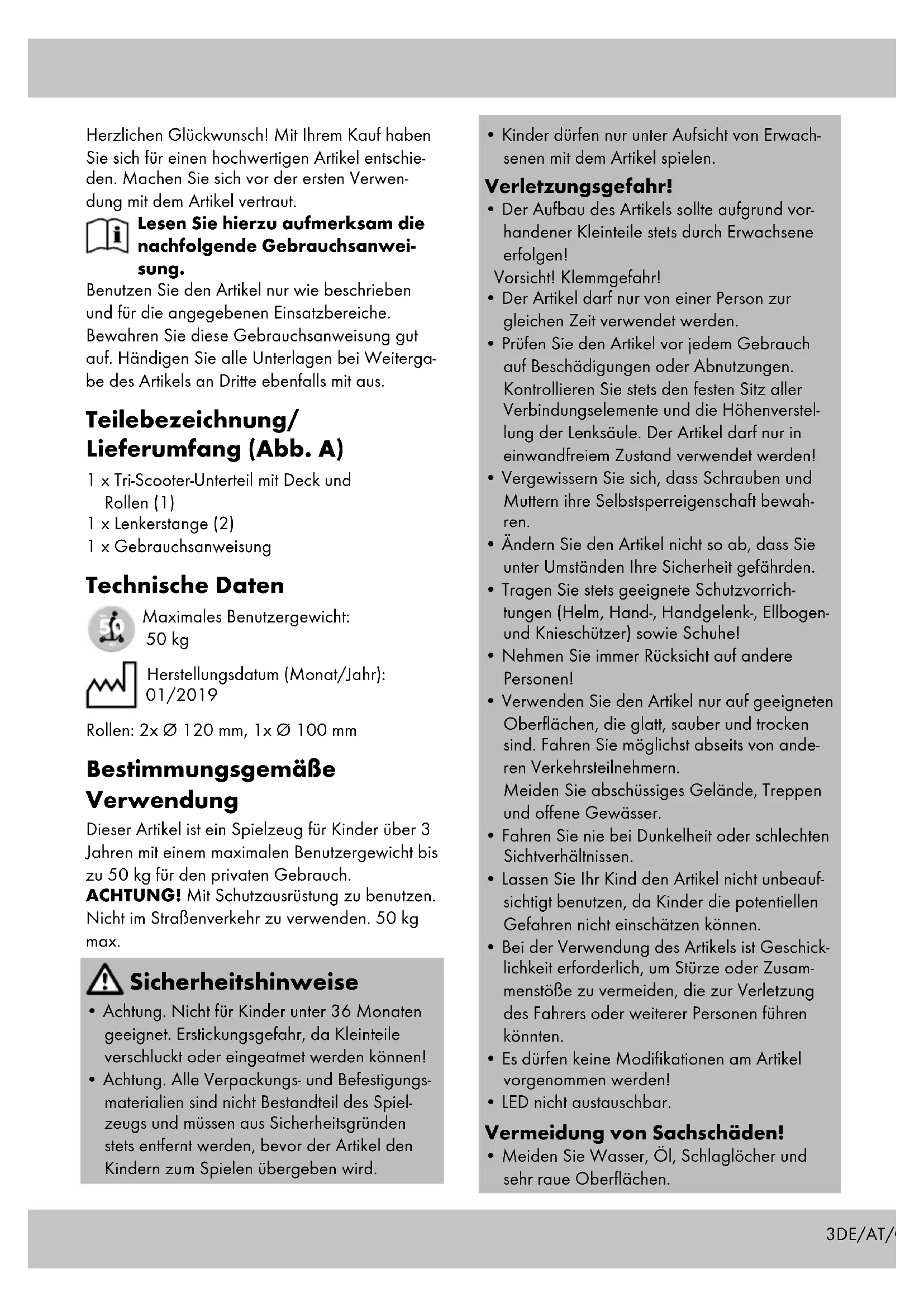 C3DE/AT/CH Herzlichen Glückwunsch! Mit Ihrem Kauf haben Sie sich für einen hochwertigen Artikel entschie- den. Machen Sie sich vor der ersten Verwen- dung mit dem Artikel vertraut. Lesen Sie hierzu aufmerksam die nachfolgende Gebrauchsanwei- sung. Benutzen Sie den Artikel nur wie beschrieben und für die angegebenen Einsatzbereiche. Bewahren Sie diese Gebrauchsanweisung gut auf. Händigen Sie alle Unterlagen bei Weiterga- be des Artikels an Dritte ebenfalls mit aus. Teilebezeichnung/ Lieferumfang (Abb. A) 1 x Tri-Scooter-Unterteil mit Deck und Rollen (1) 1 x Lenkerstange (2) 1 x Gebrauchsanweisung Technische Daten Maximales Benutzergewicht: 50 kg Herstellungsdatum (Monat/Jahr): 01/2019 Rollen: 2x Ø 120 mm, 1x Ø 100 mm Bestimmungsgemäße Verwendung Dieser Artikel ist ein Spielzeug für Kinder über 3 Jahren mit einem maximalen Benutzergewicht bis zu 50 kg für den privaten Gebrauch. ACHTUNG! Mit Schutzausrüstung zu benutzen. Nicht im Straßenverkehr zu verwenden. 50 kg max. Sicherheitshinweise