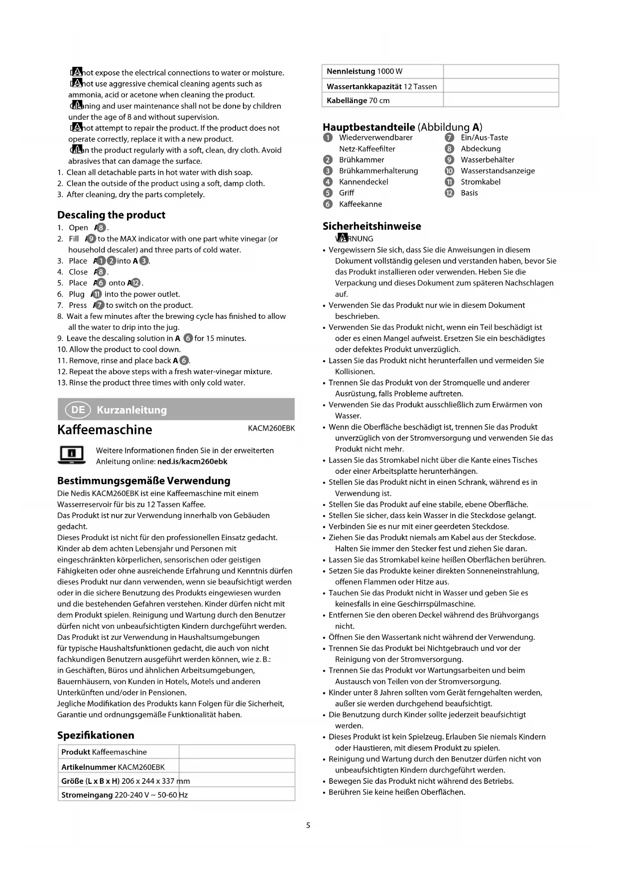 Kurzanleitung Kaeemaschine KACM260EBKWeitere Informationen nden Sie in der erweiterten Anleitung online: ned.is/kacm260ebk Bestimmungsgemäße Verwendung Die Nedis KACM260EBK ist eine Kaeemaschine mit einem Wasserreservoir für bis zu 12 Tassen Kaee.Das Produkt ist nur zur Verwendung innerhalb von Gebäuden gedacht.Dieses Produkt ist nicht für den professionellen Einsatz gedacht.Kinder ab dem achten Lebensjahr und Personen mit eingeschränkten körperlichen, sensorischen oder geistigen Fähigkeiten oder ohne ausreichende Erfahrung und Kenntnis dürfen dieses Produkt nur dann verwenden, wenn sie beaufsichtigt werden oder in die sichere Benutzung des Produkts eingewiesen wurden und die bestehenden Gefahren verstehen. Kinder dürfen nicht mit dem Produkt spielen. Reinigung und Wartung durch den Benutzer dürfen nicht von unbeaufsichtigten Kindern durchgeführt werden.Das Produkt ist zur Verwendung in Haushaltsumgebungen für typische Haushaltsfunktionen gedacht, die auch von nicht fachkundigen Benutzern ausgeführt werden können, wie z.B.: in Geschäften, Büros und ähnlichen Arbeitsumgebungen, Bauernhäusern, von Kunden in Hotels, Motels und anderen Unterkünften und/oder in Pensionen.Jegliche Modikation des Produkts kann Folgen für die Sicherheit, Garantie und ordnungsgemäße Funktionalität haben. Spezikationen Produkt KaeemaschineArtikelnummer KACM260EBKGröße (L x B x H) 206 x 244 x 337 mmStromeingang 220-240 V ~ 50-60 HzNennleistung 1000 WWassertankkapazität 12 TassenKabellänge 70 cm Hauptbestandteile (Abbildung A) 1 Wiederverwendbarer Netz-Kaeelter 2 Brühkammer 3 Brühkammerhalterung 4 Kannendeckel 5 Gri 6 Kaeekanne 7 Ein/Aus-Taste 8 Abdeckung 9 Wasserbehälter q Wasserstandsanzeige w Stromkabel e Basis Sicherheitshinweise