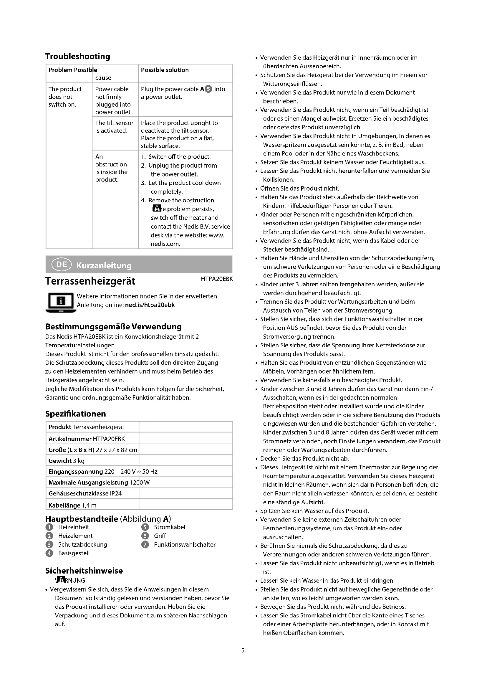 Kurzanleitung Terrassenheizgerät HTPA20EBKWeitere Informationen nden Sie in der erweiterten Anleitung online: ned.is/htpa20ebk Bestimmungsgemäße Verwendung Das Nedis HTPA20EBK ist ein Konvektionsheizgerät mit 2 Temperatureinstellungen.Dieses Produkt ist nicht für den professionellen Einsatz gedacht.Die Schutzabdeckung dieses Produkts soll den direkten Zugang zu den Heizelementen verhindern und muss beim Betrieb des Heizgerätes angebracht sein.Jegliche Modikation des Produkts kann Folgen für die Sicherheit, Garantie und ordnungsgemäße Funktionalität haben. Spezikationen Produkt TerrassenheizgerätArtikelnummer HTPA20EBKGröße (L x B x H) 27 x 27 x 82 cmGewicht 3 kgEingangsspannung 220 – 240 V ~ 50 HzMaximale Ausgangsleistung 1200 WGehäuseschutzklasse IP24Kabellänge 1,4 m Hauptbestandteile (Abbildung A) 1 Heizeinheit 2 Heizelement 3 Schutzabdeckung 4 Basisgestell 5 Stromkabel 6 Gri 7 Funktionswahlschalter Sicherheitshinweise