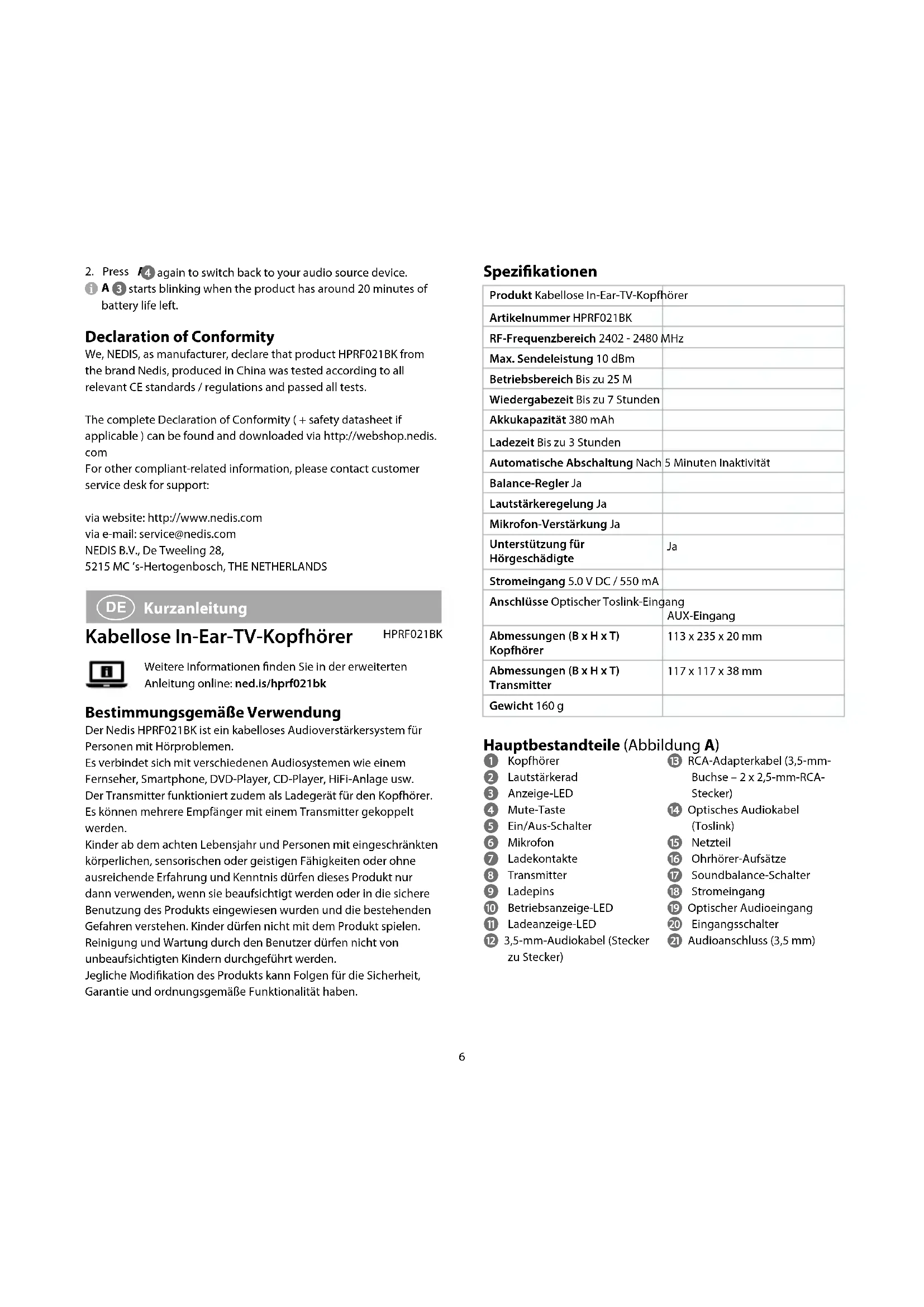 into your audio source device (e.g. TV or Hi-Fi system).6 Spezikationen Produkt Kabellose In-Ear-TV-KopfhörerArtikelnummer HPRF021BKRF-Frequenzbereich 2402 - 2480 MHzMax. Sendeleistung 10 dBmBetriebsbereich Bis zu 25 MWiedergabezeit Bis zu 7 StundenAkkukapazität 380 mAhLadezeit Bis zu 3 StundenAutomatische Abschaltung Nach 5 Minuten InaktivitätBalance-Regler JaLautstärkeregelung JaMikrofon-Verstärkung JaUnterstützung für Hörgeschädigte Stromeingang 5.0 V DC / 550 mAAnschlüsse Optischer Toslink-EingangAUX-EingangAbmessungen (B x H x T) Kopfhörer113 x 235 x 20 mmAbmessungen (B x H x T) Transmitter117 x 117 x 38 mmGewicht 160 g Hauptbestandteile (Abbildung A) 1 Kopfhörer 2 Lautstärkerad 3 Anzeige-LED 4 Mute-Taste 5 Ein/Aus-Schalter 6 Mikrofon 7 Ladekontakte 8 Transmitter 9 Ladepins q Betriebsanzeige-LED w Ladeanzeige-LED e 3,5-mm-Audiokabel (Stecker zu Stecker) r RCA-Adapterkabel (3,5-mm- Buchse – 2 x 2,5-mm-RCA-Stecker) t Optisches Audiokabel (Toslink) y Netzteil u Ohrhörer-Aufsätze i Soundbalance-Schalter o Stromeingang p Optischer Audioeingang a Eingangsschalter s Audioanschluss (3,5 mm)