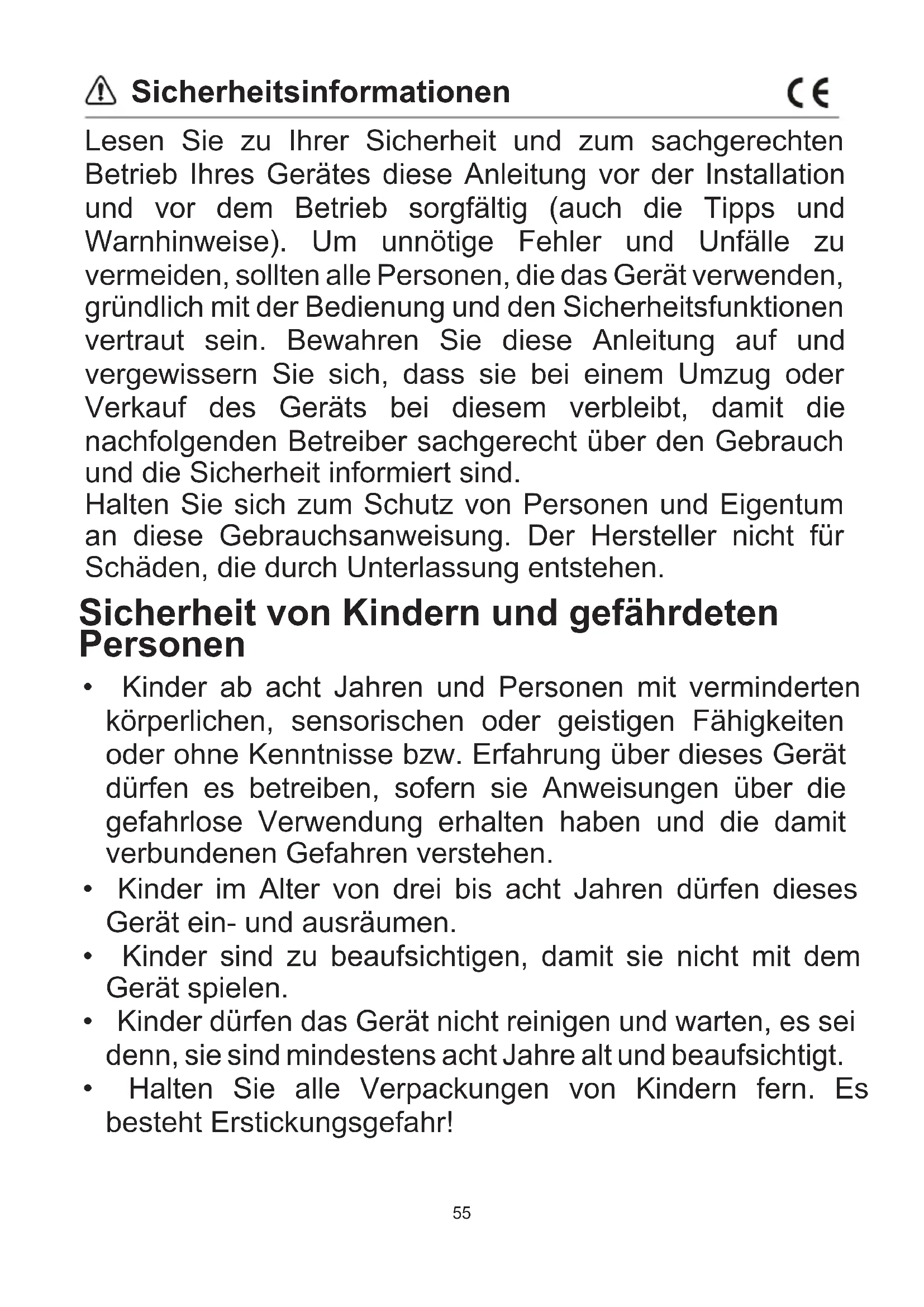 - Halten Sie alle Verpackungen von Kindern fern. Es besteht Erstickungsgefahr! Lesen Sie zu Ihrer Sicherheit und zum sachgerechten Betrieb Ihres Gerätes diese Anleitung vor der Installation und vor dem Betrieb sorgfältig (auch die Tipps und Warnhinweise). Um unnötige Fehler und Unfälle zu vermeiden, sollten alle Personen, die das Gerät verwenden, gründlich mit der Bedienung und den Sicherheitsfunktionen vertraut sein. Bewahren Sie diese Anleitung auf und vergewissern Sie sich, dass sie bei einem Umzug oder Verkauf des Geräts bei diesem verbleibt, damit die nachfolgenden Betreiber sachgerecht über den Gebrauch und die Sicherheit informiert sind. Halten Sie sich zum Schutz von Personen und Eigentum an diese Gebrauchsanweisung. Der Hersteller nicht für Schäden, die durch Unterlassung entstehen.56 Sicherheitsinformationen