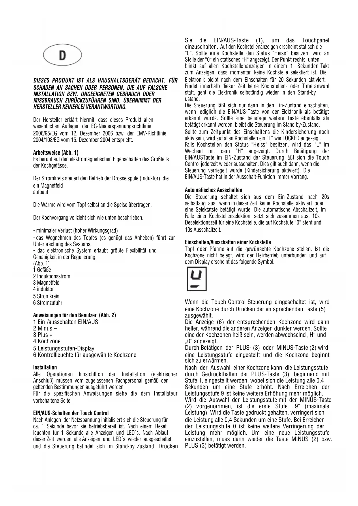 MISSBRAUCH ZURÜCKZUFÜHREN SIND, ÜBERNIMMT DER HERSTELLER KEINERLEI VERANTWORTUNG. Der Hersteller erklärt hiermit, dass dieses Produkt allen wesentlichen Auflagen der EG-Niederspannungsrichtlinie 2006/95/EG vom 12. Dezember 2006 bzw. der EMV-Richtlinie 2004/108/EG vom 15. Dezember 2004 entspricht. Arbeitsweise (Abb. 1) Es beruht auf den elektromagnetischen Eigenschaften des Großteils der Kochgefässe. Der Stromkreis steuert den Betrieb der Drosselspule (Induktor), die ein Magnetfeld aufbaut. Die Wärme wird vom Topf selbst an die Speise übertragen. Der Kochvorgang vollzieht sich wie unten beschrieben. - minimaler Verlust (hoher Wirkungsgrad) - das Wegnehmen des Topfes (es genügt das Anheben) führt zur Unterbrechung des Systems. - das elektronische System erlaubt größte Flexibilität und Genauigkeit in der Regulierung. (Abb. 1) 1 Gefäße 2 Induktionsstrom 3 Magnetfeld 4 induktor 5 Stromkreis 6 Stromzufuhr Anweisungen für den Benutzer (Abb. 2) 1 Ein-/ausschalten EIN/AUS 2 Minus – 3 Plus + 4 Kochzone 5 Leistungsstufen-Display 6 Kontrollleuchte für ausgewählte Kochzone Installation Alle Operationen hinsichtlich der Installation (elektrischer Anschluß) müssen vom zugelassenen Fachpersonal gemäß den geltenden Bestimmungen ausgeführt werden. Für die spezifischen Anweisungen siehe die dem Installateur vorbehaltene Seite. EIN/AUS-Schalten der Touch Control Nach Anlegen der Netzspannung initialisiert sich die Steuerung für ca. 1 Sekunde bevor sie betriebsbereit ist. Nach einem Reset leuchten für 1 Sekunde alle Anzeigen und LED´s. Nach Ablauf dieser Zeit werden alle Anzeigen und LED´s wieder ausgeschaltet, und die Steuerung befindet sich im Stand-by Zustand. Drücken Sie die EIN/AUS-Taste (1), um das Touchpanel einzuschalten. Auf den Kochstellenanzeigen erscheint statisch die “0“. Sollte eine Kochstelle den Status “Heiss“ besitzen, wird an Stelle der “0“ ein statisches “H“ angezeigt. Der Punkt rechts unten blinkt auf allen Kochstellenanzeigen in einem 1- Sekunden-Takt zum Anzeigen, dass momentan keine Kochstelle selektiert ist. Die Elektronik bleibt nach dem Einschalten für 20 Sekunden aktiviert. Findet innerhalb dieser Zeit keine Kochstellen- oder Timeranwahl statt, geht die Elektronik selbständig wieder in den Stand-by ustand. Die Steuerung läßt sich nur dann in den Ein-Zustand einschalten, wenn lediglich die EIN/AUS-Taste von der Elektronik als betätigt erkannt wurde. Sollte eine beliebige weitere Taste ebenfalls als betätigt erkannt werden, bleibt die Steuerung im Stand by-Zustand. Sollte zum Zeitpunkt des Einschaltens die Kindersicherung noch aktiv sein, wird auf allen Kochstellen ein “L“ wie LOCKED angezeigt. Falls Kochstellen den Status “Heiss“ besitzen, wird das “L“ im Wechsel mit dem “H“ angezeigt. Durch Betätigung der EIN/AUSTaste im EIN-Zustand der Steuerung läßt sich die Touch Control jederzeit wieder ausschalten. Dies gilt auch dann, wenn die Steuerung verriegelt wurde (Kindersicherung aktiviert). Die EIN/AUS-Taste hat in der Ausschalt-Funktion immer Vorrang. Automatisches Ausschalten Die Steuerung schaltet sich aus dem Ein-Zustand nach 20s selbsttätig aus, wenn in dieser Zeit keine Kochstelle aktiviert oder eine Selektatste betätigt wurde. Die automatische Abschaltzeit, im Falle einer Kochstellenselektion, setzt sich zusammen aus, 10s Deselektionszeit für eine Kochstelle, die auf Kochstufe “0“ steht und 10s Ausschaltzeit. Einschalten/Ausschalten einer Kochstelle Topf oder Pfanne auf die gewünschte Kochzone stellen. Ist die Kochzone nicht belegt, wird der Heizbetrieb unterbunden und auf dem Display erscheint das folgende Symbol.