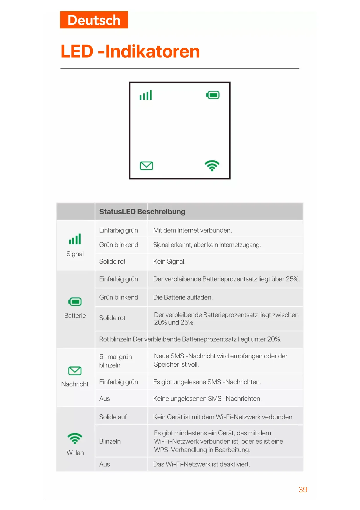 LED -Indikatoren StatusLED Beschreibung Einfarbig grün Grün blinkend Solide rot Mit dem Internet verbunden. Signal erkannt, aber kein Internetzugang. Kein Signal. Einfarbig grün Grün blinkend Solide rot Der verbleibende Batterieprozentsatz liegt über 25%. Die Batterie aufladen. 5 -mal grün blinzeln Einfarbig grün Aus Es gibt ungelesene SMS -Nachrichten. Keine ungelesenen SMS -Nachrichten. Solide auf Blinzeln Aus Kein Gerät ist mit dem Wi-Fi-Netzwerk verbunden. Das Wi-Fi-Netzwerk ist deaktiviert. Rot blinzeln Der verbleibende Batterieprozentsatz liegt unter 20%. Signal Batterie Nachricht W-lan Der verbleibende Batterieprozentsatz liegt zwischen 20% und 25%. Neue SMS -Nachricht wird empfangen oder der Speicher ist voll. Es gibt mindestens ein Gerät, das mit dem Wi-Fi-Netzwerk verbunden ist, oder es ist eine WPS-Verhandlung in Bearbeitung.Deutsch