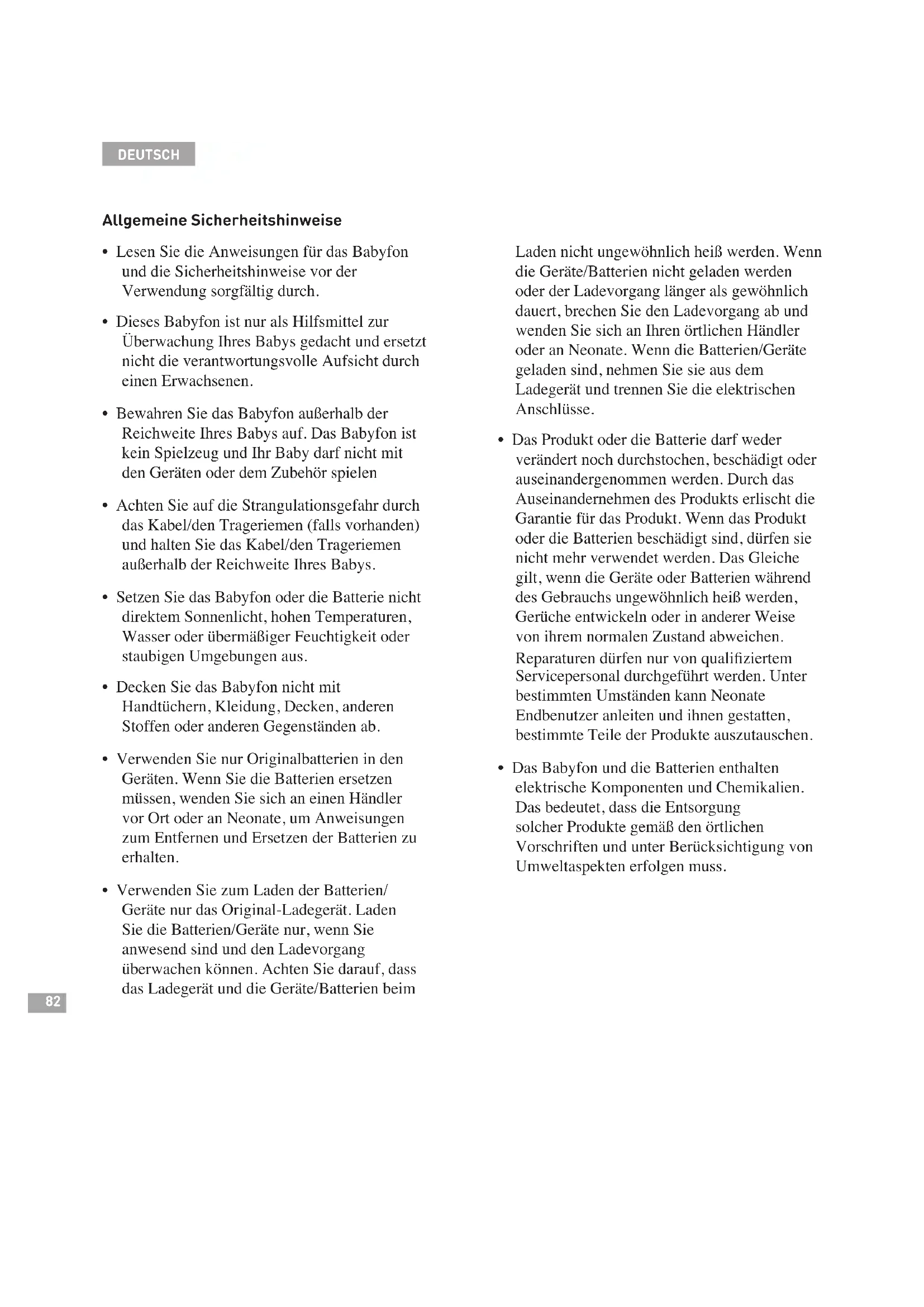 - Das Babyfon und die Batterien enthalten elektrische Komponenten und Chemikalien. Das bedeutet, dass die Entsorgung solcher Produkte gemäß den örtlichen Vorschriften und unter Berücksichtigung von Umweltaspekten erfolgen muss.83 Warnung! Die Batterien brauchen Aufmerksamkeit. Wenn Sie eine Batterie laden, besteht immer die Gefahr eines Kurzschlusses und eine Fabrikationsfehler kann dazu führen, dass die Batterie überhitzt oder Feuer fängt. Wir raten daher dringend, dass Sie die Batterien niemals unbeaufsichtigt laden. Warnung!