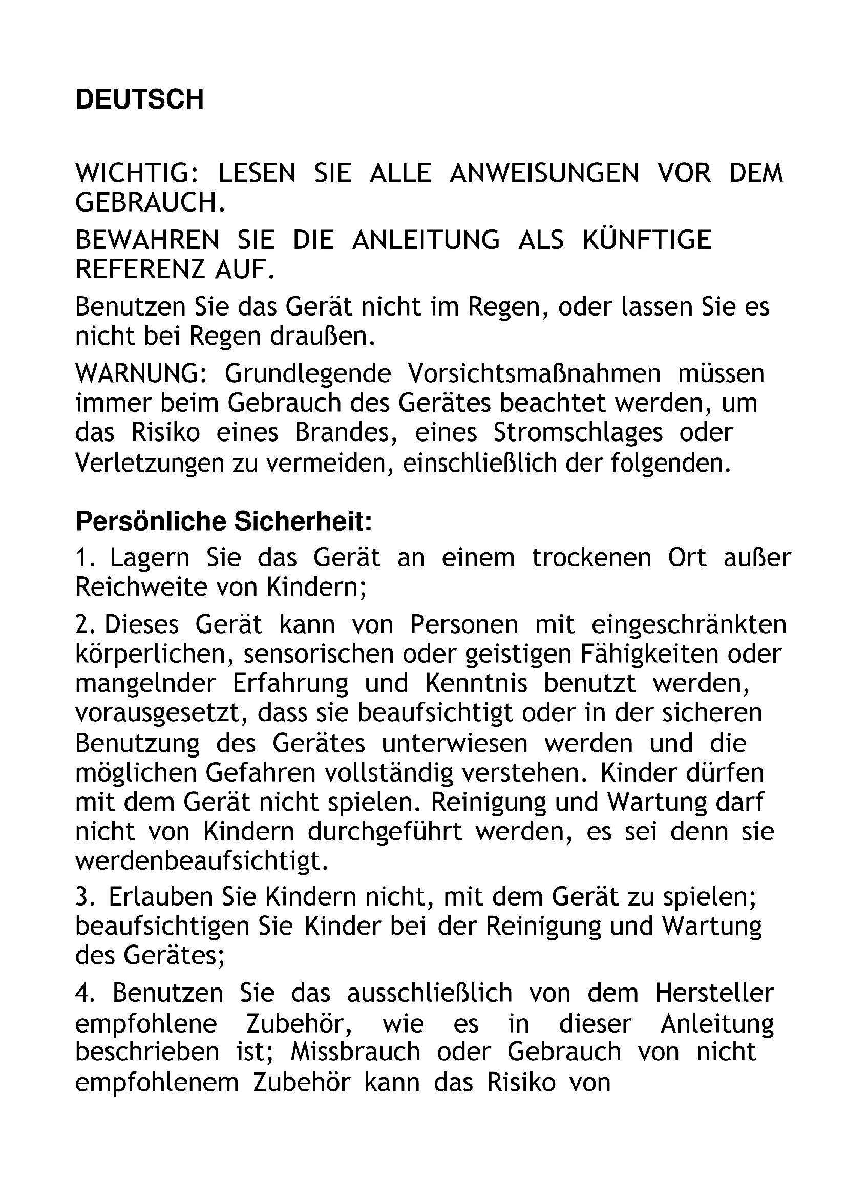 Dieses Gerät kann von Personen mit eingeschränkten körperlichen, sensorischen oder geistigen Fähigkeiten oder mangelnder Erfahrung und Kenntnis benutzt werden, vorausgesetzt, dass sie beaufsichtigt oder in der sicheren Benutzung des Gerätes unterwiesen werden und die möglichen Gefahren vollständig verstehen. Kinder dürfen mit dem Gerät nicht spielen. Reinigung und Wartung darf nicht von Kindern durchgeführt werden, es sei denn sie werden beaufsichtigt.