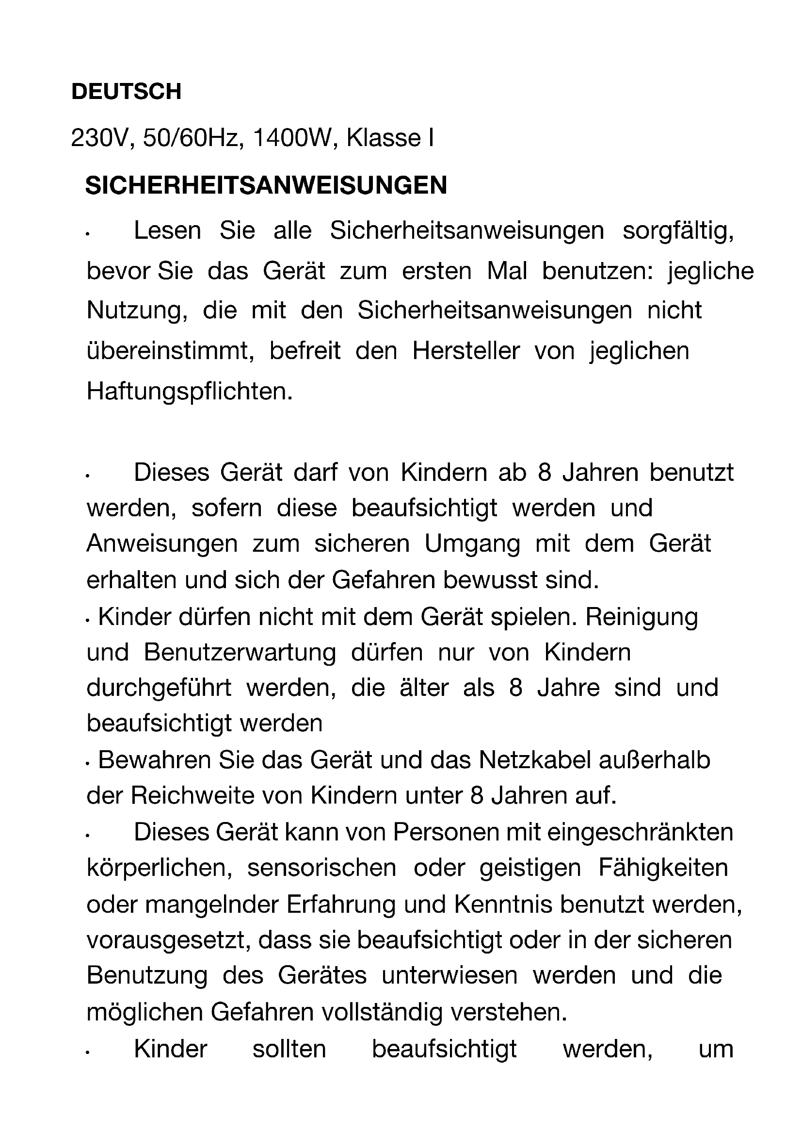 - Tauchen Sie das Gerät oder den Stecker nicht in Wasser oder andere Flüssigkeiten. Es besteht Lebensgefahr wegen eines Stromschlages. Warnung: Die Flächen werden während der Nutzung heiß. Die Seitenflächen und Vorderfläche sind heiß und dürfen nicht berührt werden. Tauchen Sie das Gerät oder den Stecker nicht in Wasser oder andere Flüssigkeiten. Es besteht Lebensgefahr wegen eines Stromschlages! WARNUNG: Dieses elektrische Gerät beinhaltet eine Heizfunktion. DieFlächen, die anderes als die funktionalen Flächen sind, können hohe Temperaturen entwickeln. Da Temperaturen unterschiedlich von verschiedenen Personen wahrgenommen werden, muss dieses Gerät VORSICHTIG benutzt werden. Das Gerät darf ausschließlich an dafür vorgesehenen Griffen und Griffflächen angefasst werden, wobei ein Wärmeschutz wie Handschuhe oder ähnliches benutzt werden muss. Die Flächen, außer der vorgesehenen Griffflächen, müssen genug Zeit zum Abkühlen haben, bevor dieseberührt warden