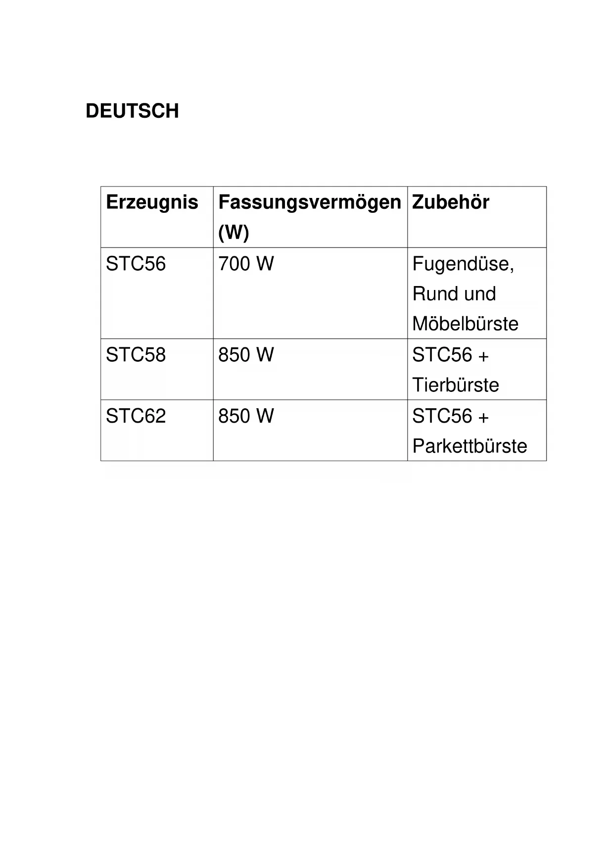 Erzeugnis Fassungsvermögen (W) Zubehör STC56 700 W Fugendüse, Rund und Möbelbürste STC58 850 W STC56 + Tierbürste STC62 850 W STC56 + ParkettbürsteAUFBAU DES PRODUKTES